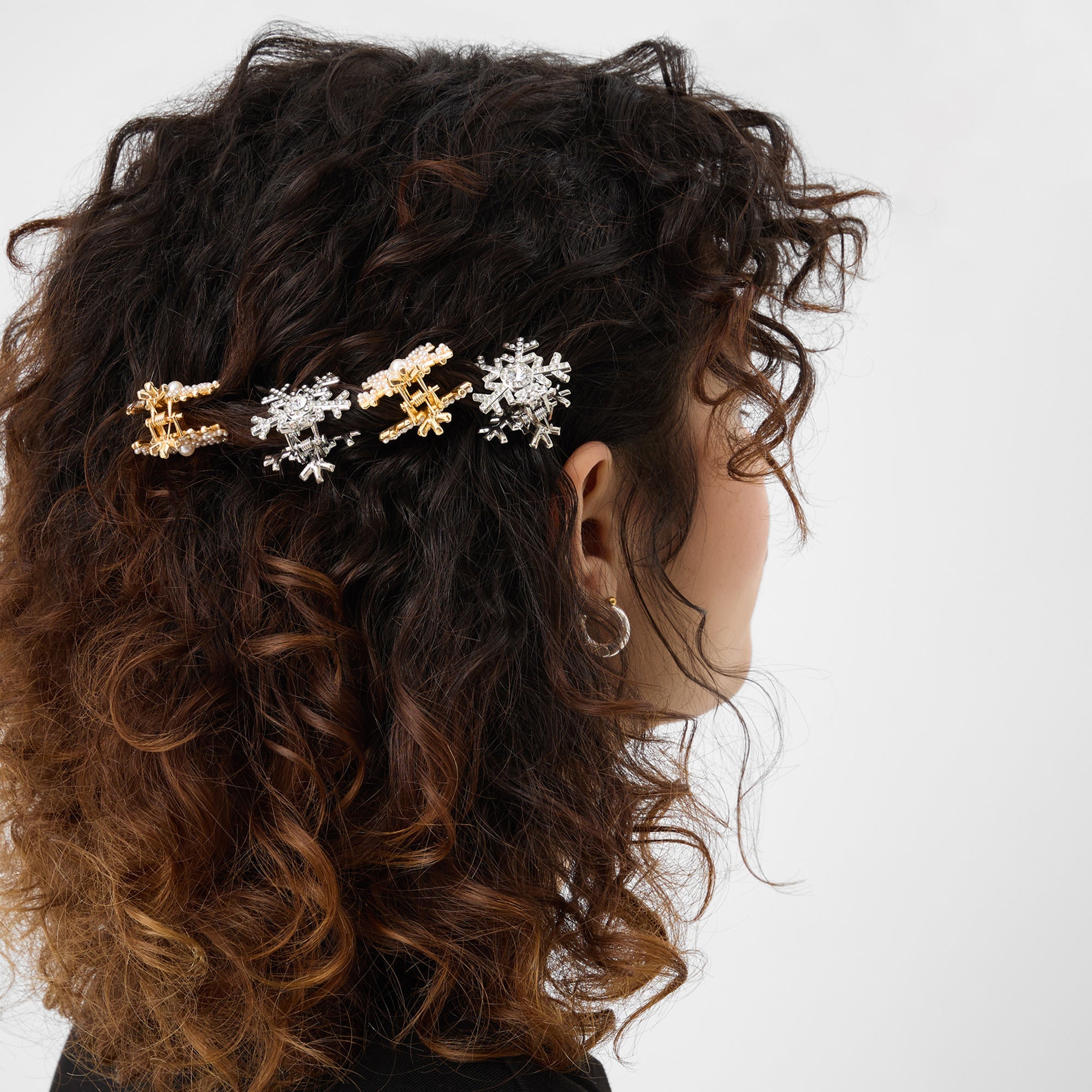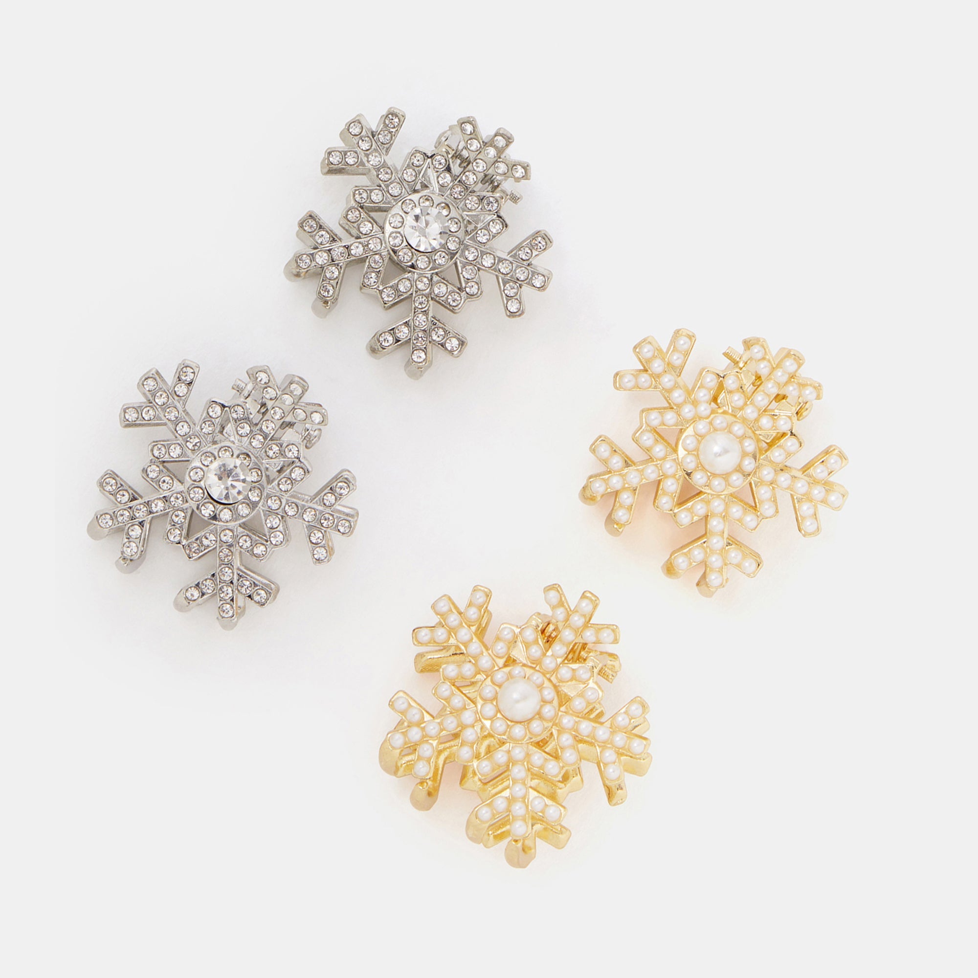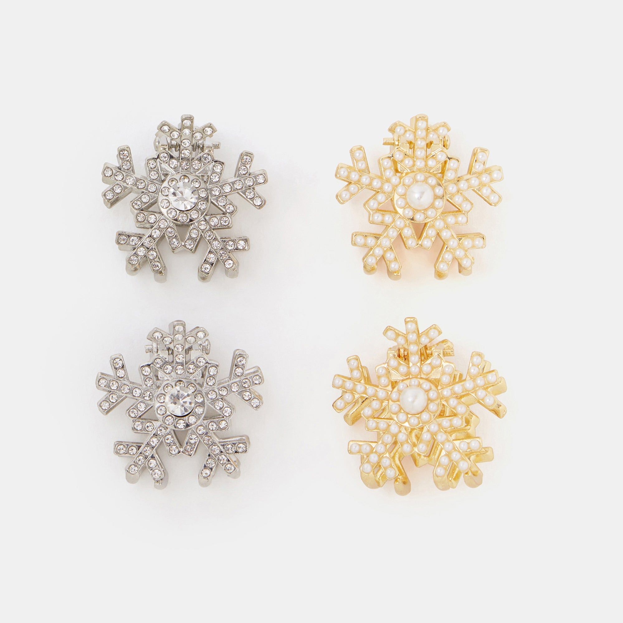 Shaped like a snowflake in silver and gold tone finishes, these miniature claw clips are full of winter wonder. Decorated with diamante and pearl bead embellishments for a touch of sparkle. Four included.