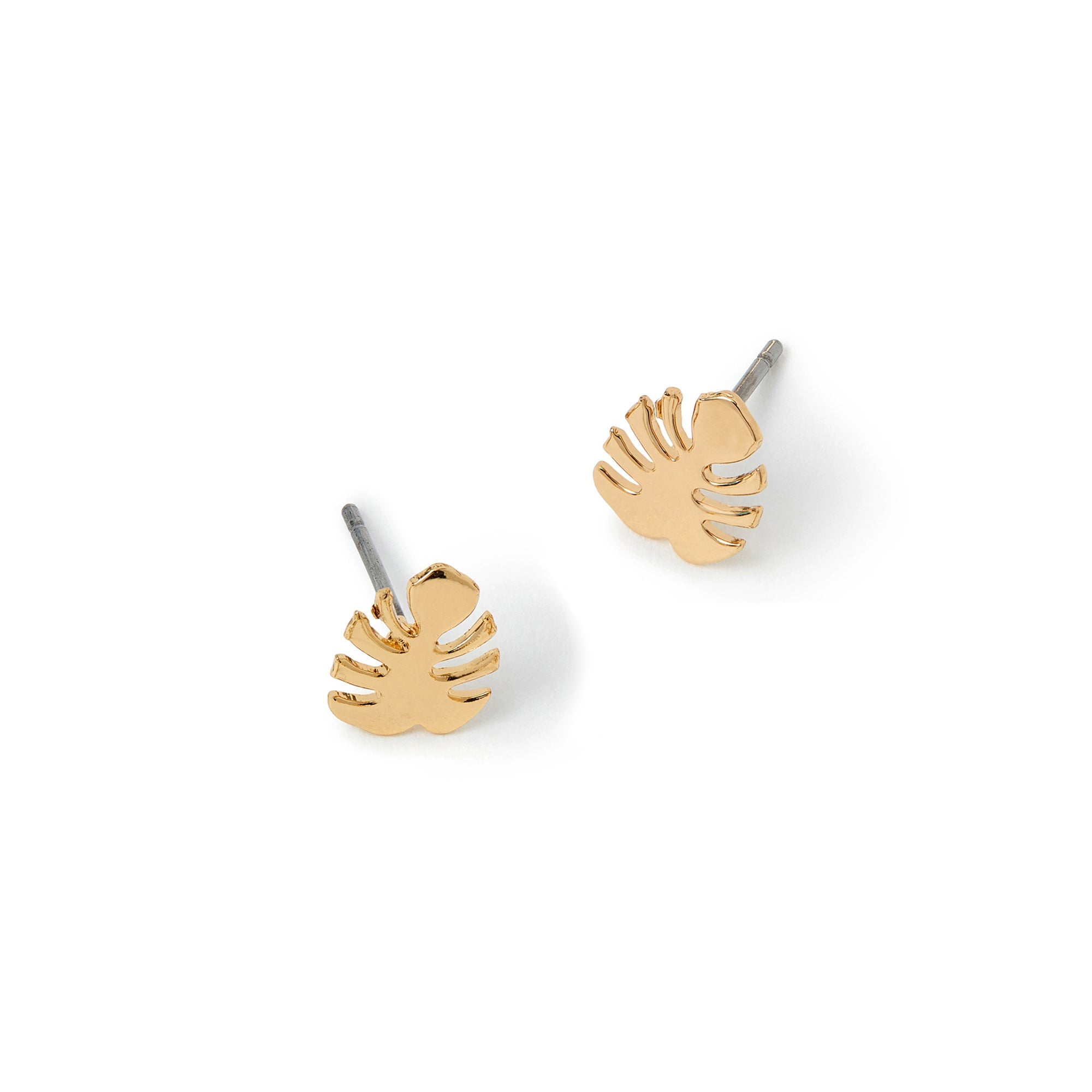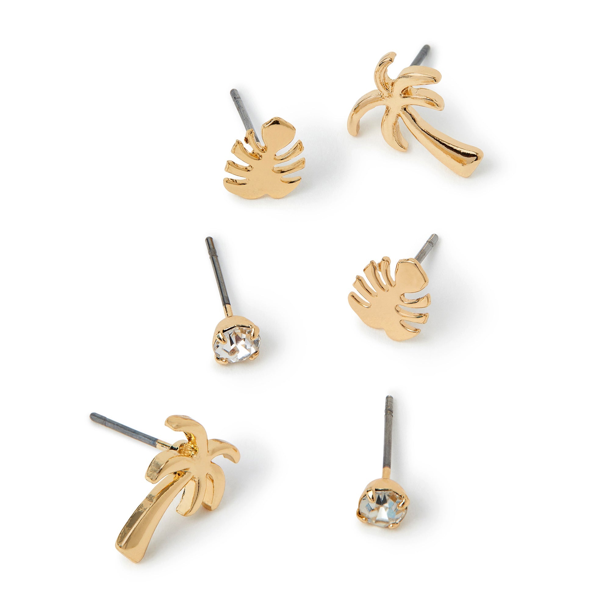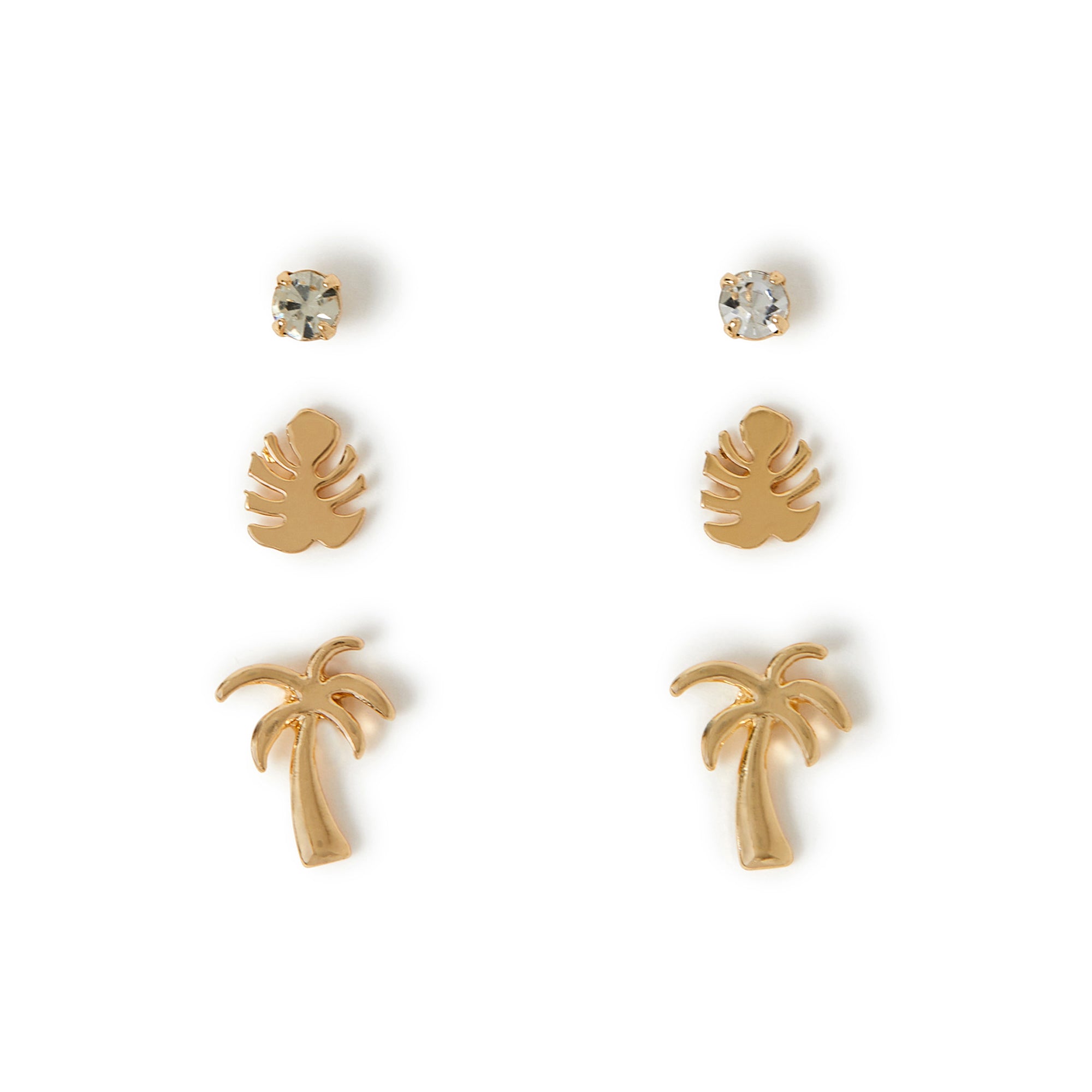 Balmy days are calling with this fun earring set. Crafted in a golden tone, these studs include palm tree, palm leaf, and sparkly diamante designs. Three pairs included.