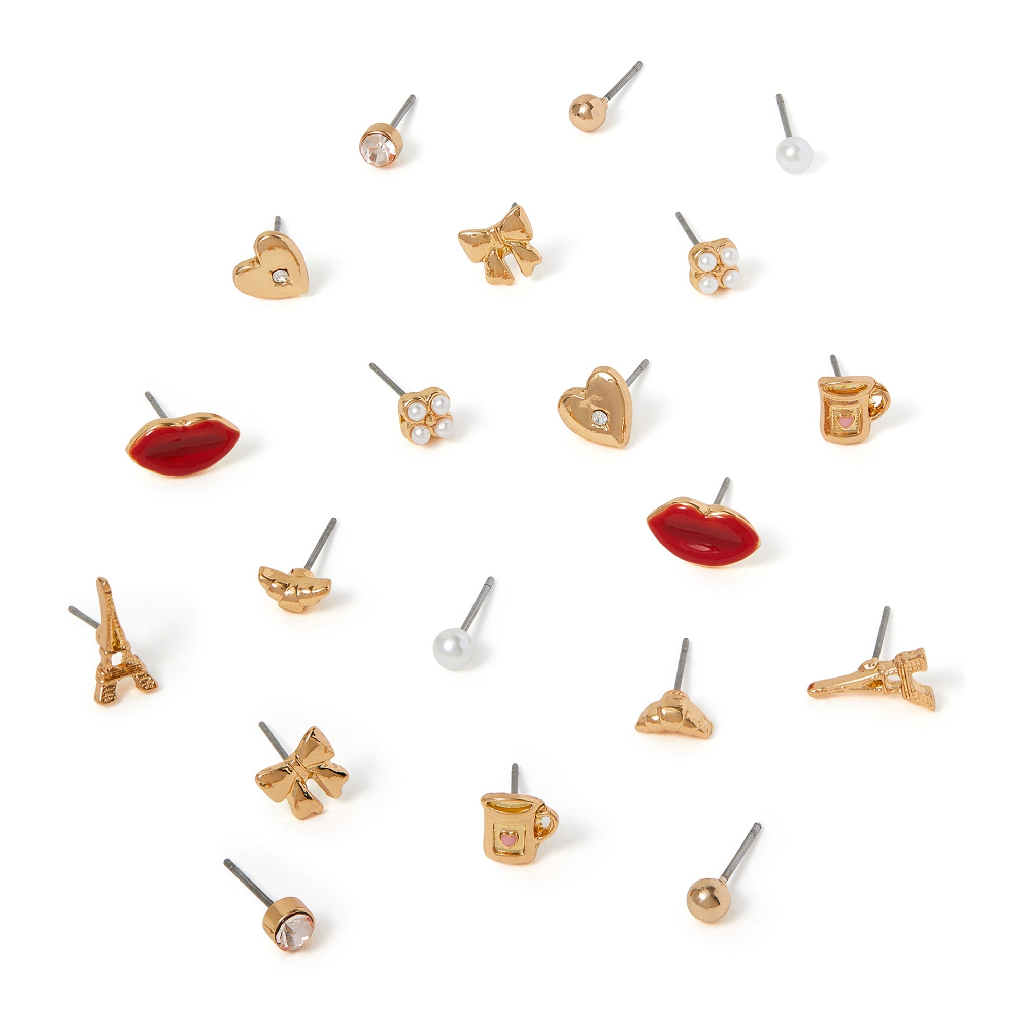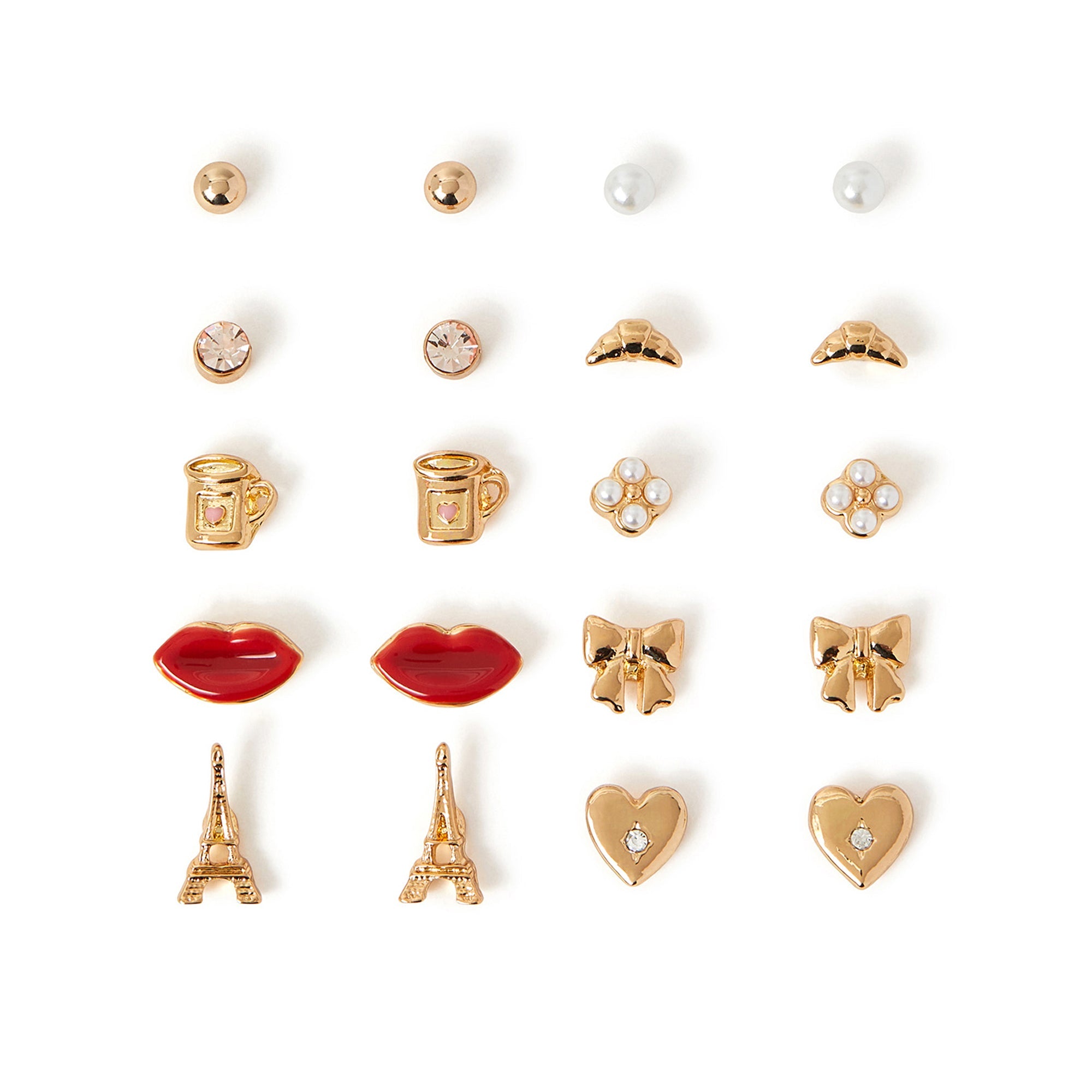 Say Oui to your new favourite accessories! Perfect for wearing in the city of love, these earrings feature designs of the Eiffel Tower, croissants, coffee, hearts and bows with simple diamante and pearl studs to finish.