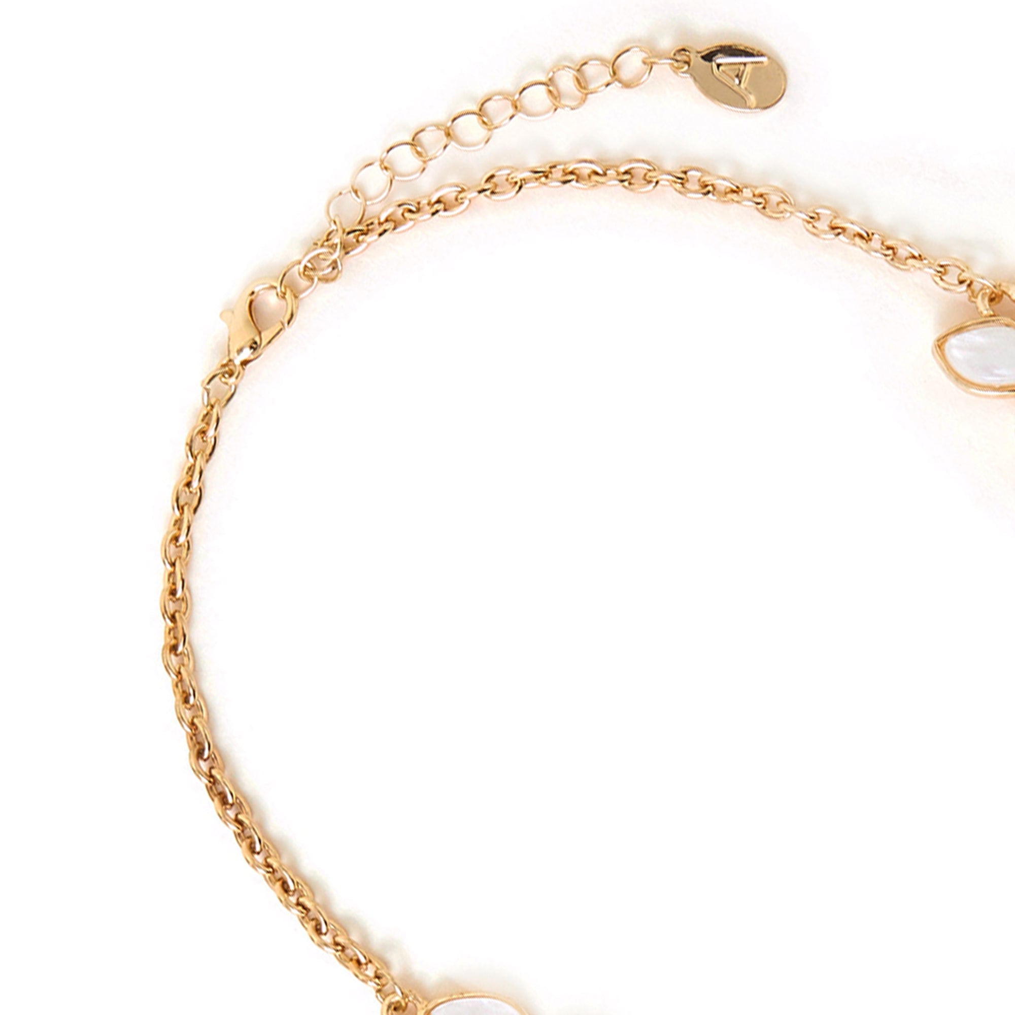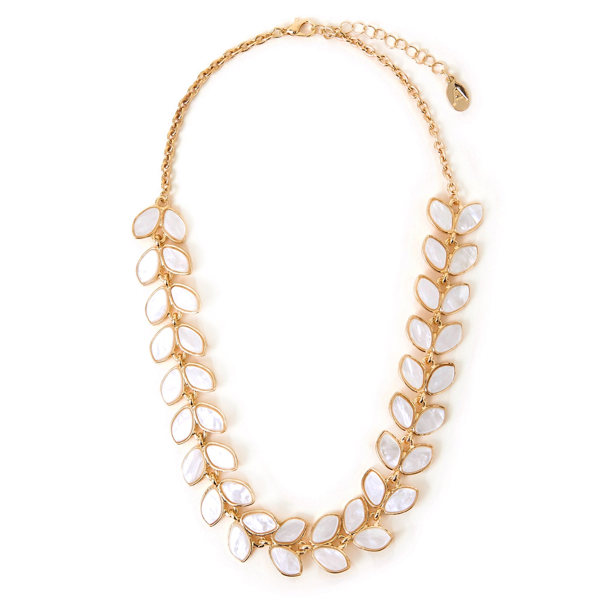 Inspired by Mother Nature, this golden necklace showcases endless leaves with a opulent pearly finish. Complete with a lobster clasp and extender.