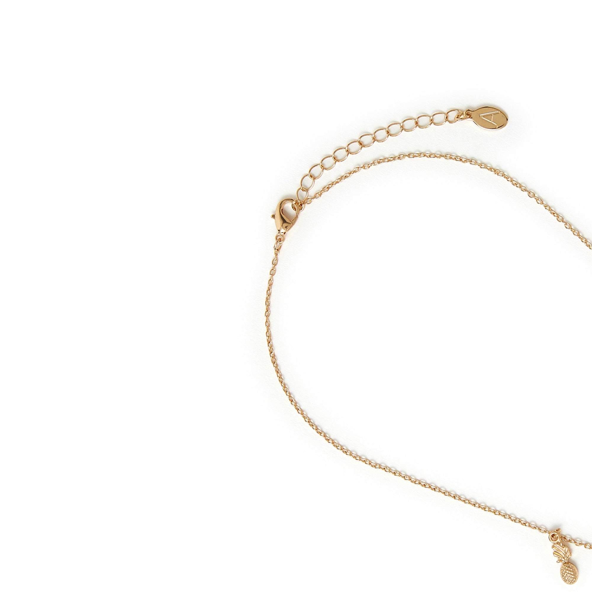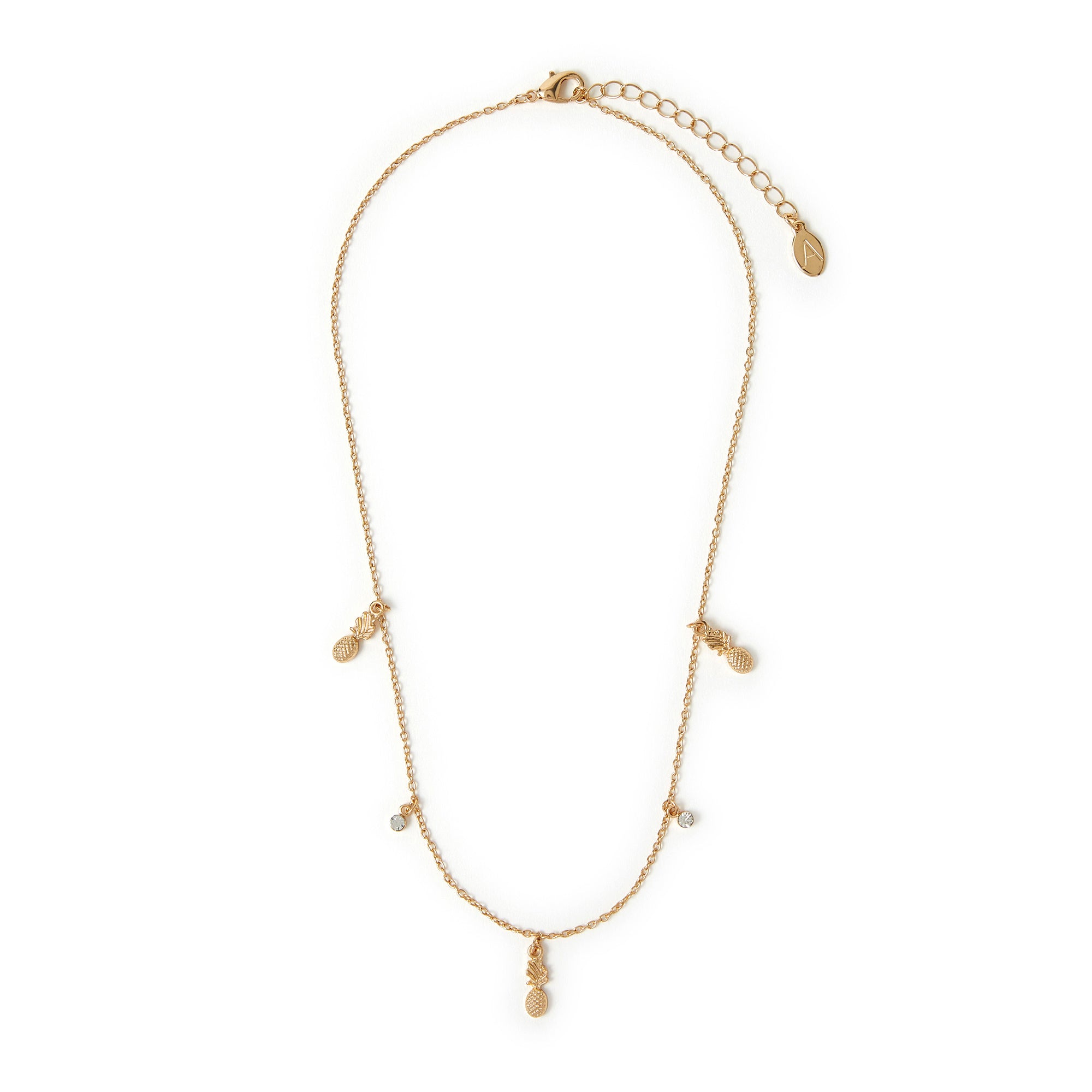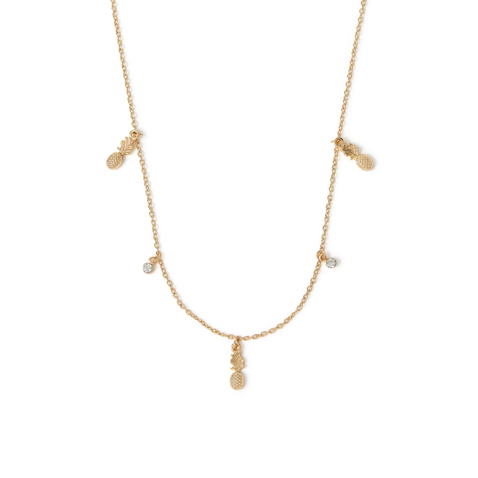 Crafted in a golden tone, this summer-inspired necklace features a classic chain stationed with pineapple pendants and sparkly diamante charms. Complete with a lobster clasp fastening and extender. Matching bracelet available.