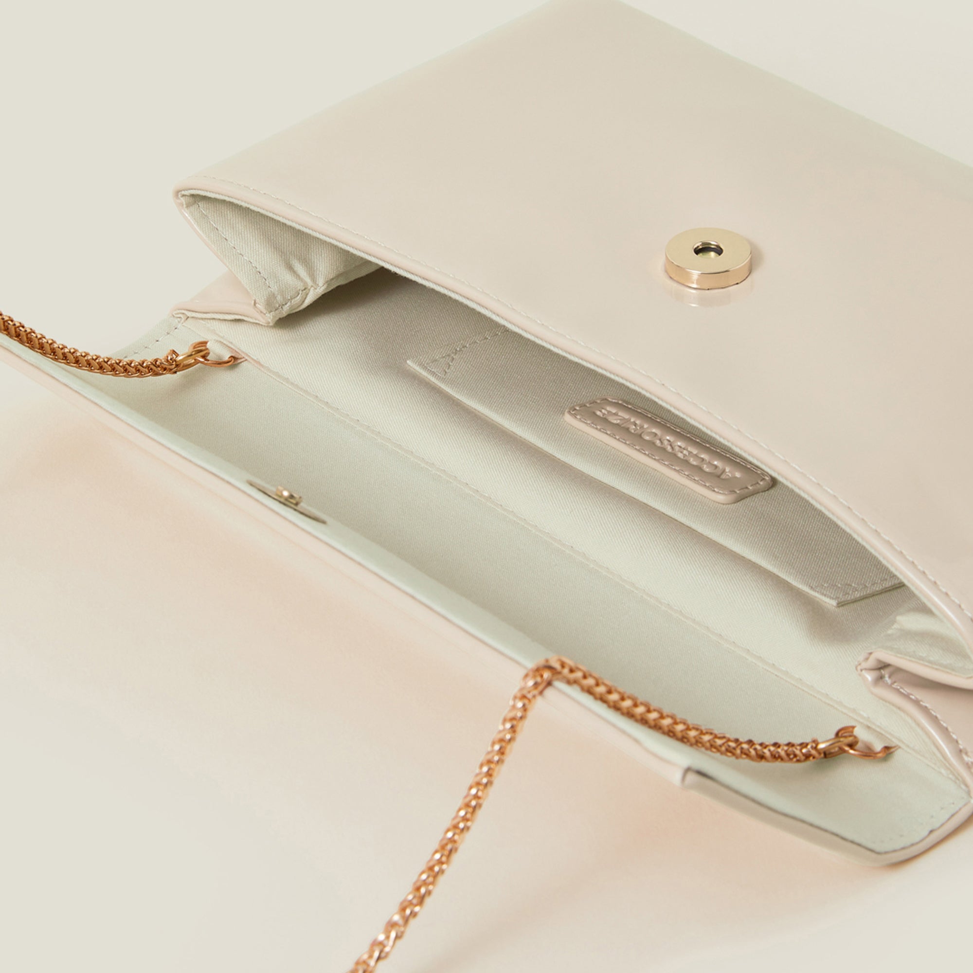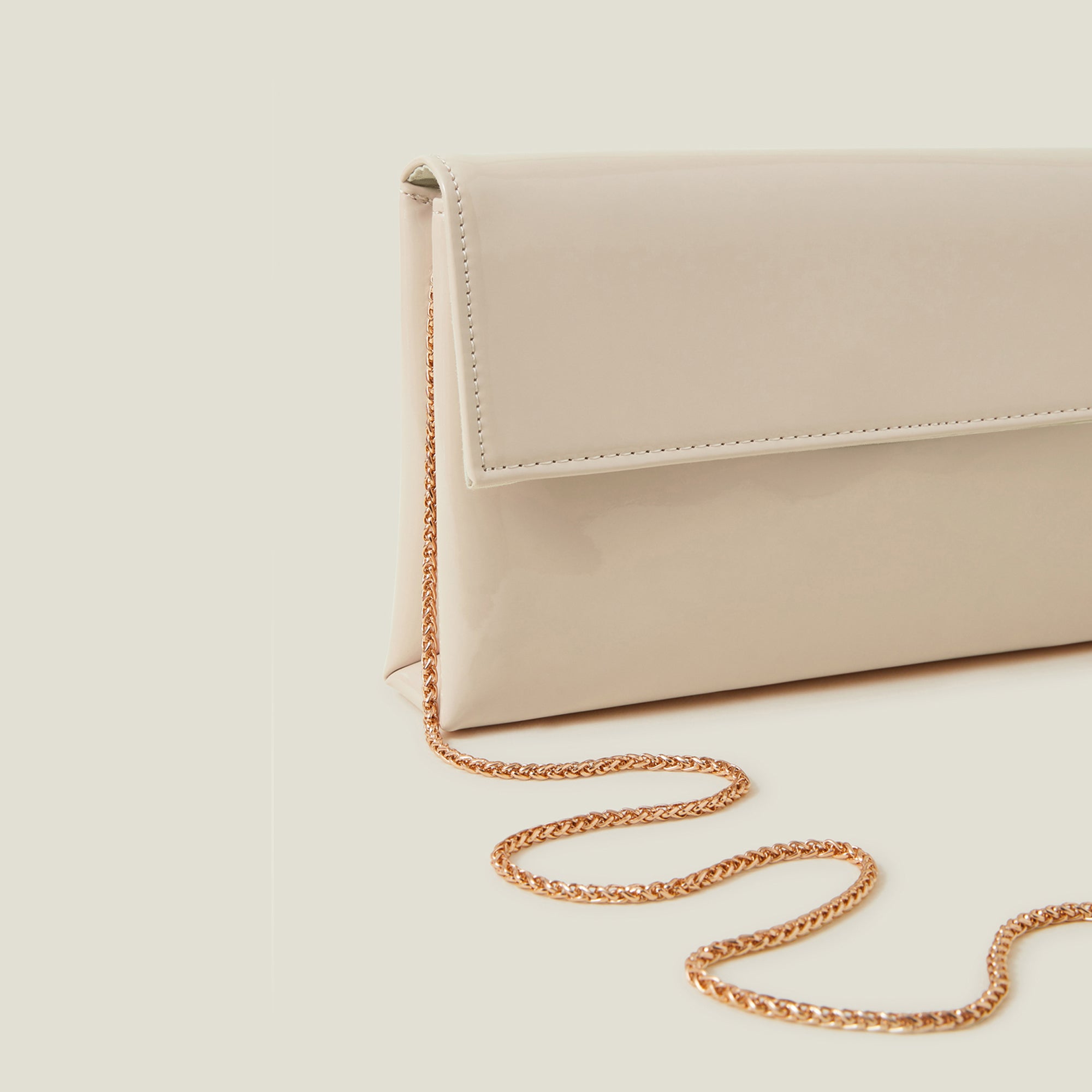 A neutral accessory that'll go with all your party 'fits. This clutch bag is designed with a fold-over profile, sleek patent finish and optional gold-tone chain strap. Fastens with a magnetic button.