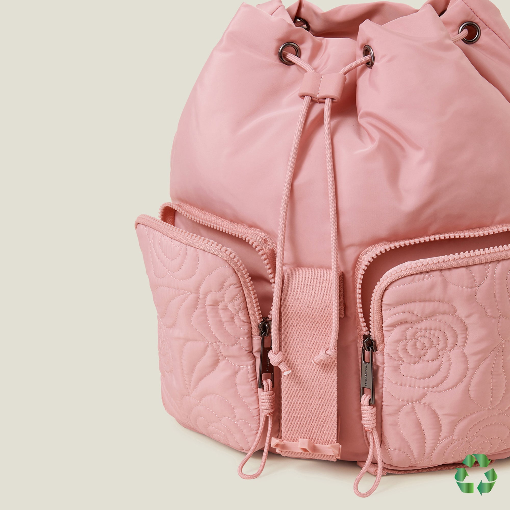 Decorated with rose-shaped quilting for a fun, modern twist, this backpack is a compact and cute accessory for showing off during your work commute. Featuring a drawstring top and fold-over clip buckle fastening, the two square zip pockets on the front are great for storing quick access items when you're on the go.