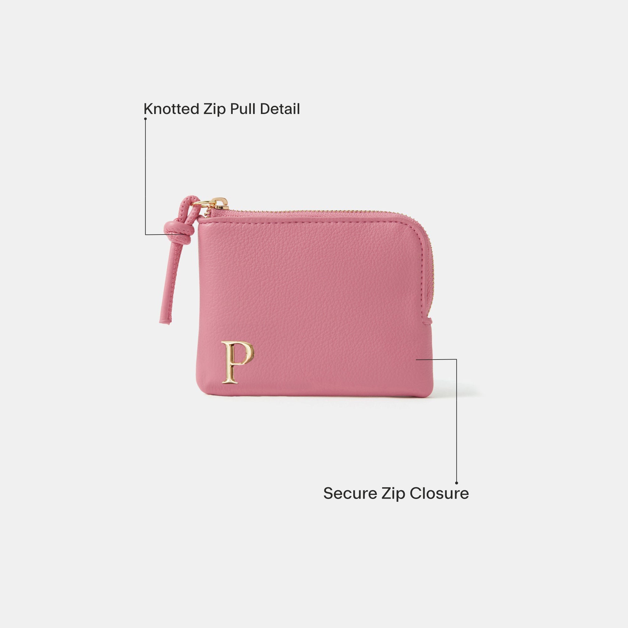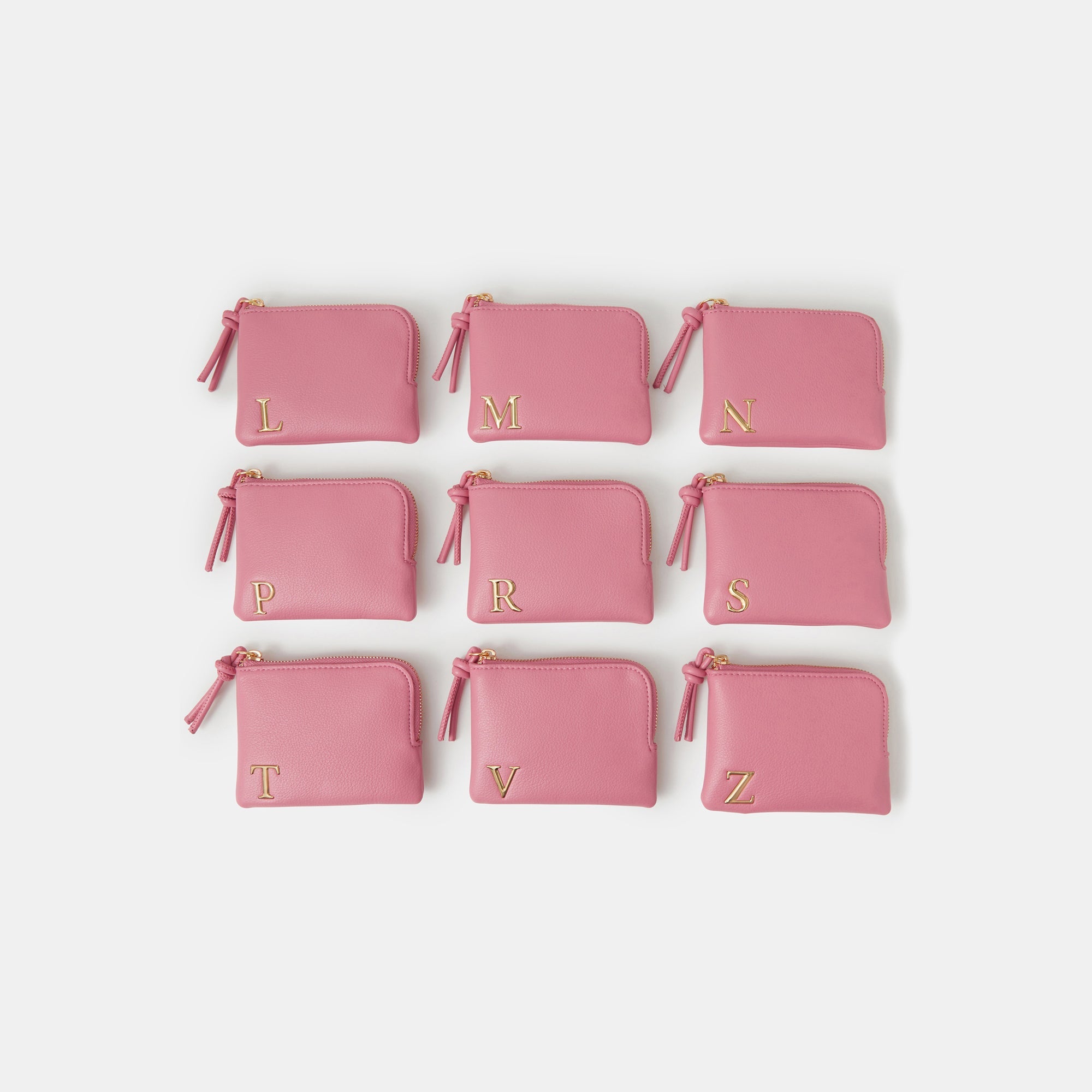 Nothing beats a personalised gift. Designed in faux leather, this coin purse features a simple design with initial hardware on the front. Fastens with a zip. Pink