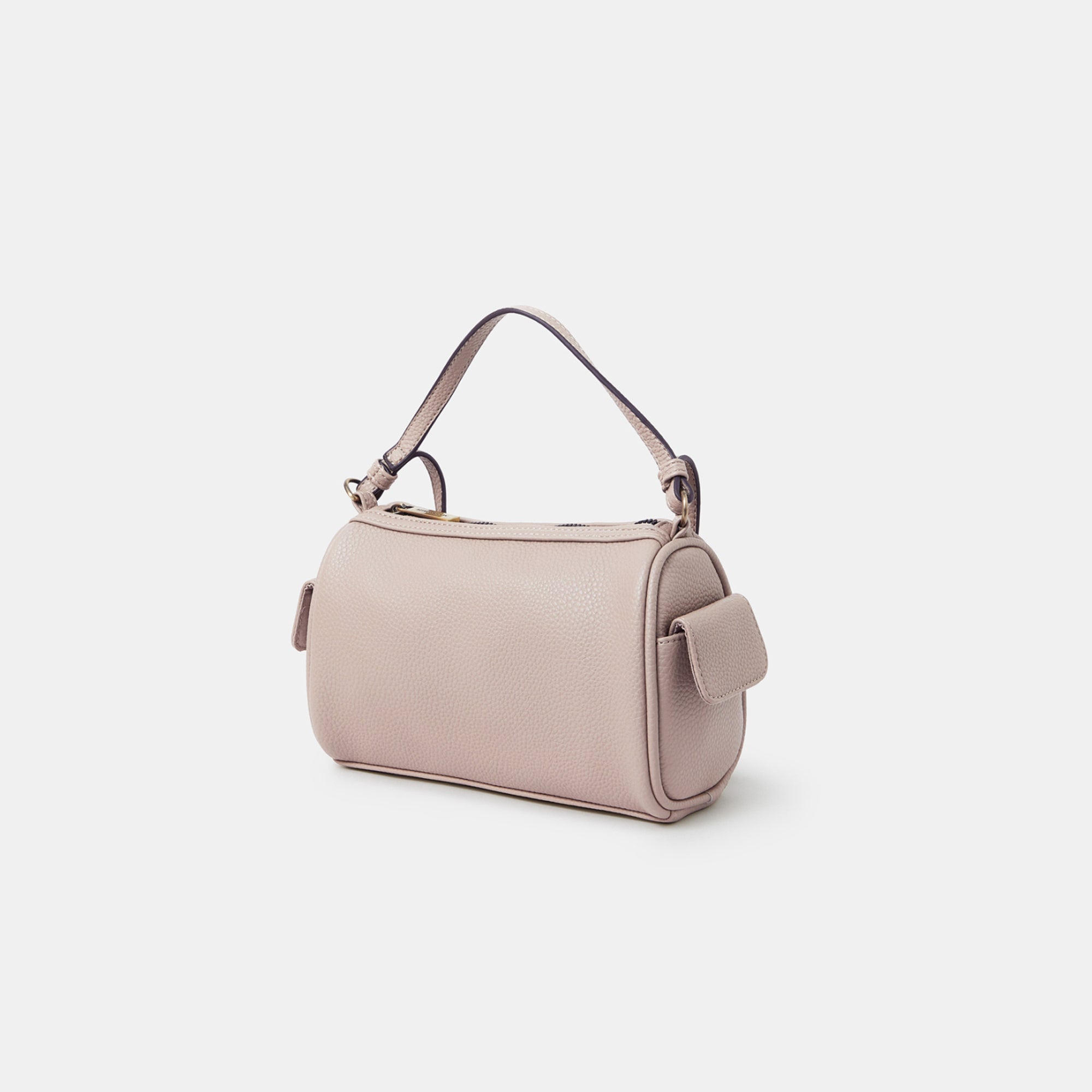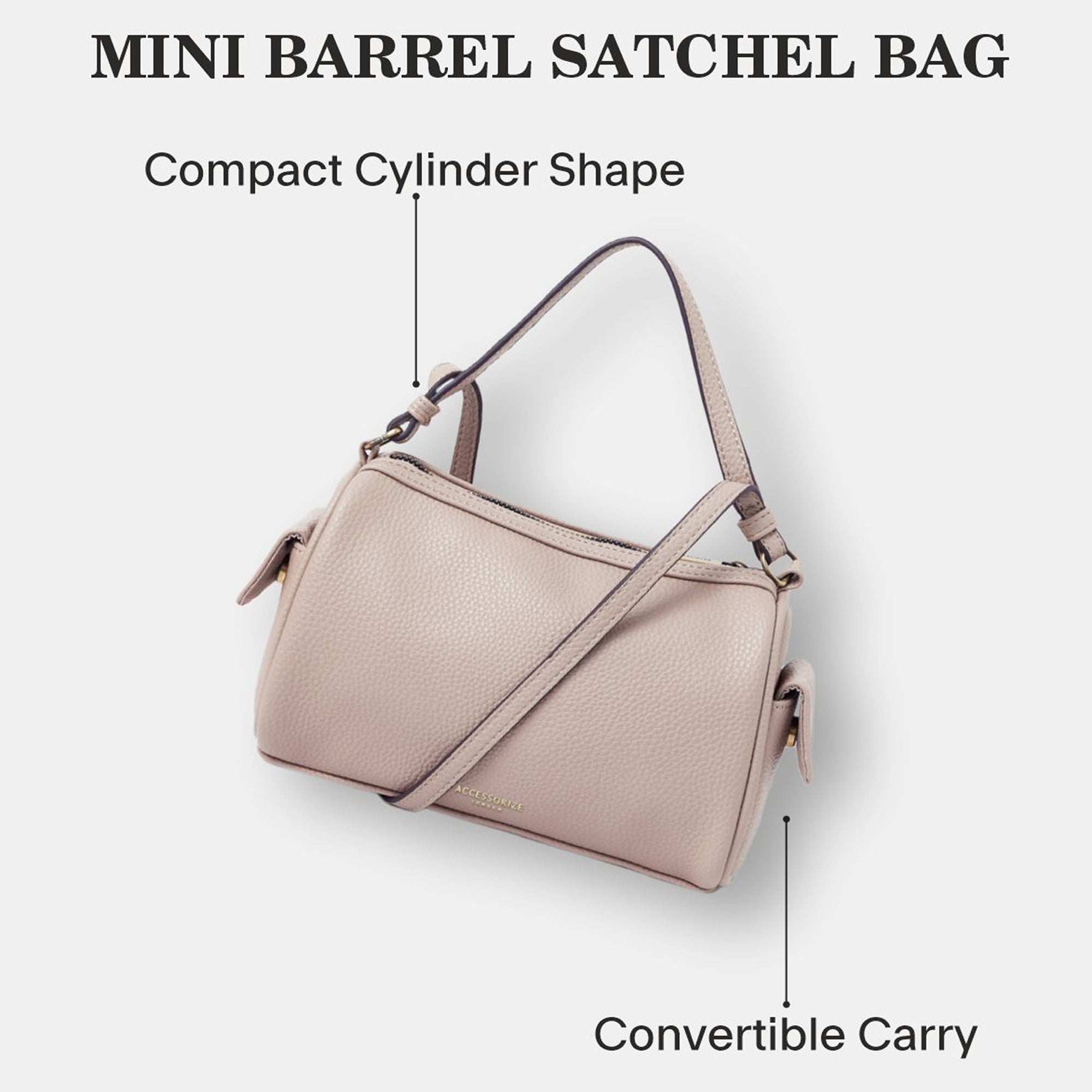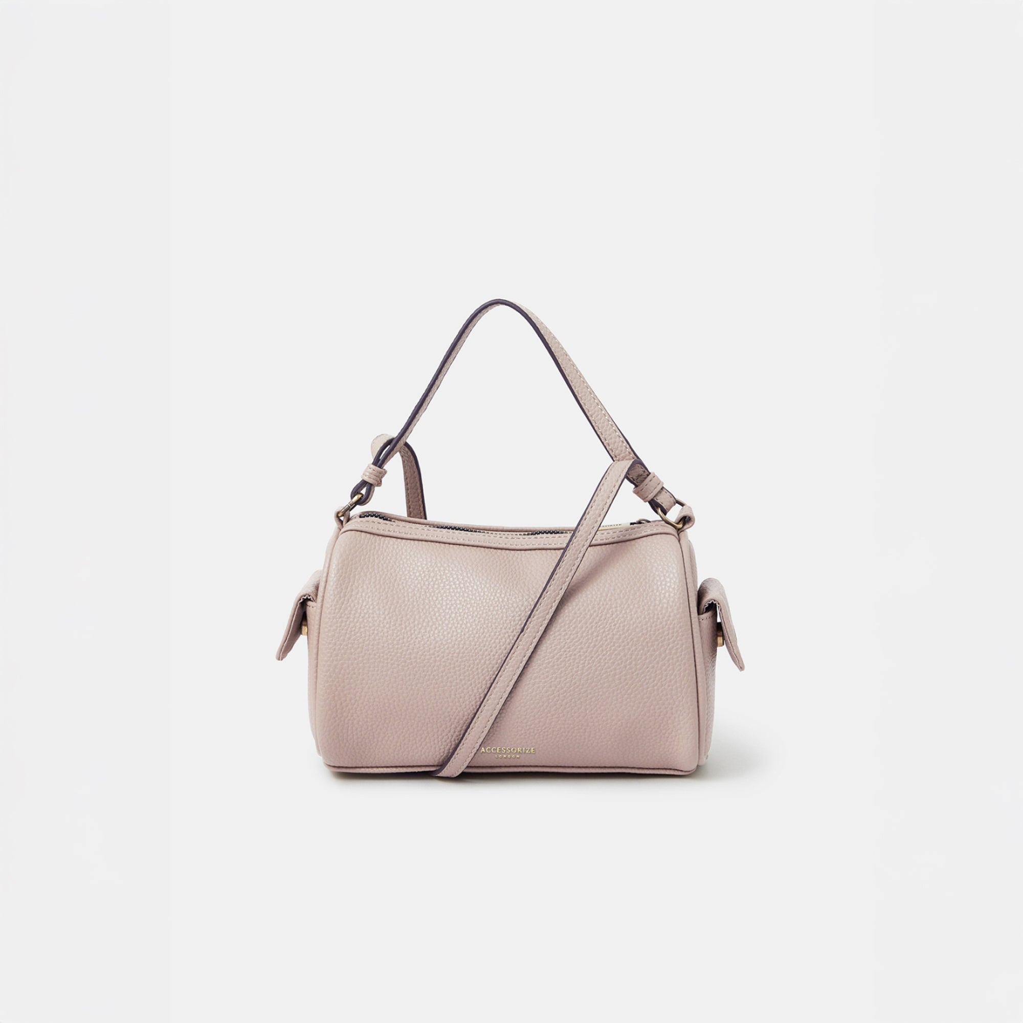 A compact yet roomy essential, this dusky pink barrel bag from Accessorize London blends everyday functionality with a clean, structured silhouette. Crafted in textured faux leather, it features a top zip closure, dual side pockets, and both short and long straps for versatile carrying. The subtle gold branding and hardware add a polished finish to this understated staple.