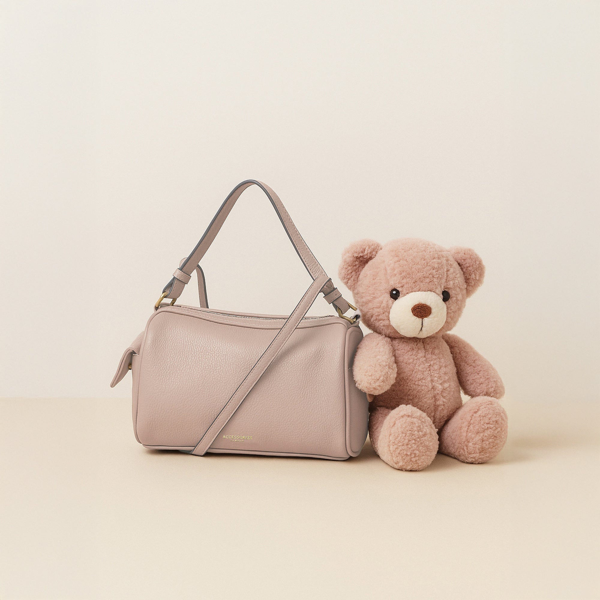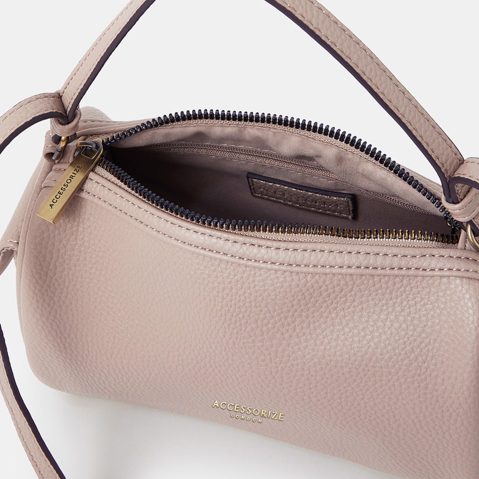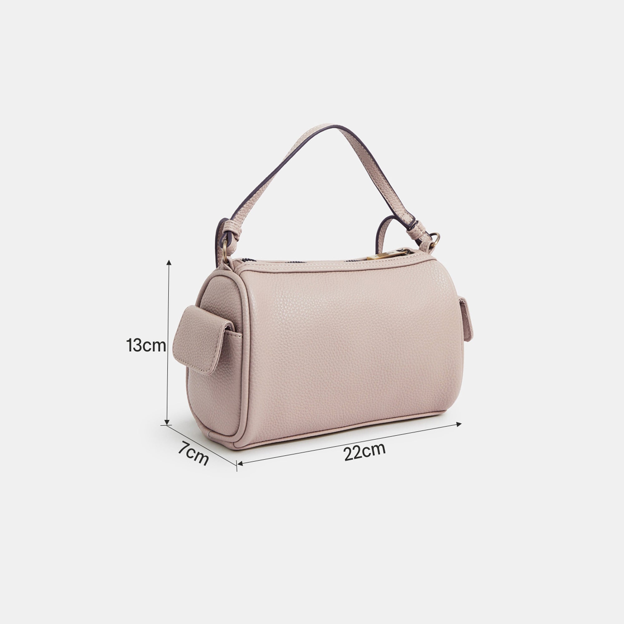 A compact yet roomy essential, this dusky pink barrel bag from Accessorize London blends everyday functionality with a clean, structured silhouette. Crafted in textured faux leather, it features a top zip closure, dual side pockets, and both short and long straps for versatile carrying. The subtle gold branding and hardware add a polished finish to this understated staple.