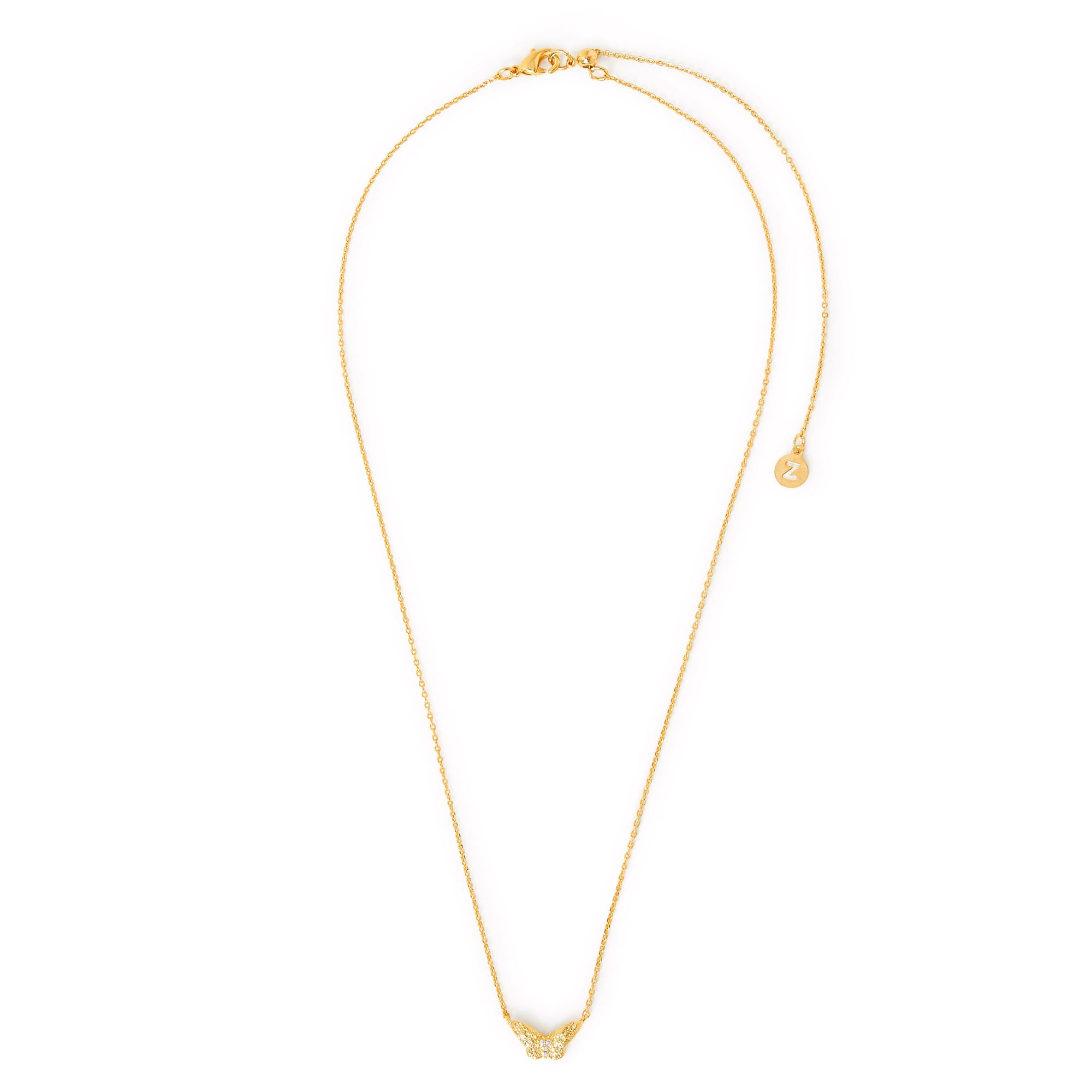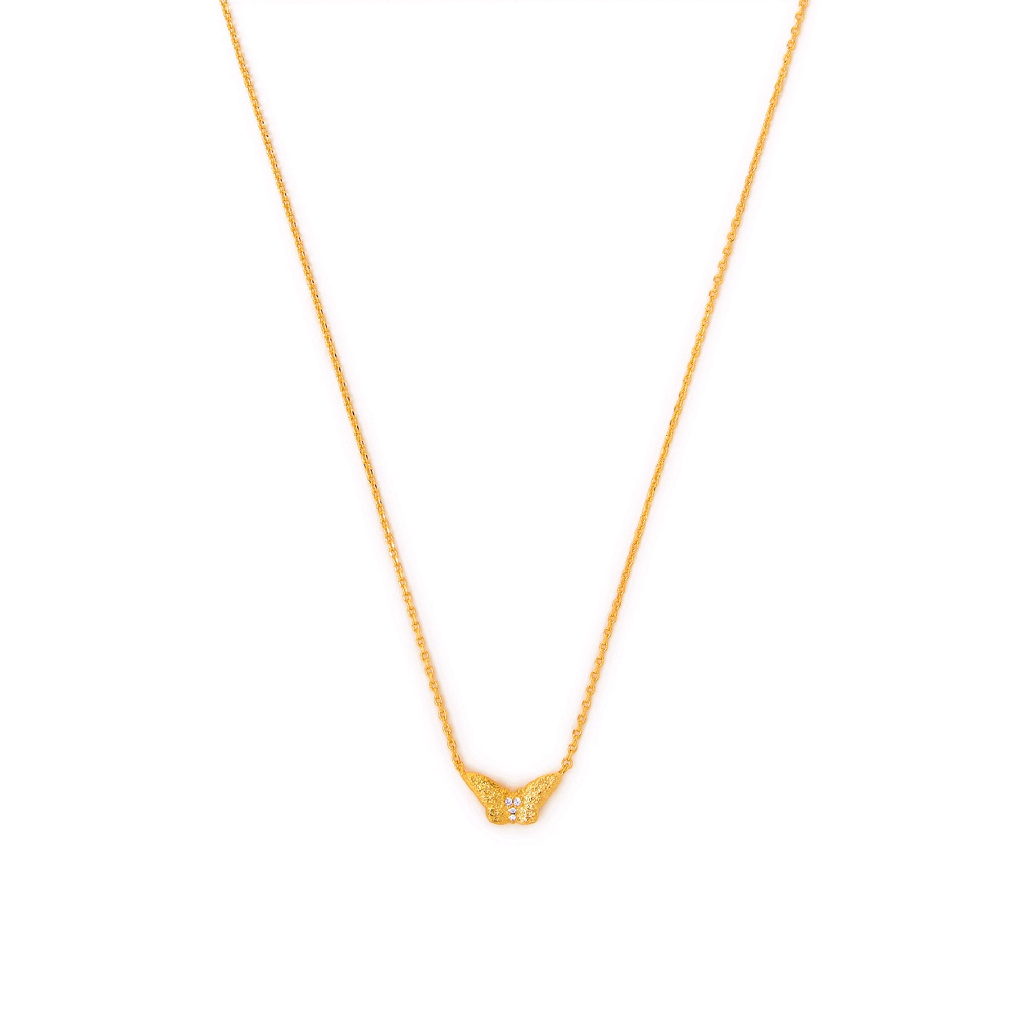 Borrowing from mother nature, this golden necklace features a butterfly pendant adorned with a trio of dainty diamante stones.