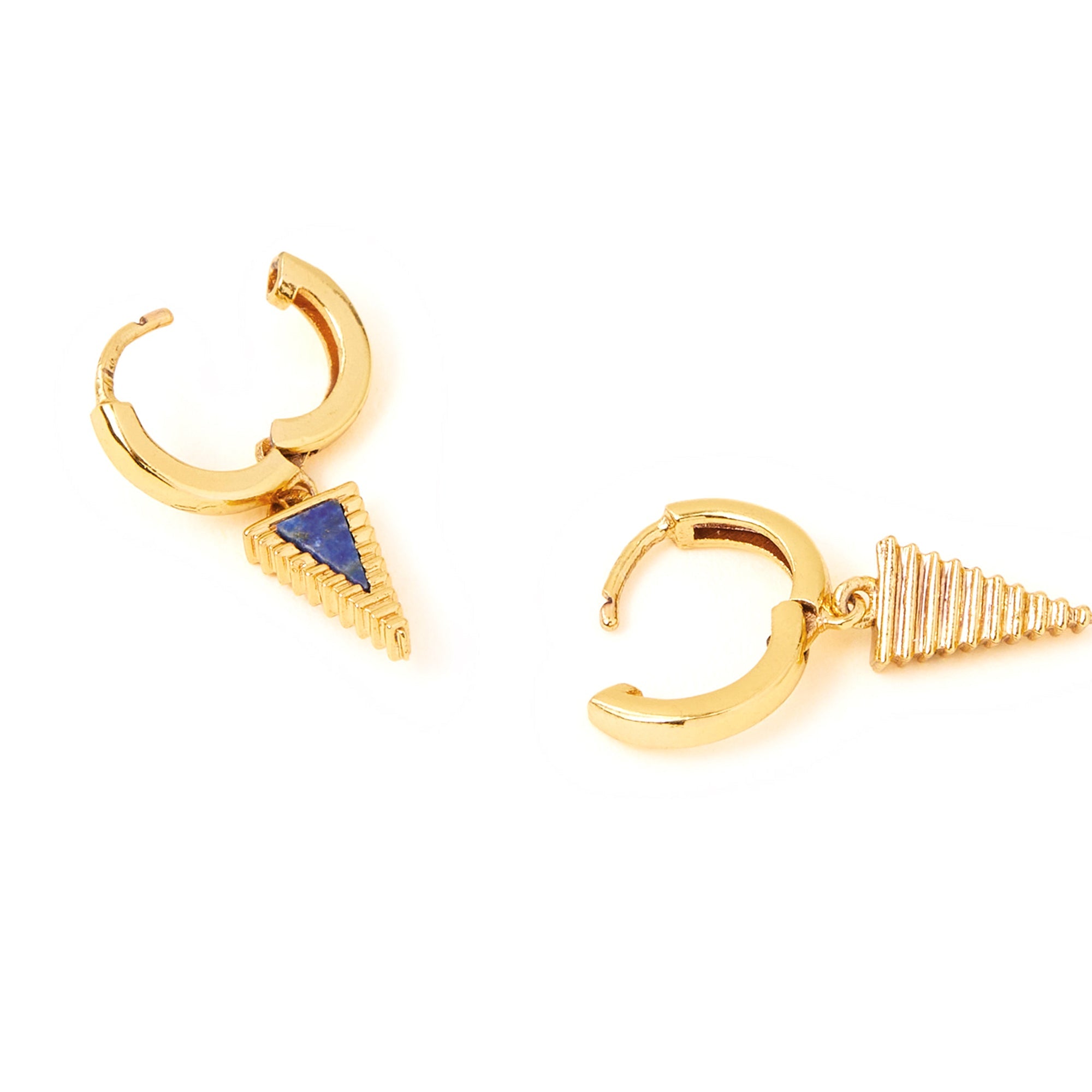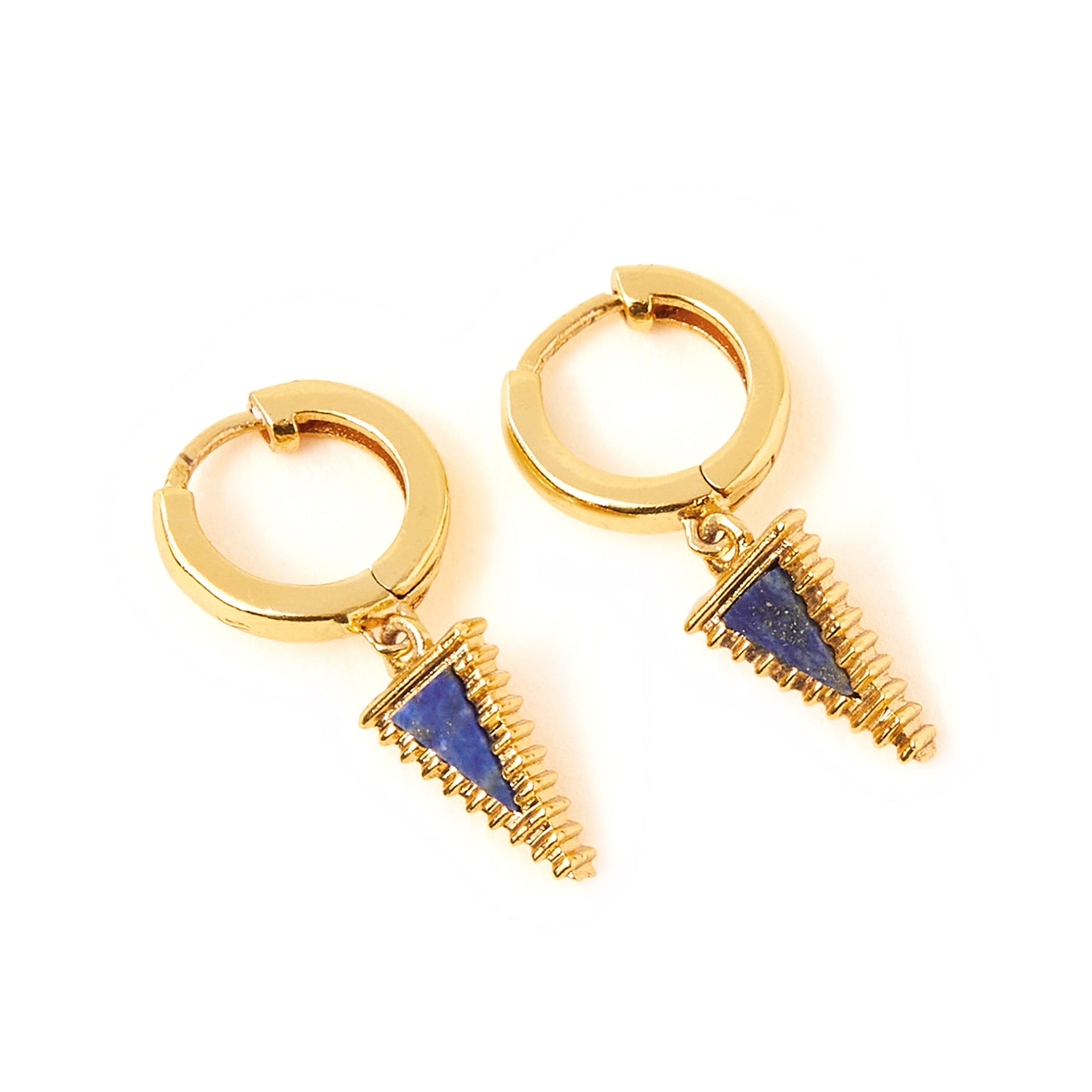 The perfect finishing touch for any look, casual or smart! These snug huggie hoops feature triangle pendant, embedded with semi precious lapis lazuli, symbolising wisdom and truth.