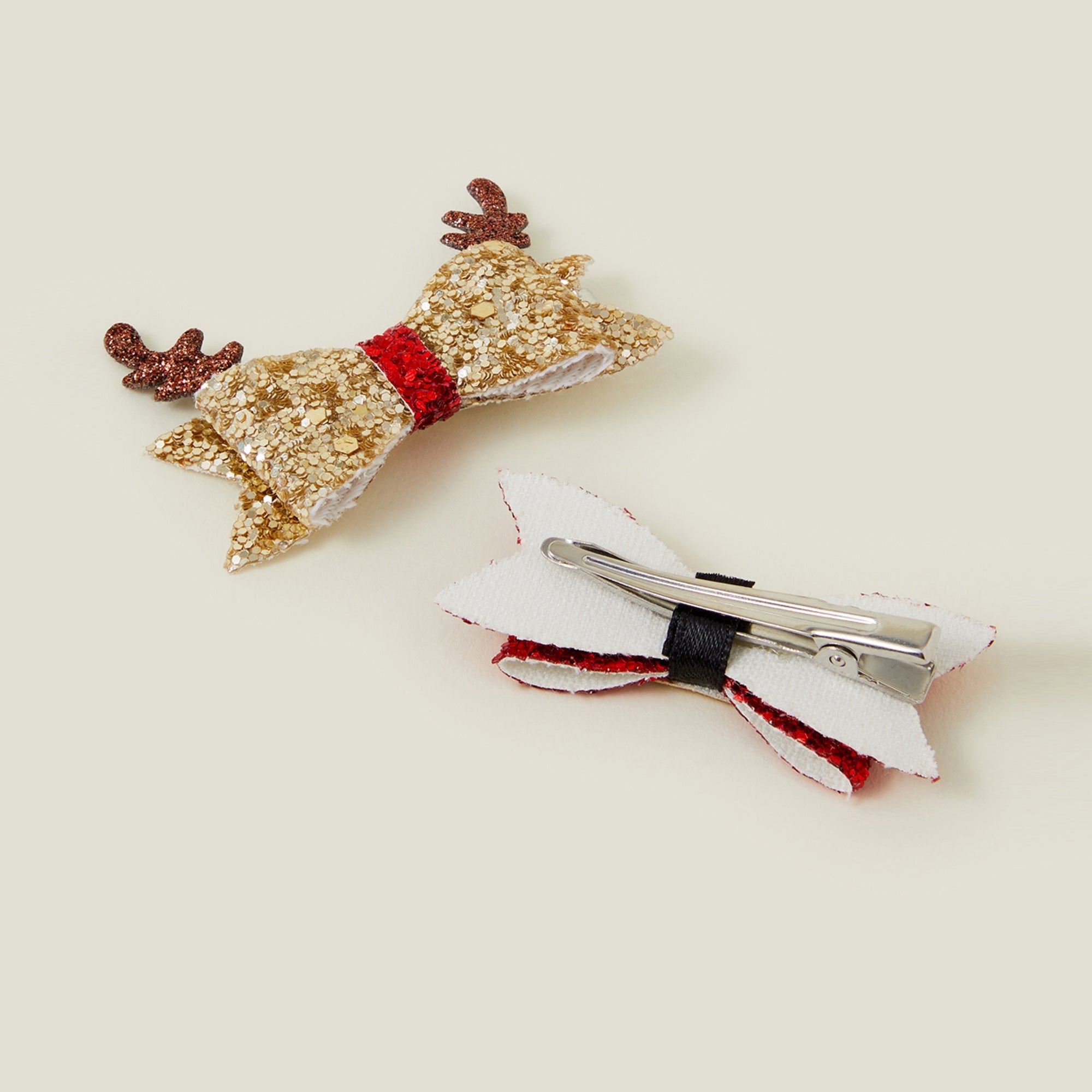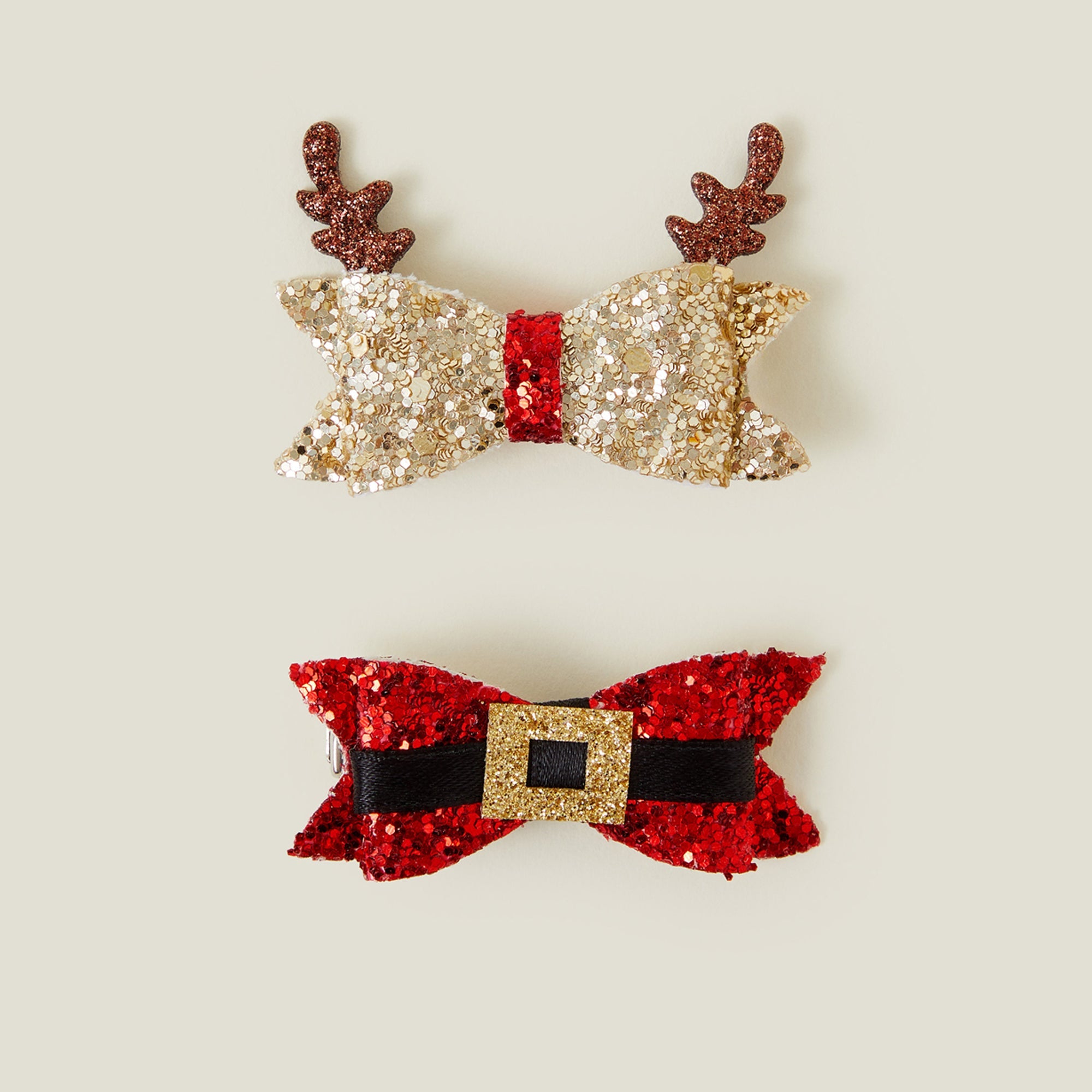 Is that, Rudolph and Santa? Fun hair accessories to show off in December, these hair bows are doused in festive glitter with silver-tone slip clip fastenings.