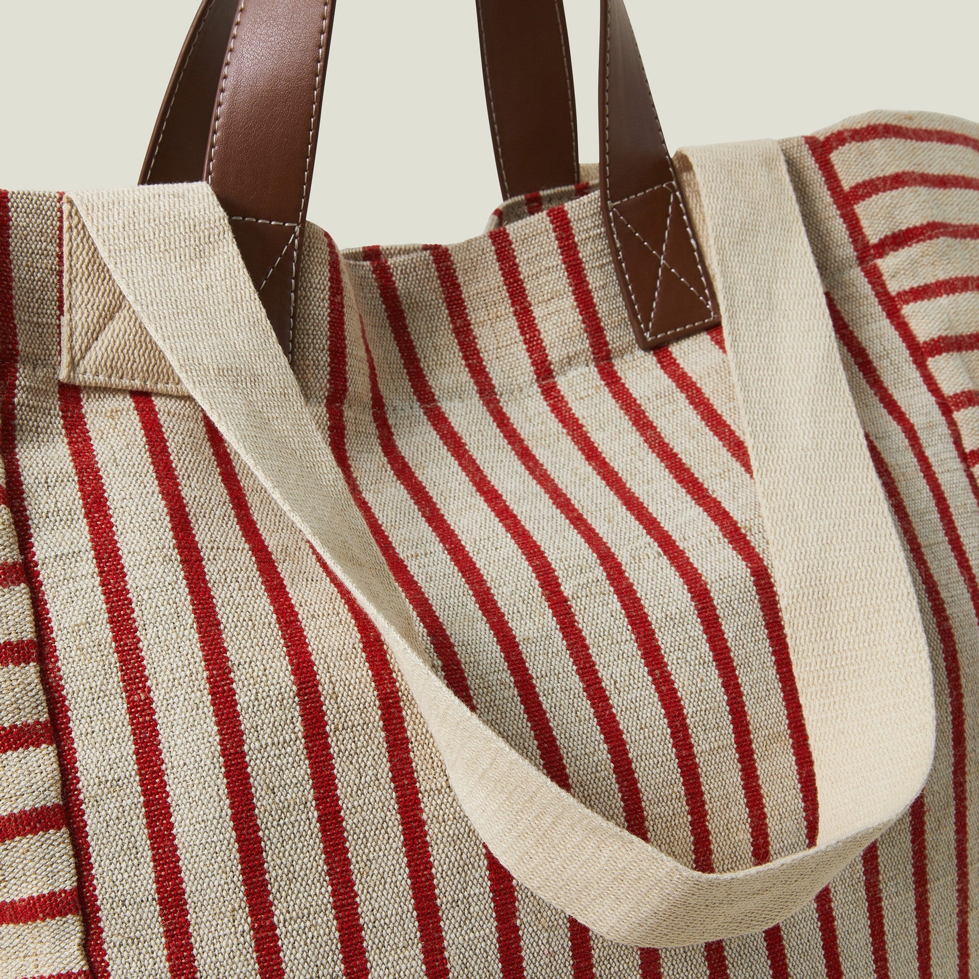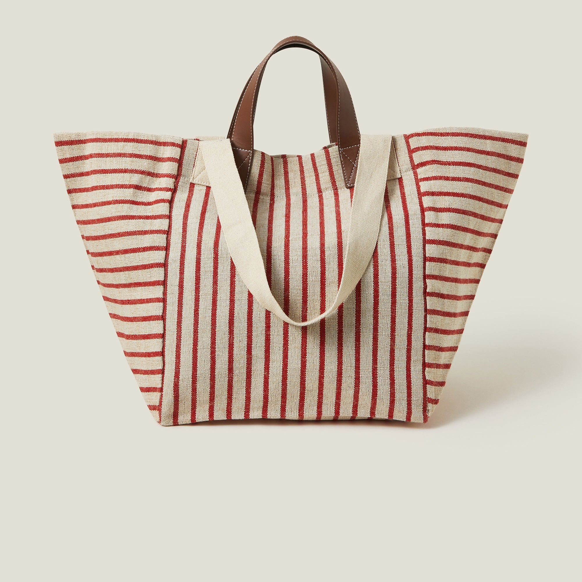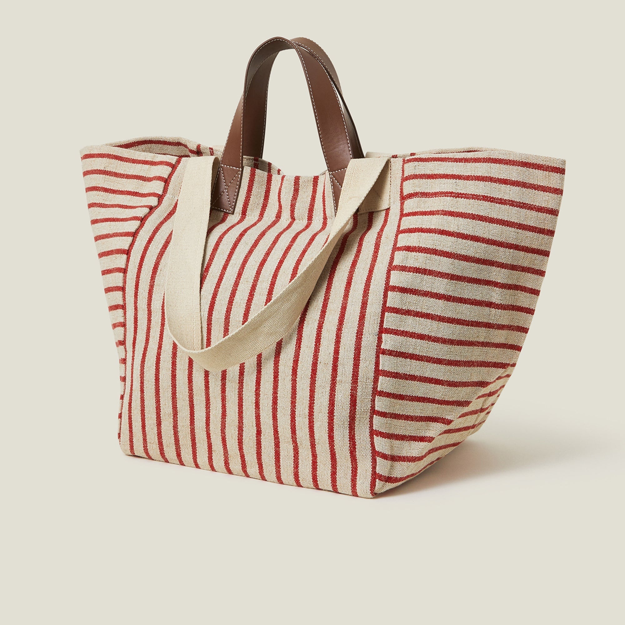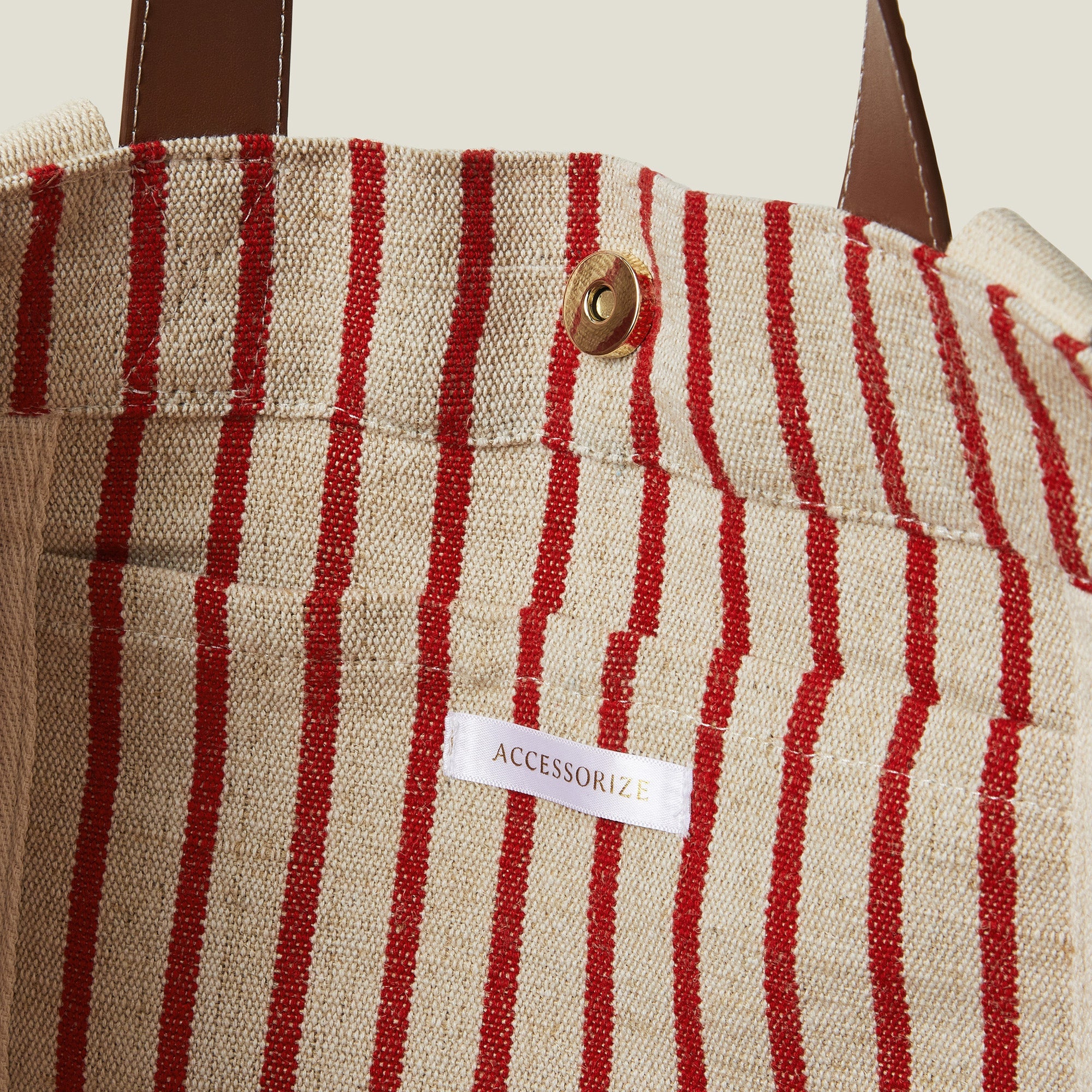 Like you, she's versatile. Made from cotton canvas with bold stripes in beige and red, this supersized tote bag can be used for beach days, sleepovers or shopping trips. Designed with two sets of straps, a magnetic button fastening and inner slip pocket