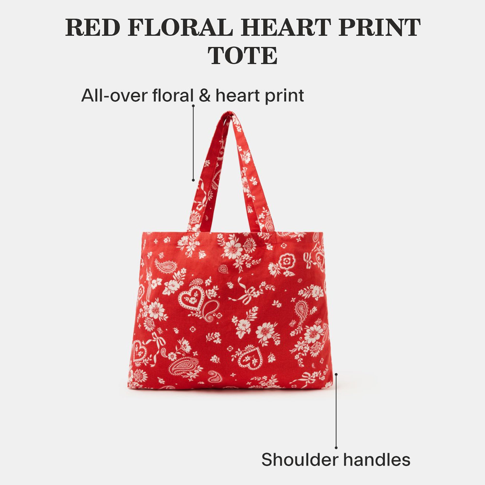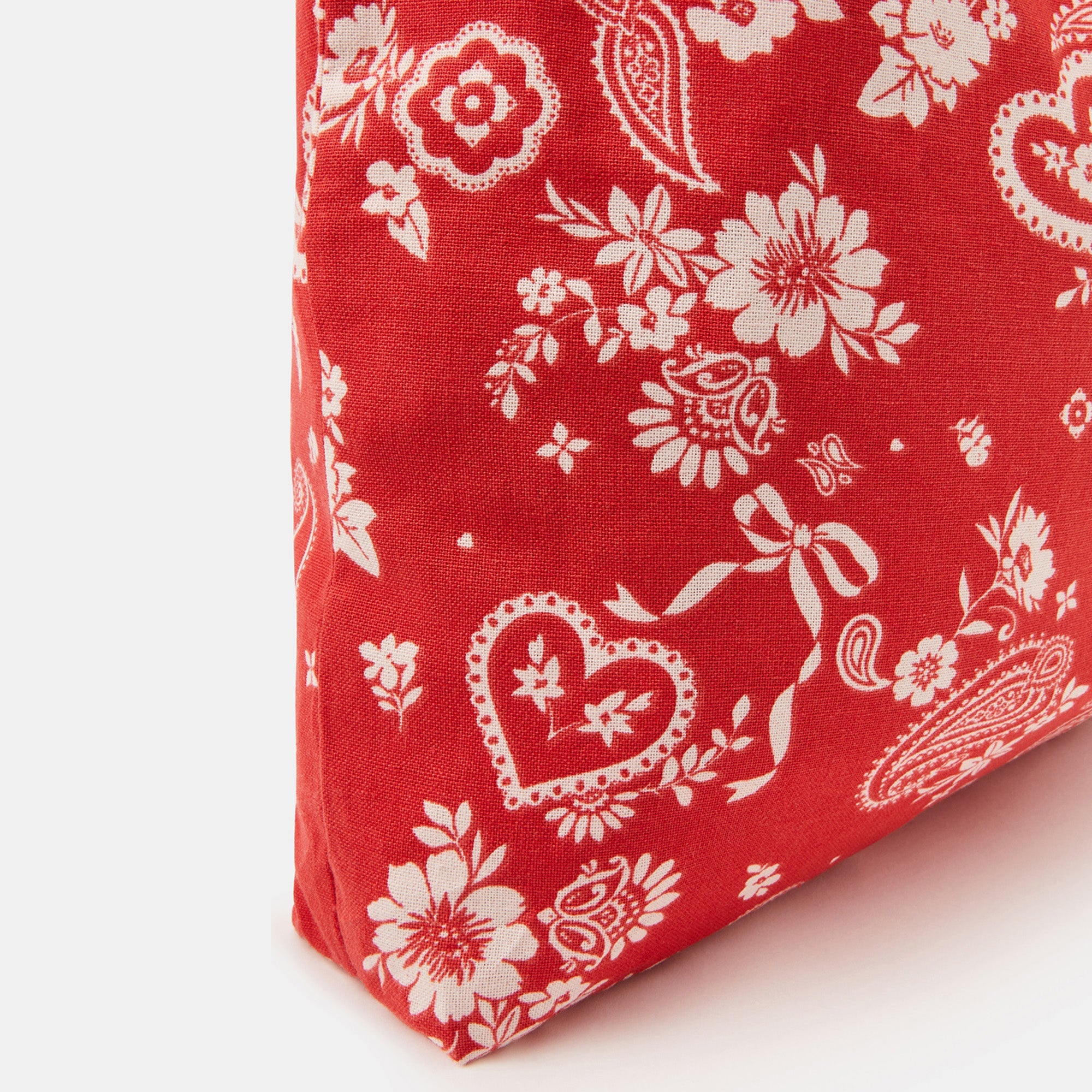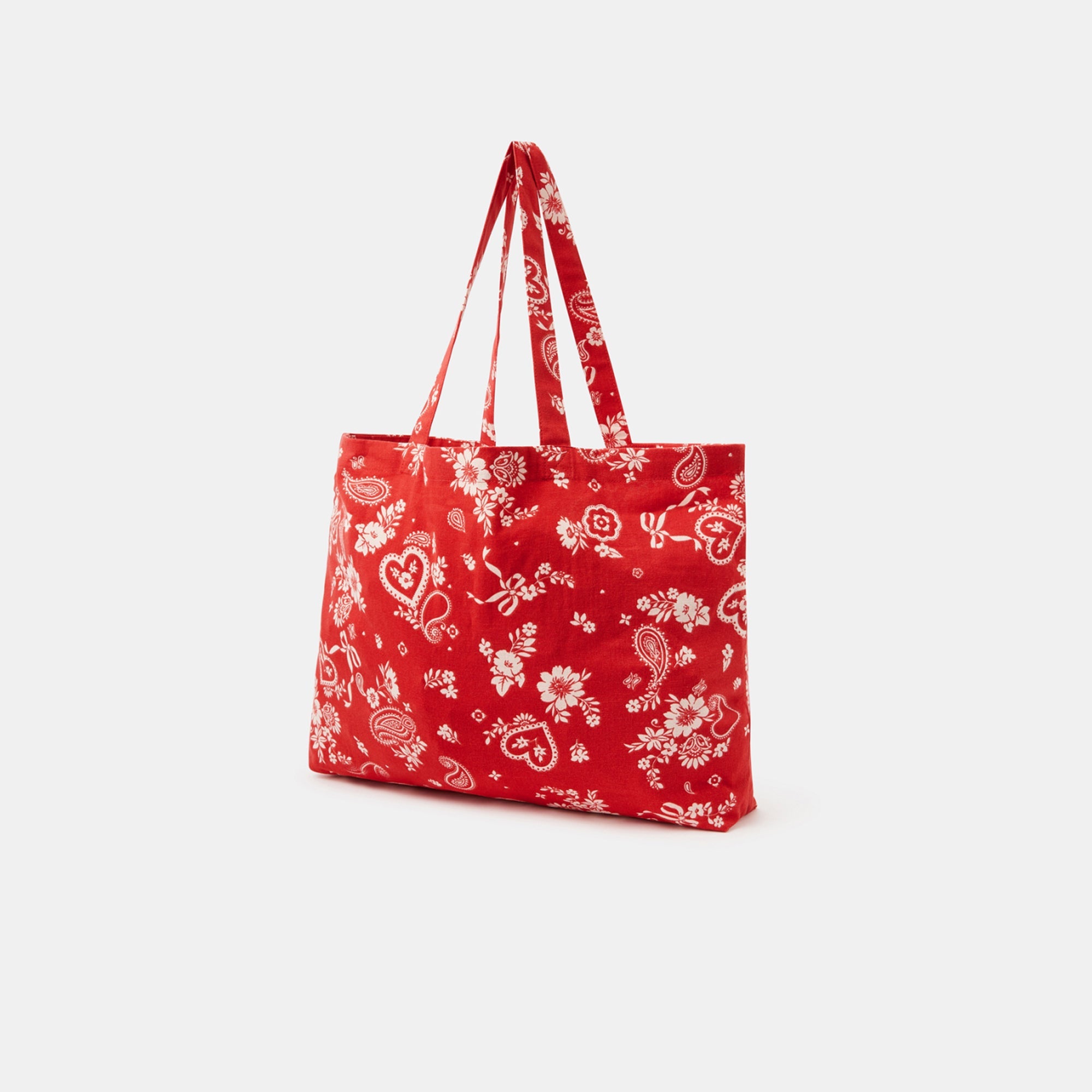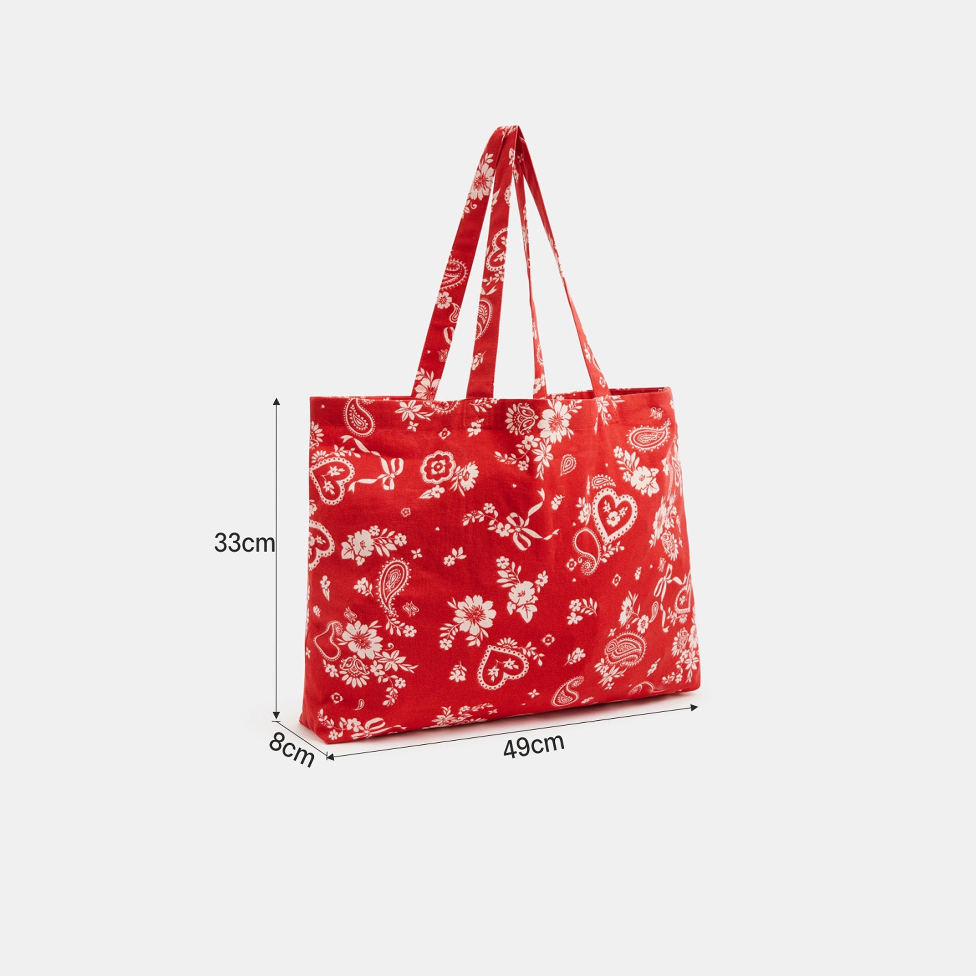 Add a splash of color to your everyday wardrobe with this vibrant red canvas tote. The playful white prints bring a nostalgic bandana-style charm, making it a standout piece for casual dressing. Pair it with a white tee and denim jeans for a classic combo or throw it over a breezy summer dress to complete your picnic-ready look. Add sneakers or espadrilles and let the tote do the talking.