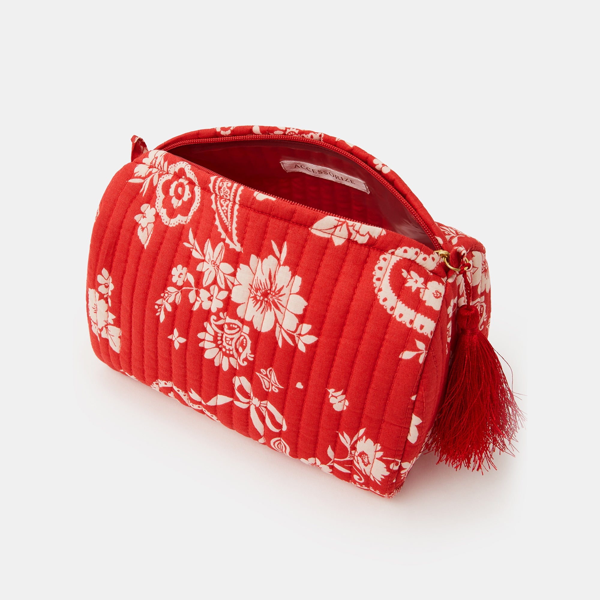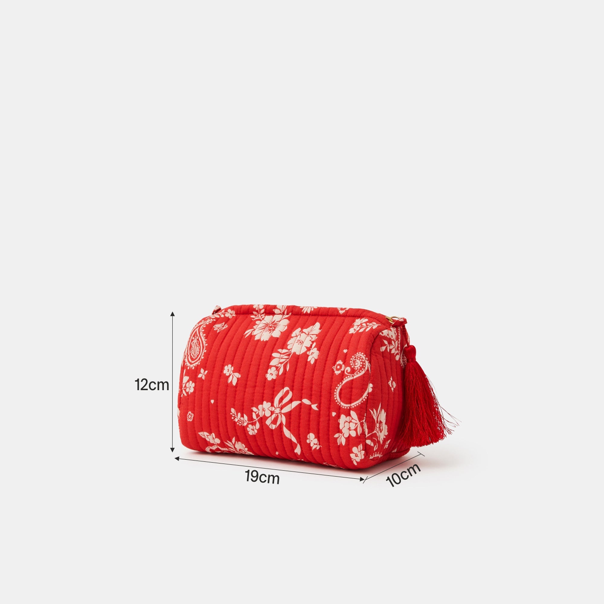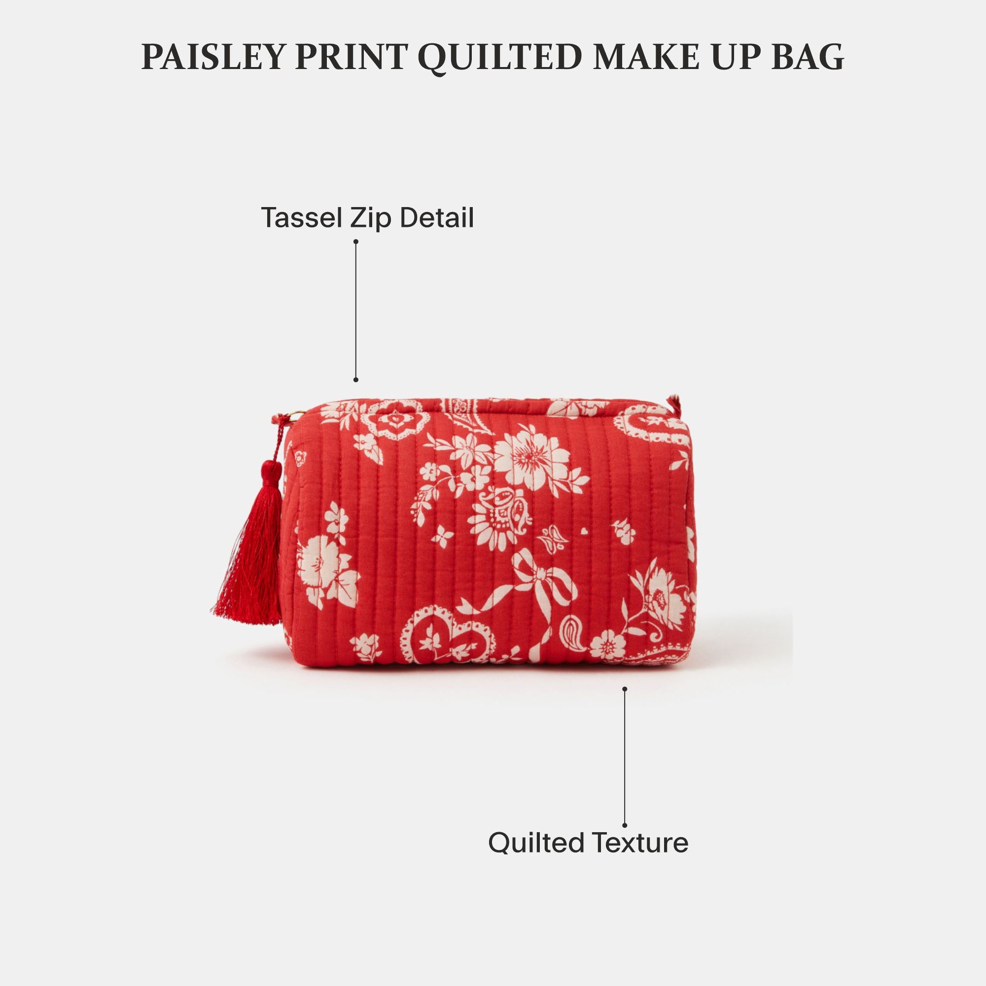 Brighten up your vanity or travel bag with this Red Paisley Print Quilted Make Up Bag. Crafted in quilted fabric, it’s decorated with floral and paisley motifs for a playful twist. Designed with a waterproof lining and a zip closure topped with a tassel pull, this makeup bag keeps your beauty essentials secure, organised, and easy to carry.