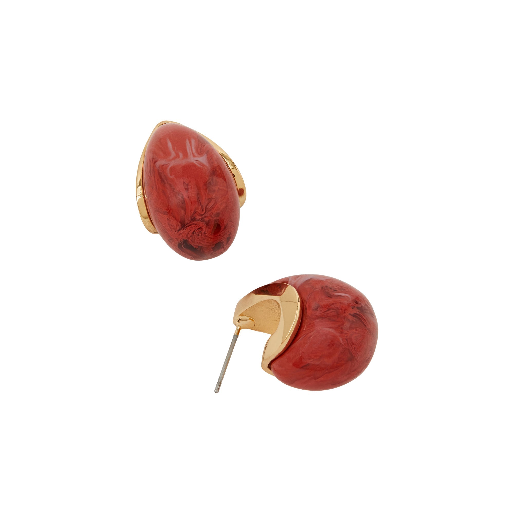 The trending silhouette with a dreamy twist. Designed in a chunky curve hoop shape, these earrings are finished with a red marbled resin finish.