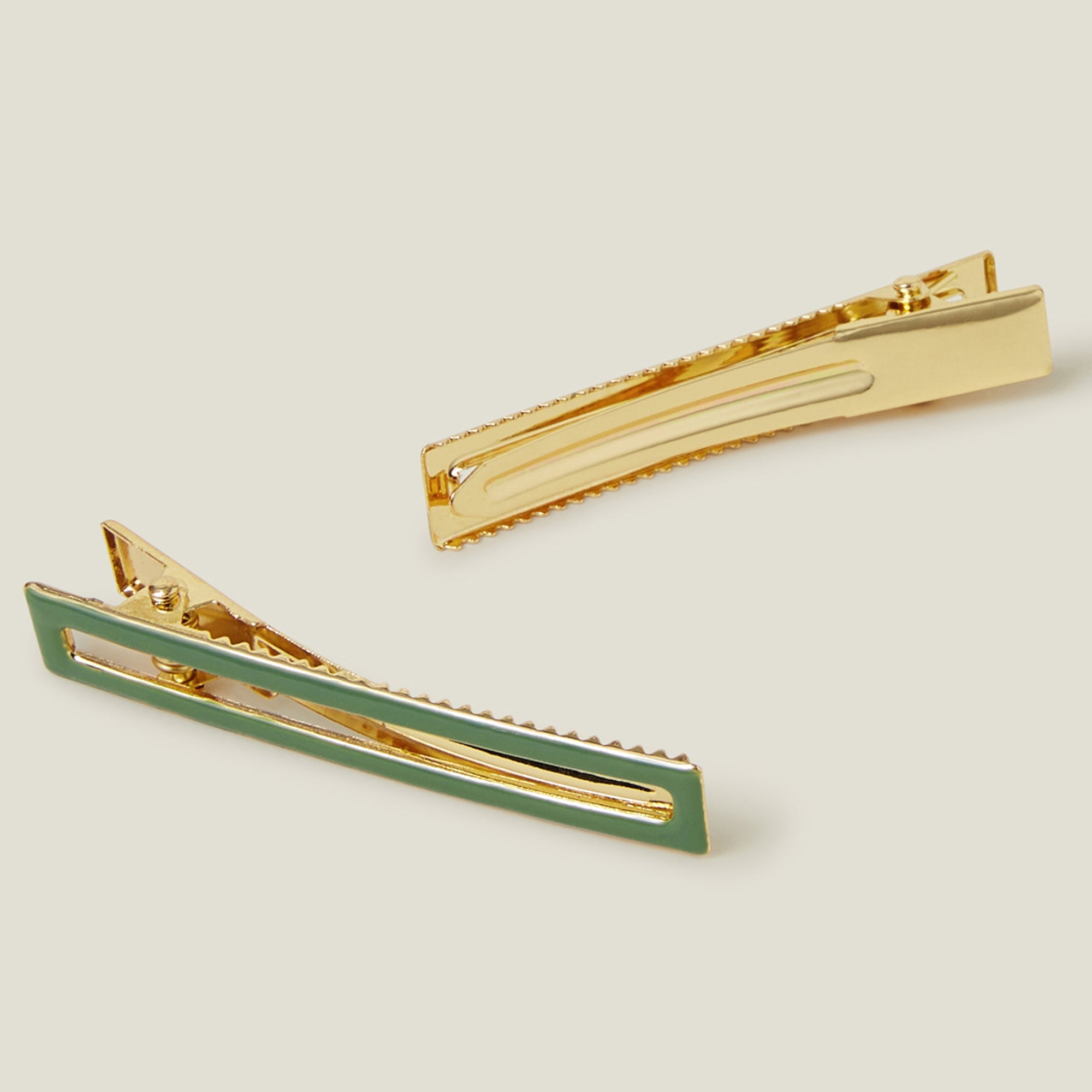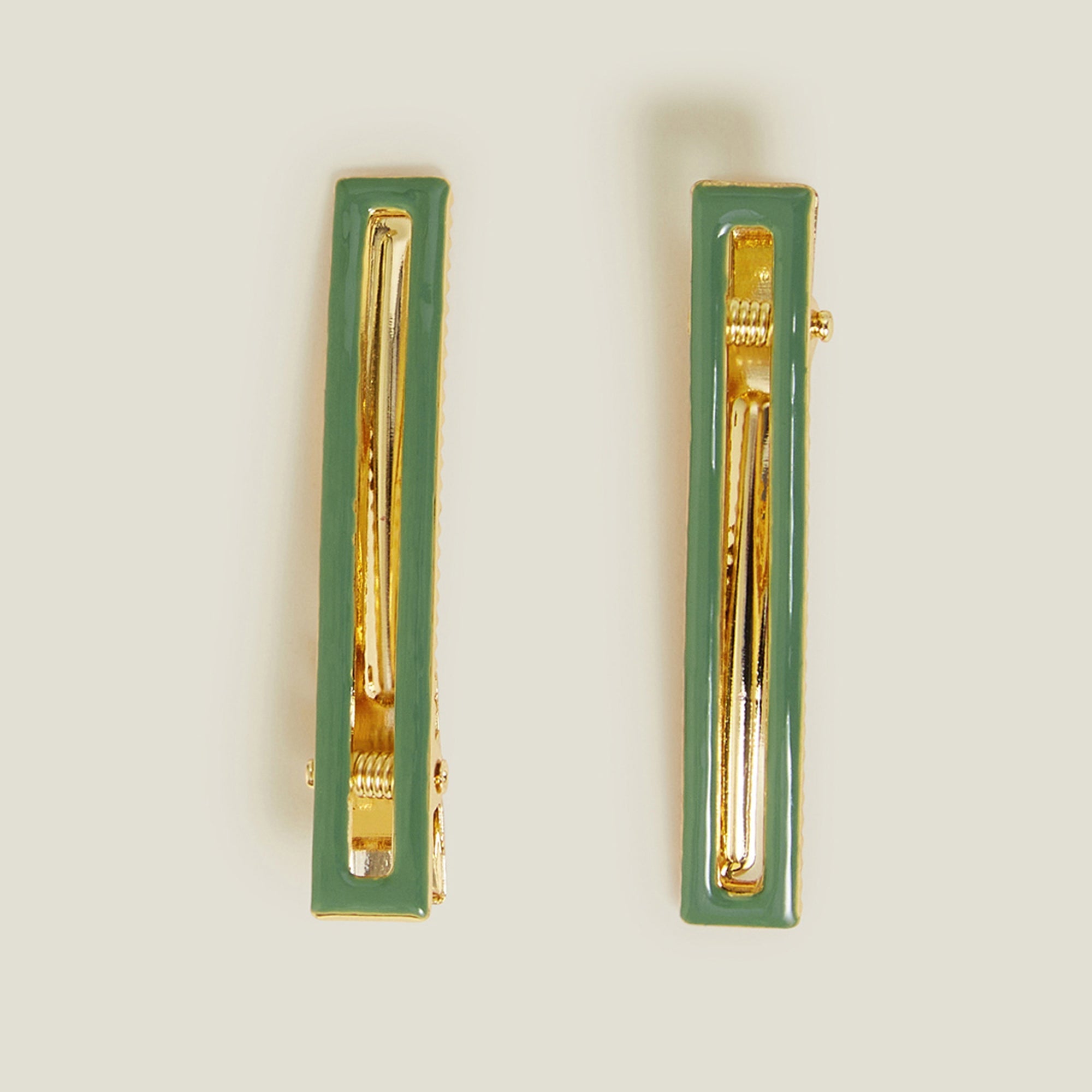 Designed with green strips of resin with on a simple salon clip, this duo of hair clips add artful accents to every hairstyle. Two included.