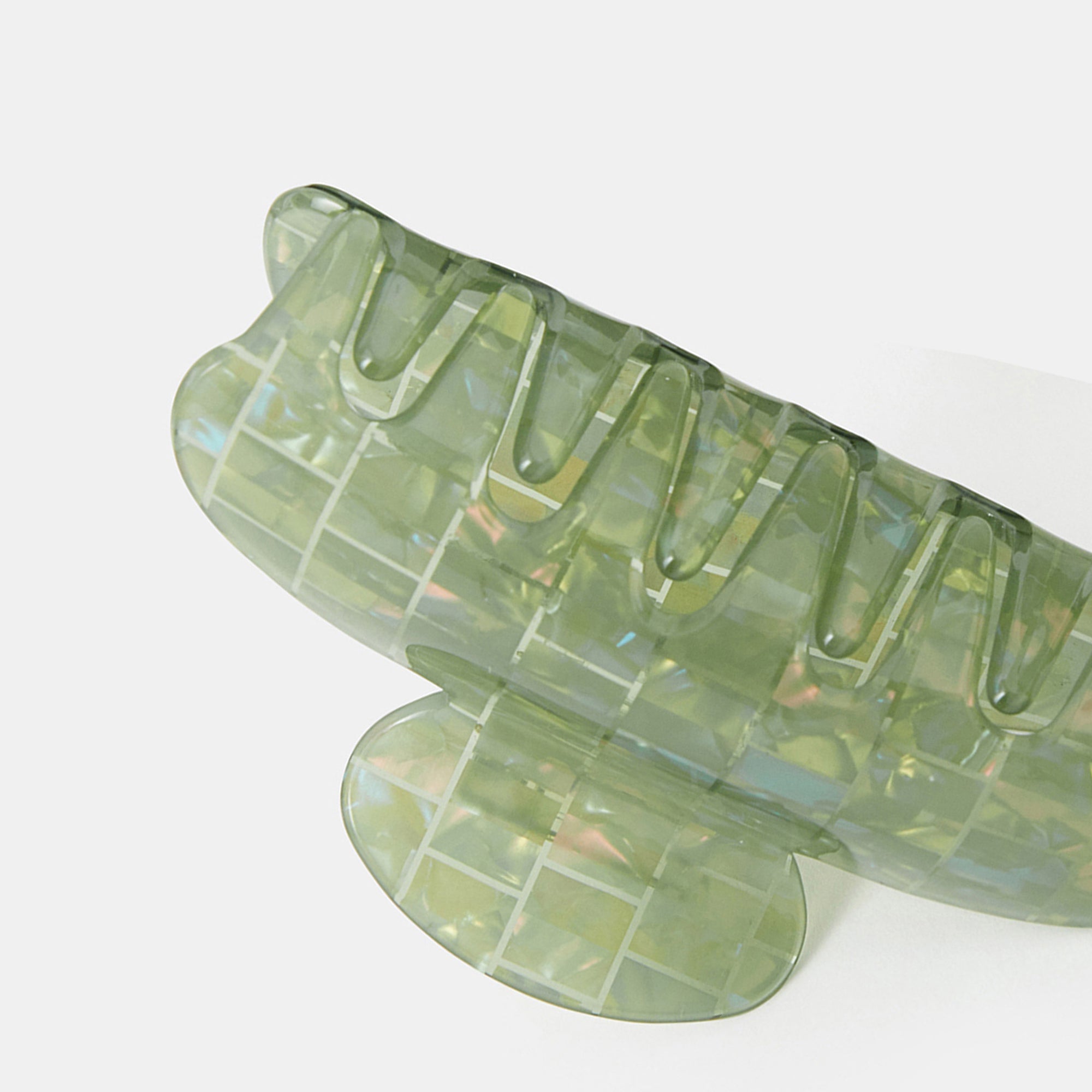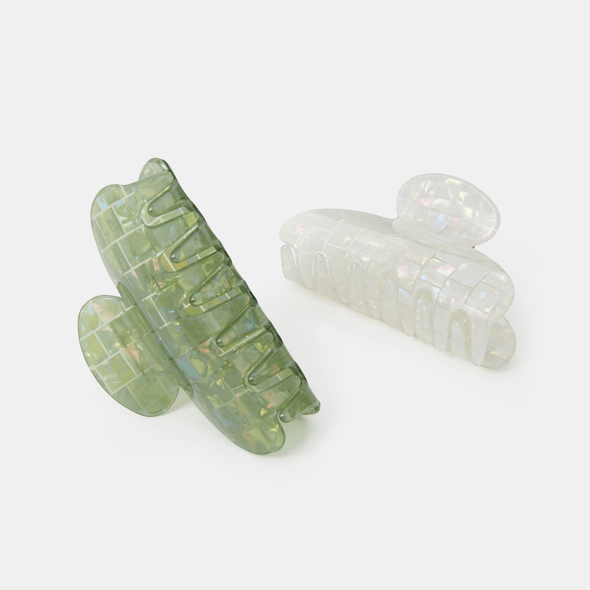 Designed in green and white, these claw clips have tiled detailing with a shimmery iridescent finish. Two included.