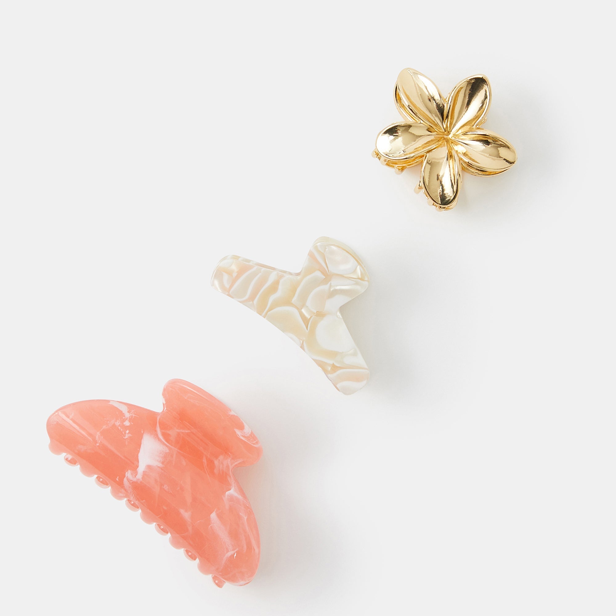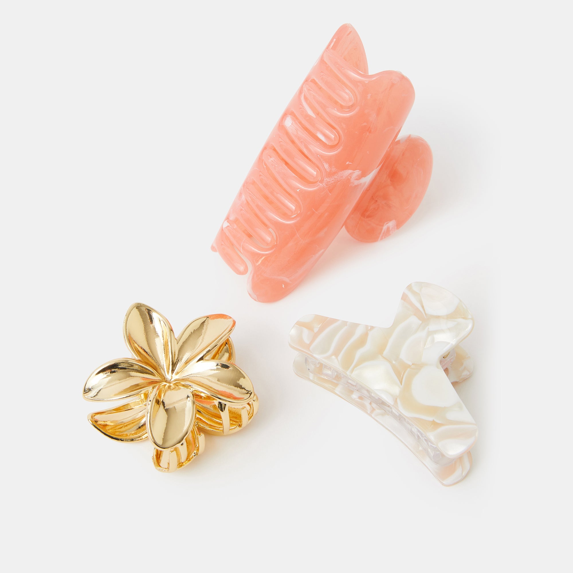 A trio you need for your summer looks, these claw clips feature a golden tropical flower and two classic styles with salmon and pearly finishes. Three included.