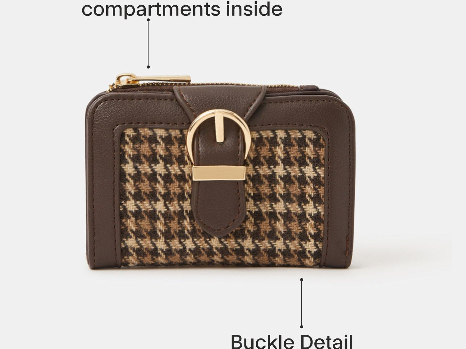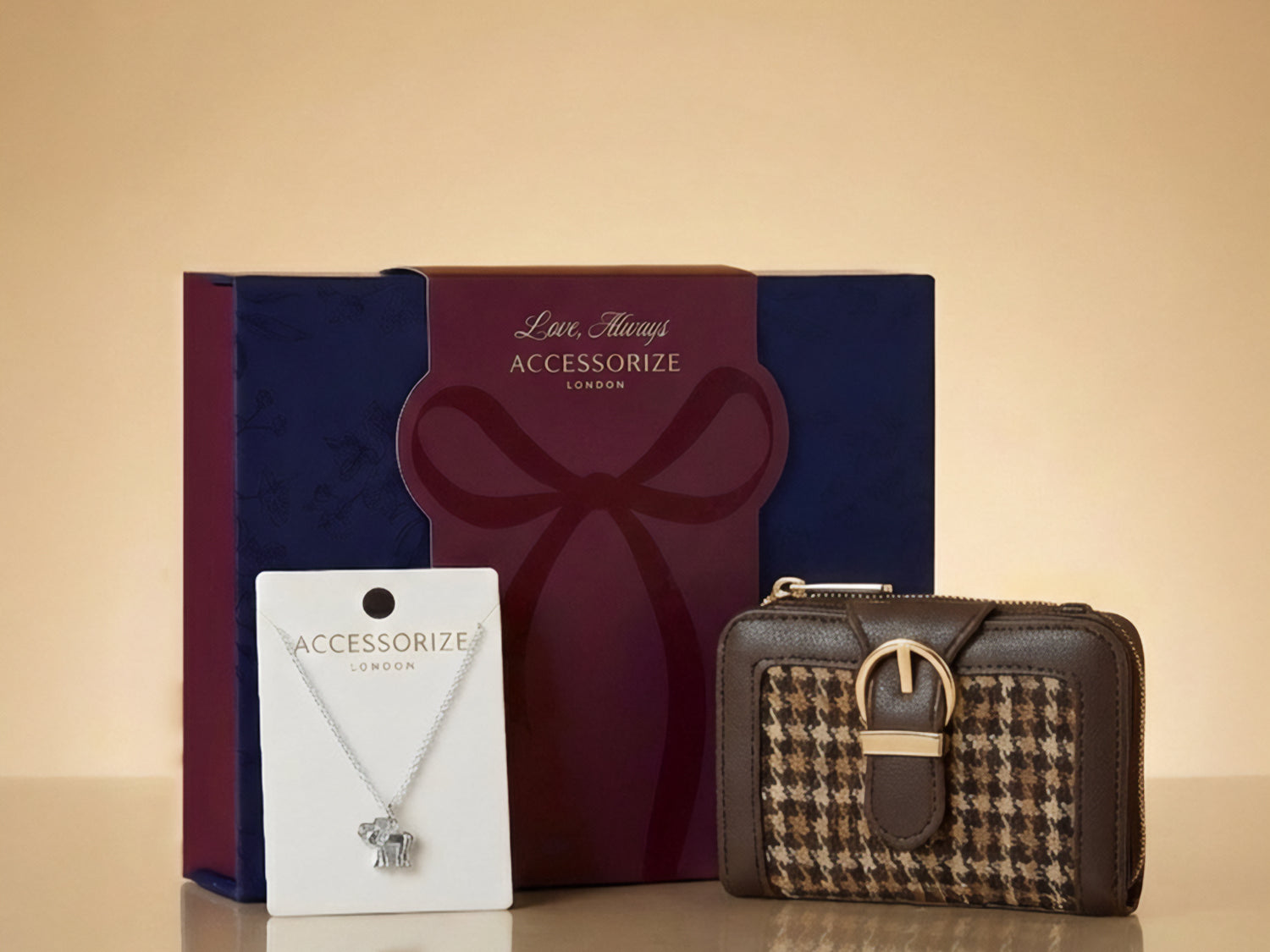 A thoughtfully curated duo that blends romance with everyday elegance. The delicate silver-toned charm necklace adds a soft, sentimental touch, while the structured houndstooth wallet brings timeless sophistication and functionality. Together, they strike the perfect balance of emotional warmth and practical luxury—ideal for gifting someone special or celebrating self-love this Valentine’s Day.