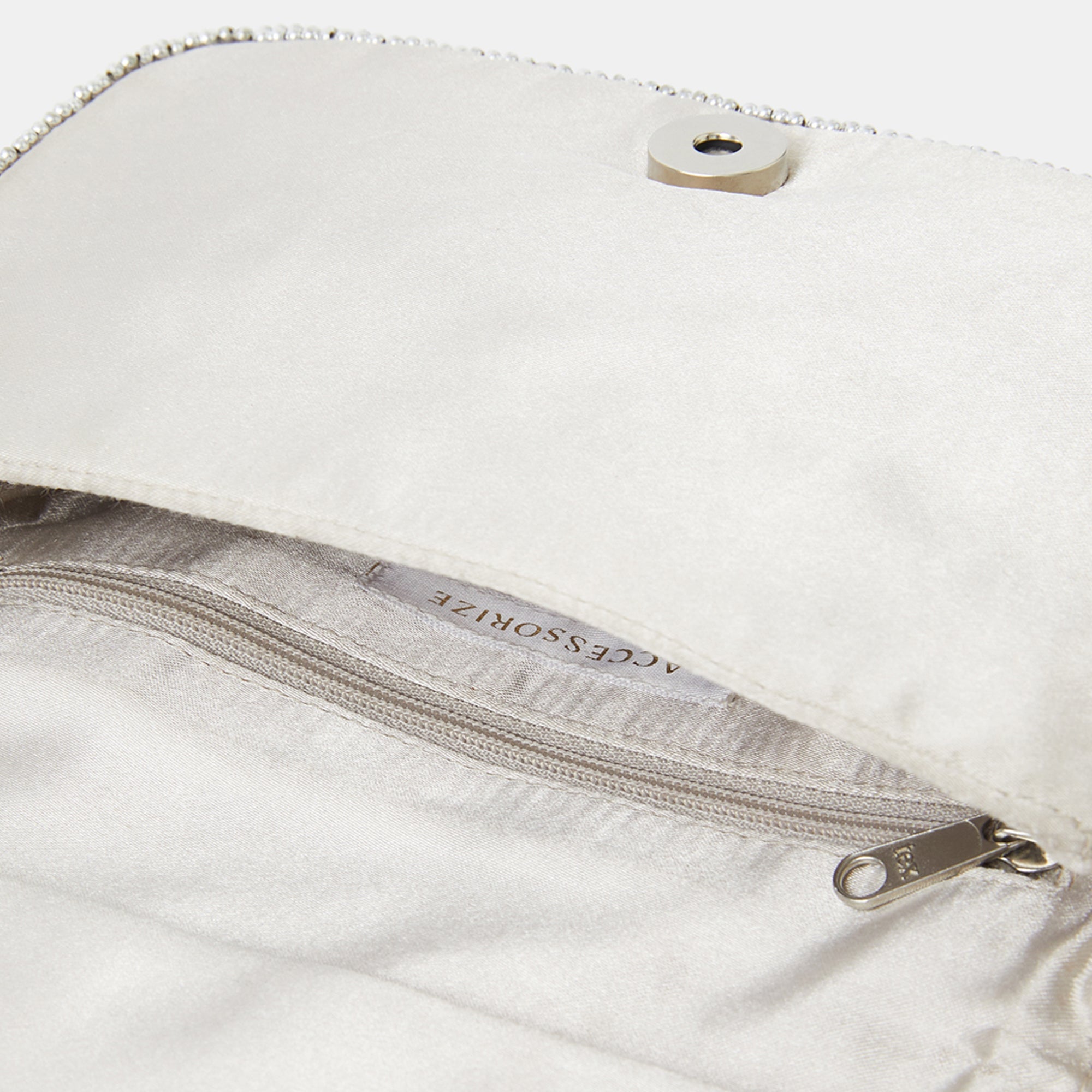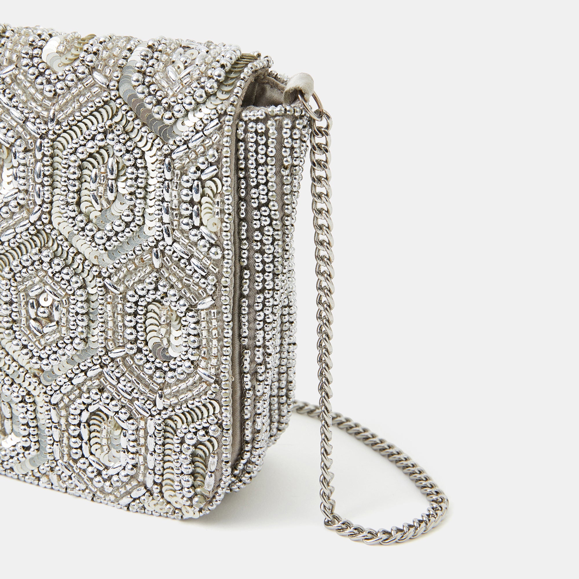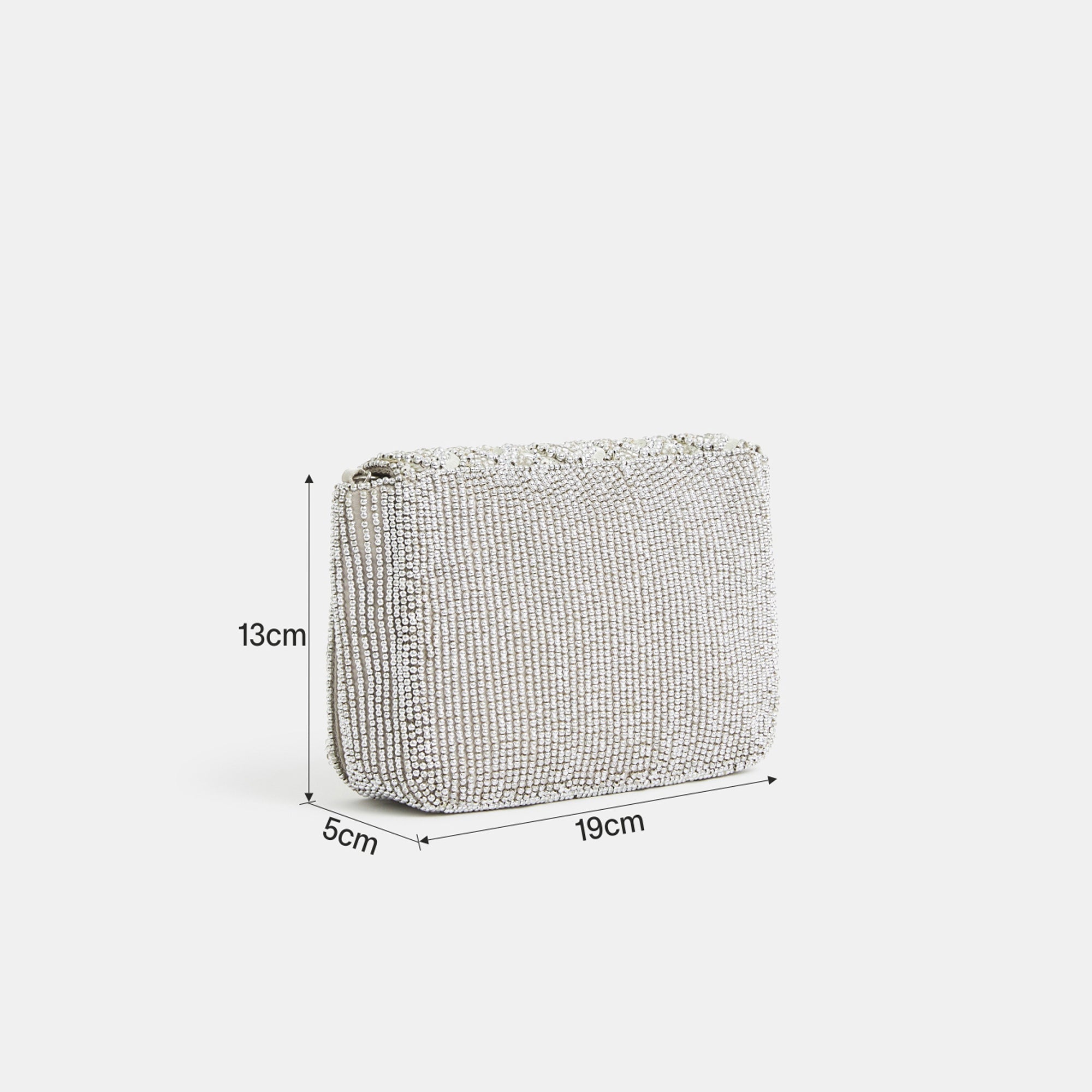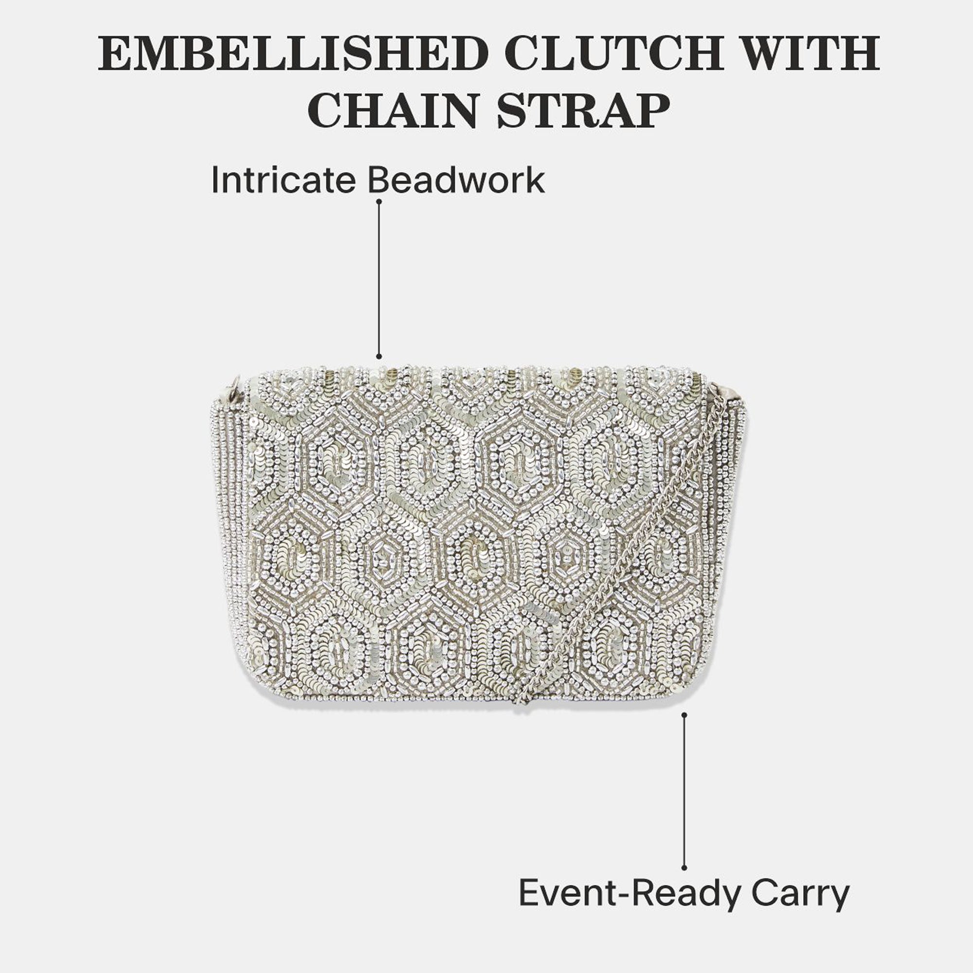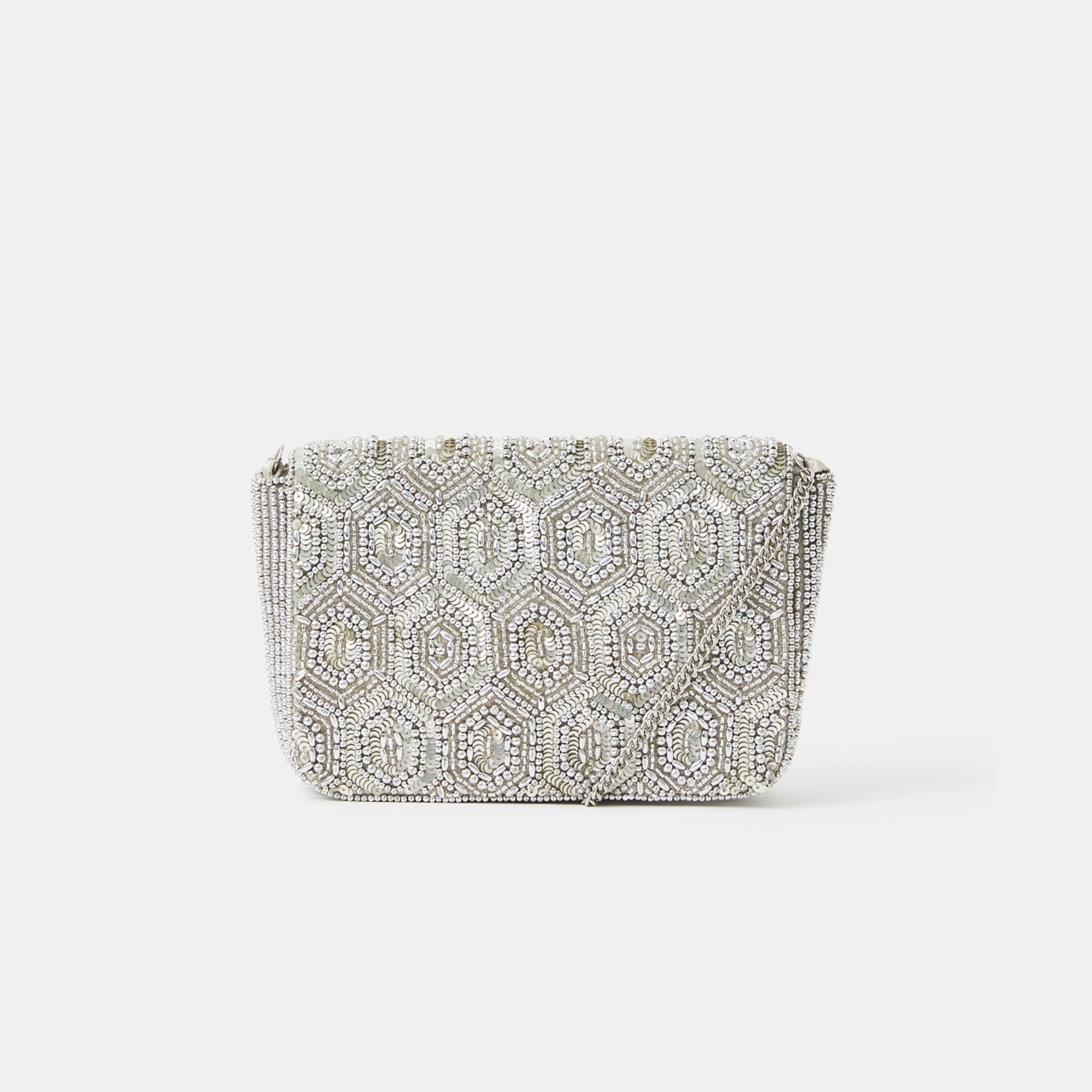 Decorated with dazzling sequins and beads in hexagonal patterns, this clutch bag is the perfect plus-on for all your evening 'fits. Designed in a fold-over profile with an optional chain strap. Fastens with a magnetic button.