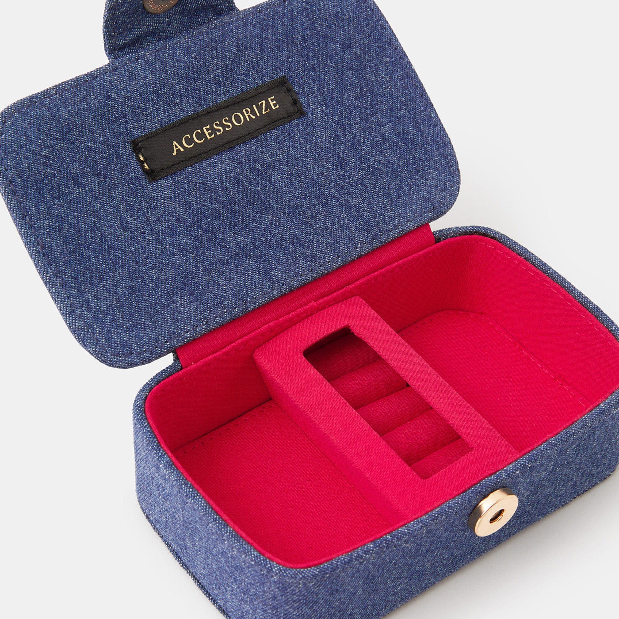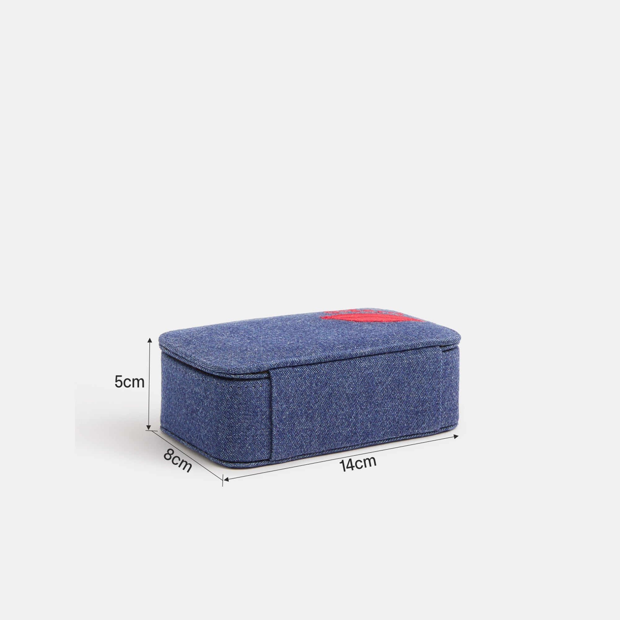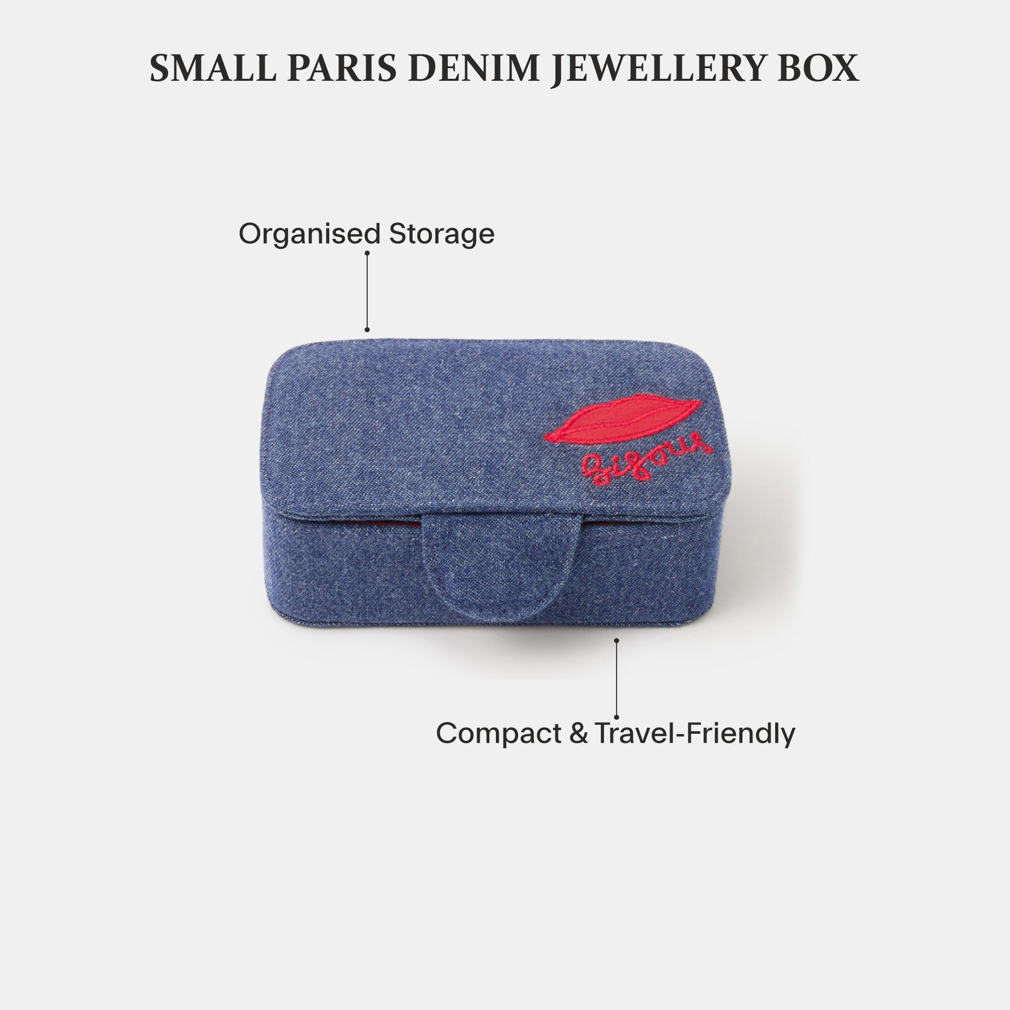 Keep your precious pieces safe in style with this Small Paris Denim Jewellery Box. Crafted in soft denim with playful embroidered red lips and “Bisous” script, it adds a chic Parisian touch to your storage collection. Compact yet practical, it features dedicated slots and compartments to organise rings, earrings, and delicate chains. Perfect for home use or travelling, this jewellery box is a stylish companion for every jewellery lover.