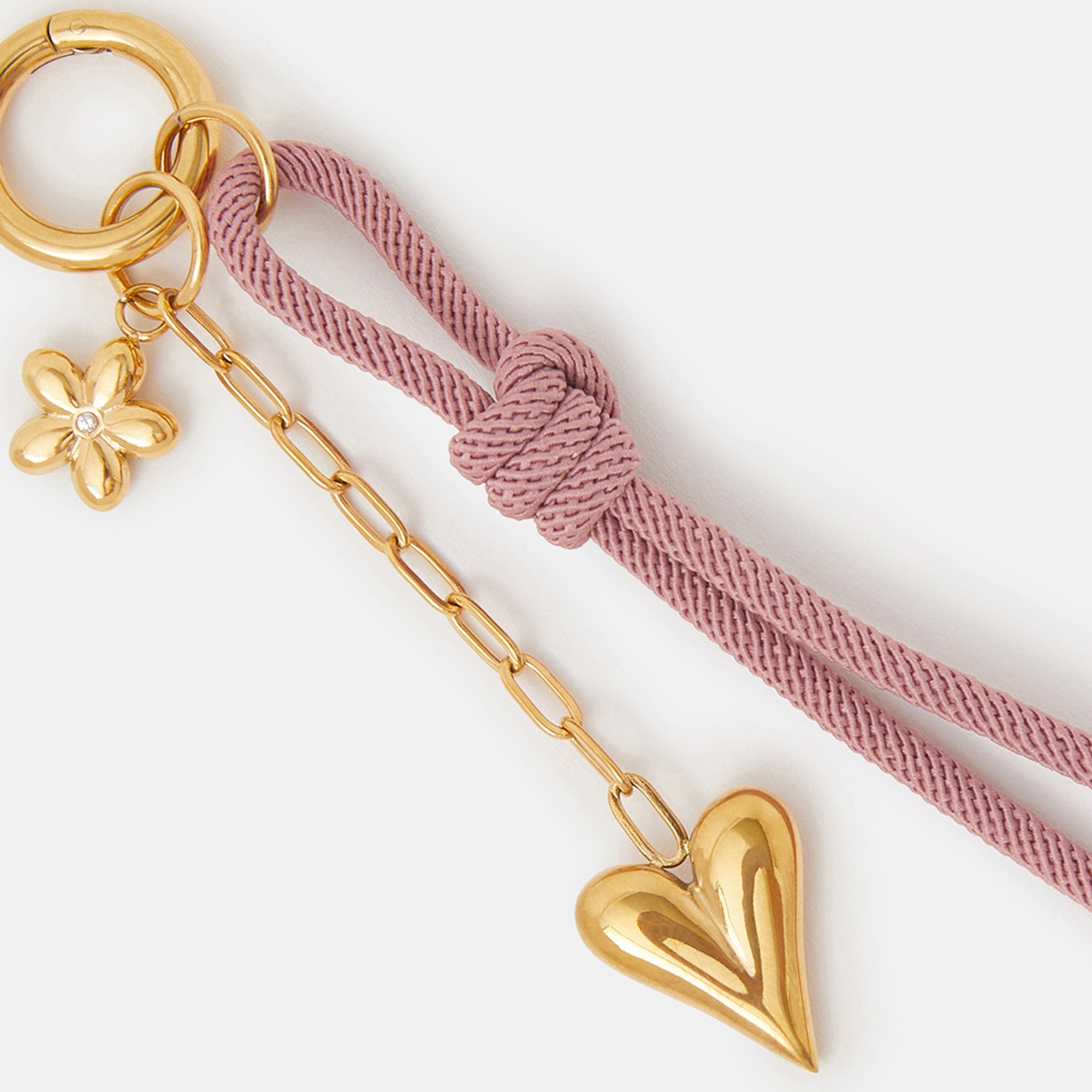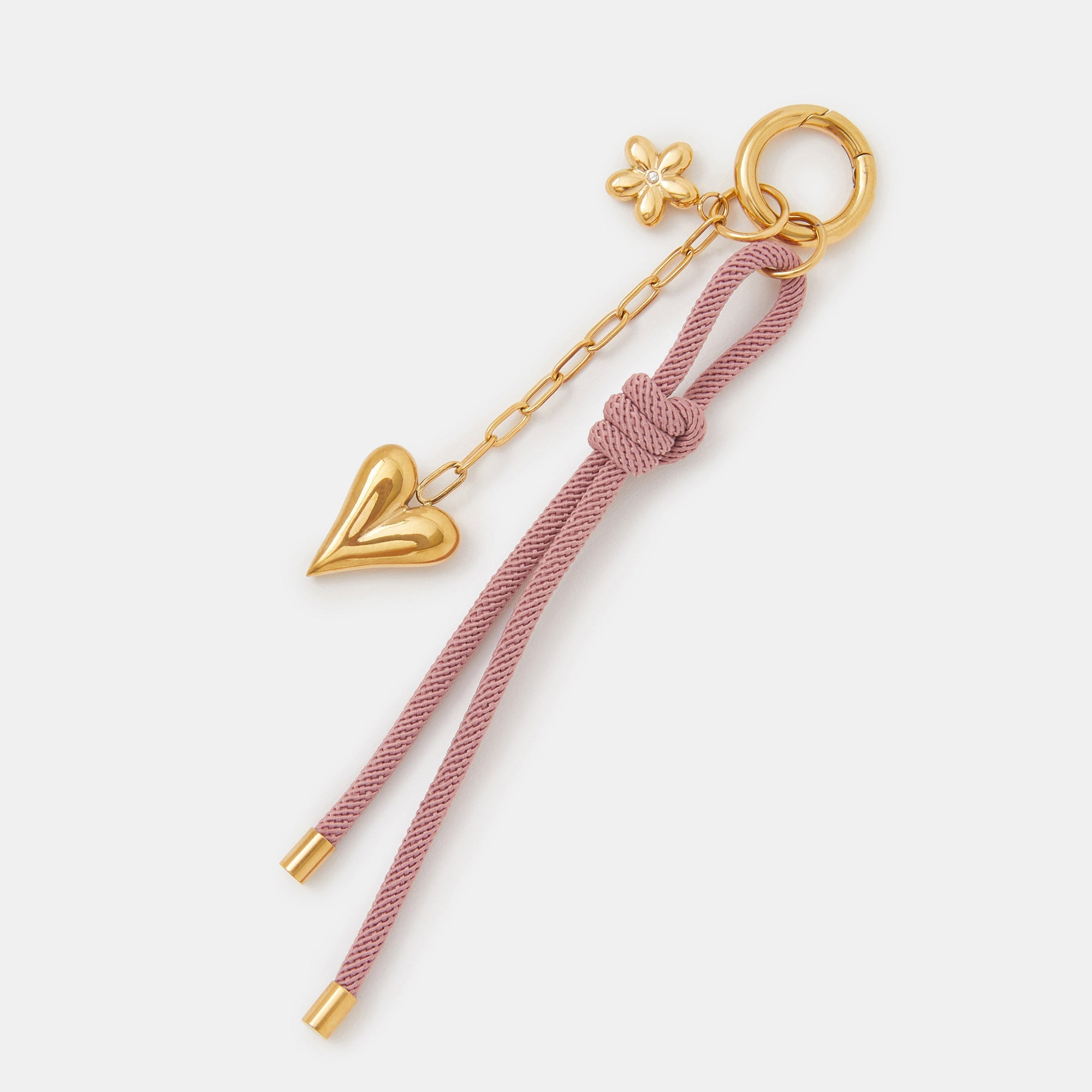 Looking for a way to jazz up your everyday tote? This bag charm is the answer. Made from gold-tone stainless steel for a durable finish, it features a small flower, chain heart and pink cord dangling from the round clip fastening.