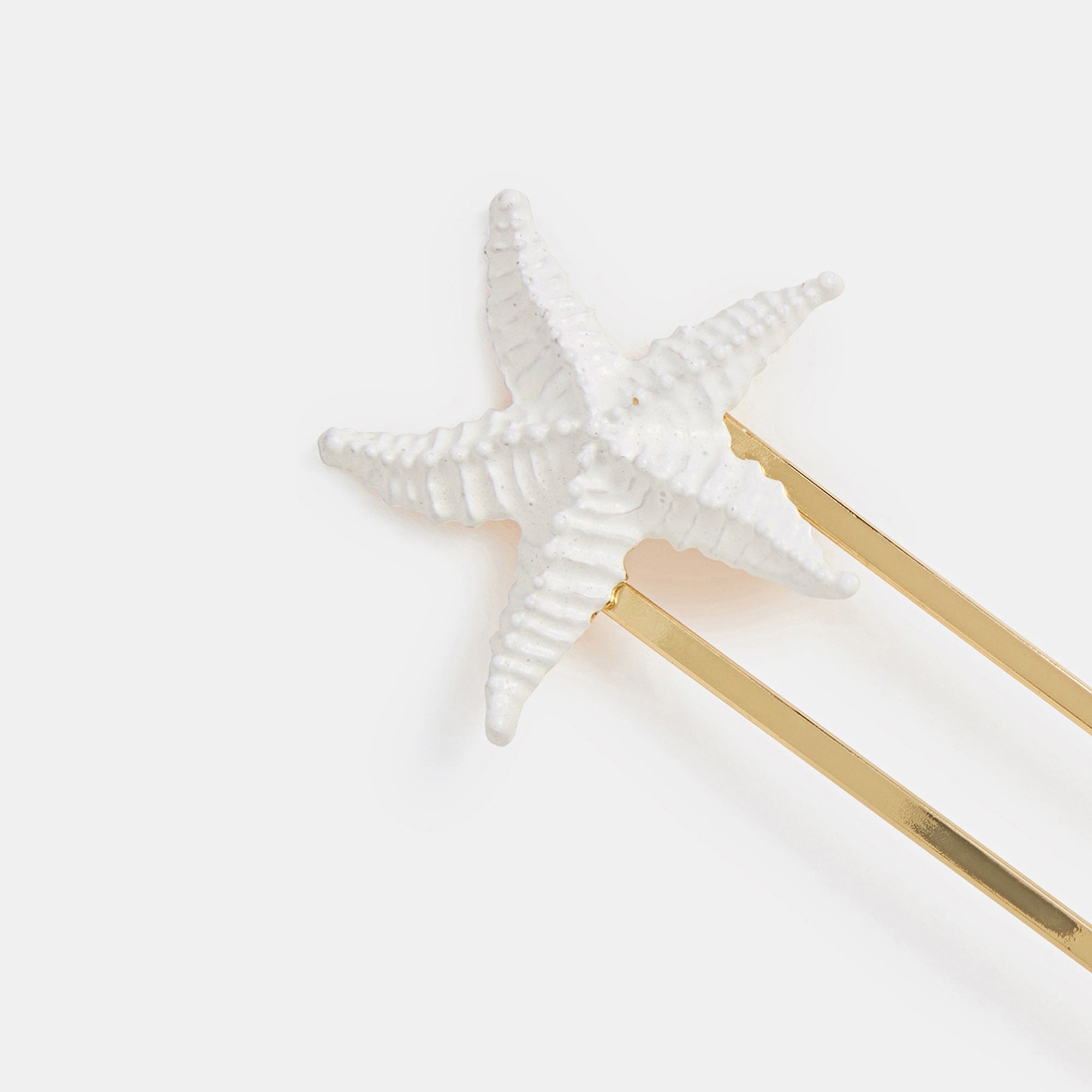 Secure all your summertime updos the mermaid way. Dipped in gold, this french pin showcases a white starfish for the ultimate beach babe finish. Hurry, your beachy waves are waiting.