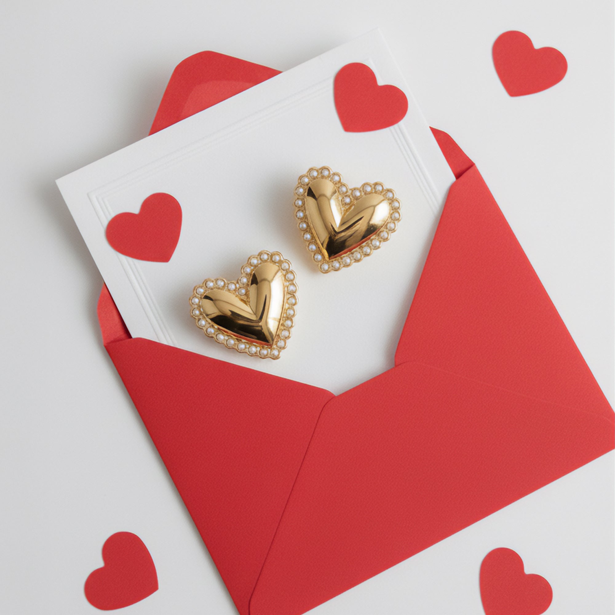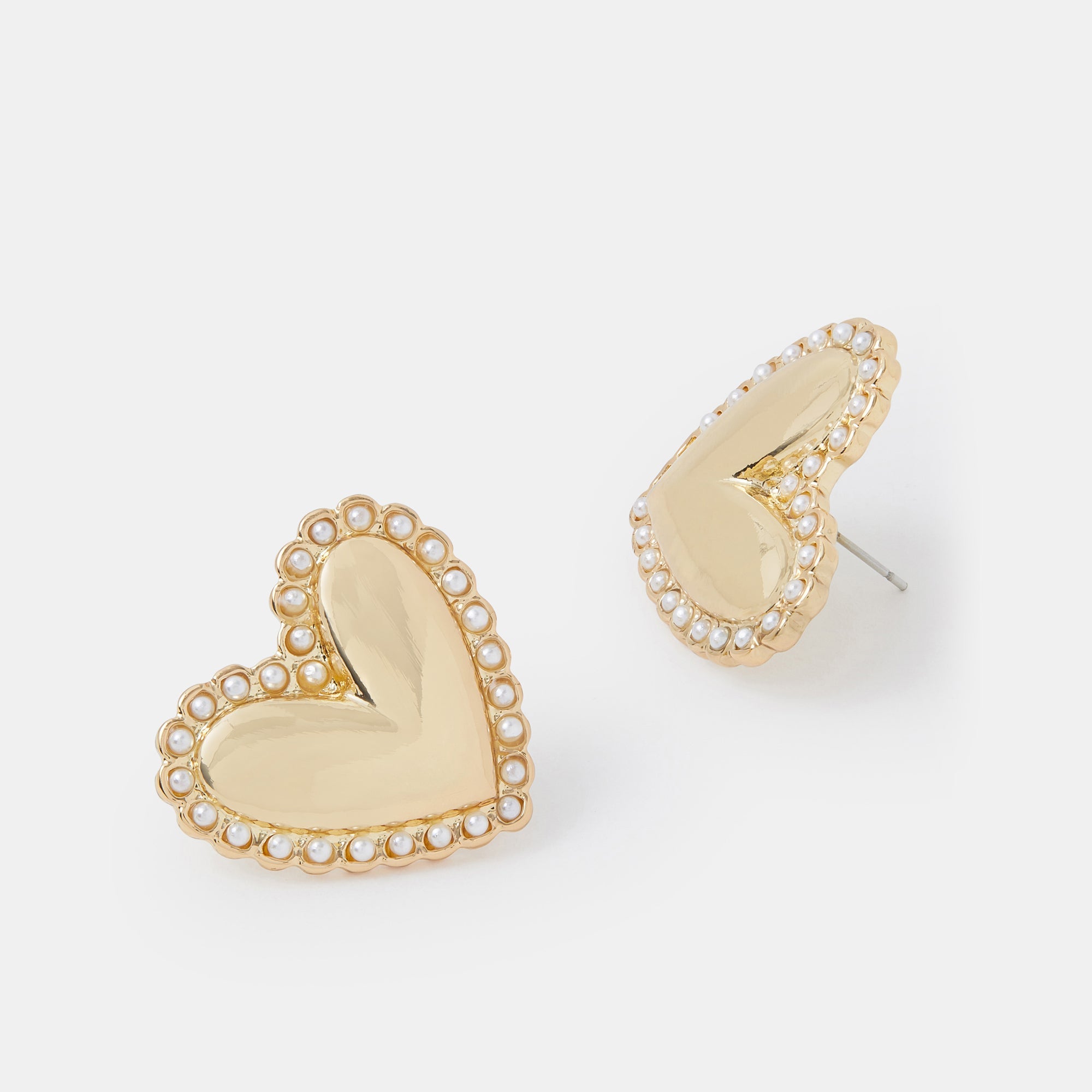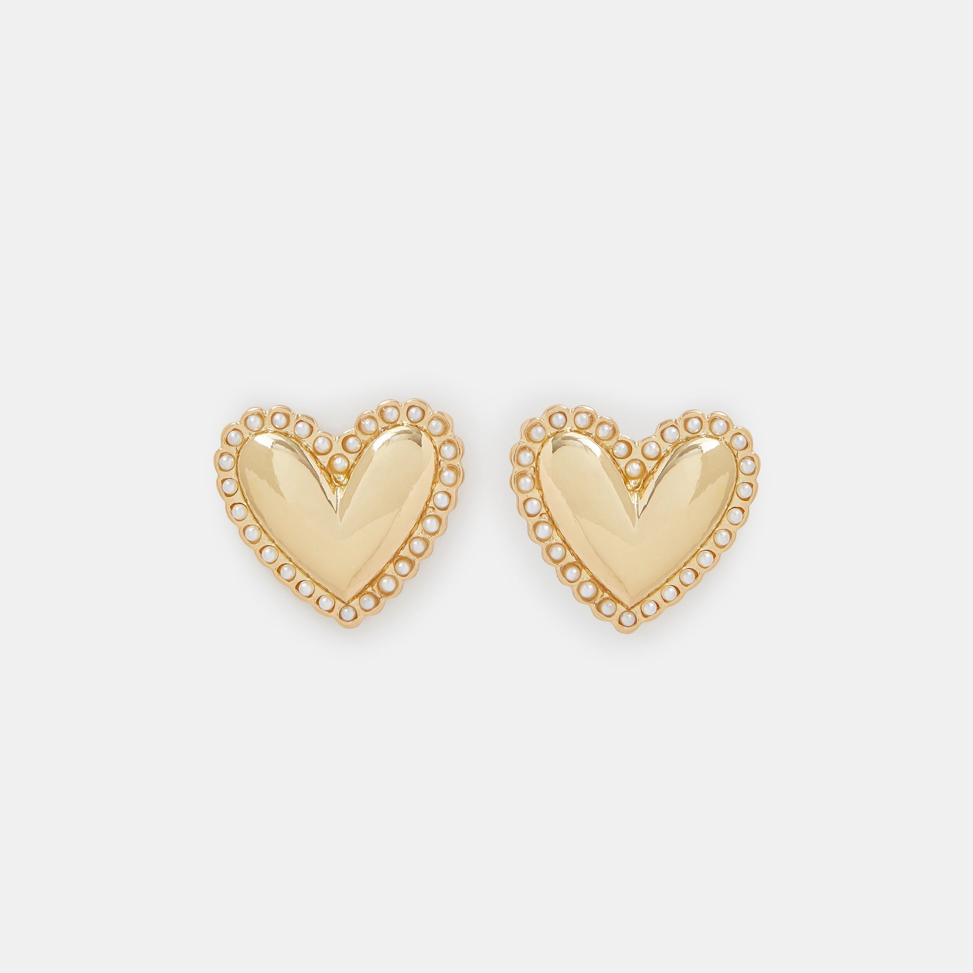 These stud earrings feature a polished gold heart for a bold, romantic statement. The heart is beautifully framed by a border of delicate faux pearls, adding an element of classic elegance