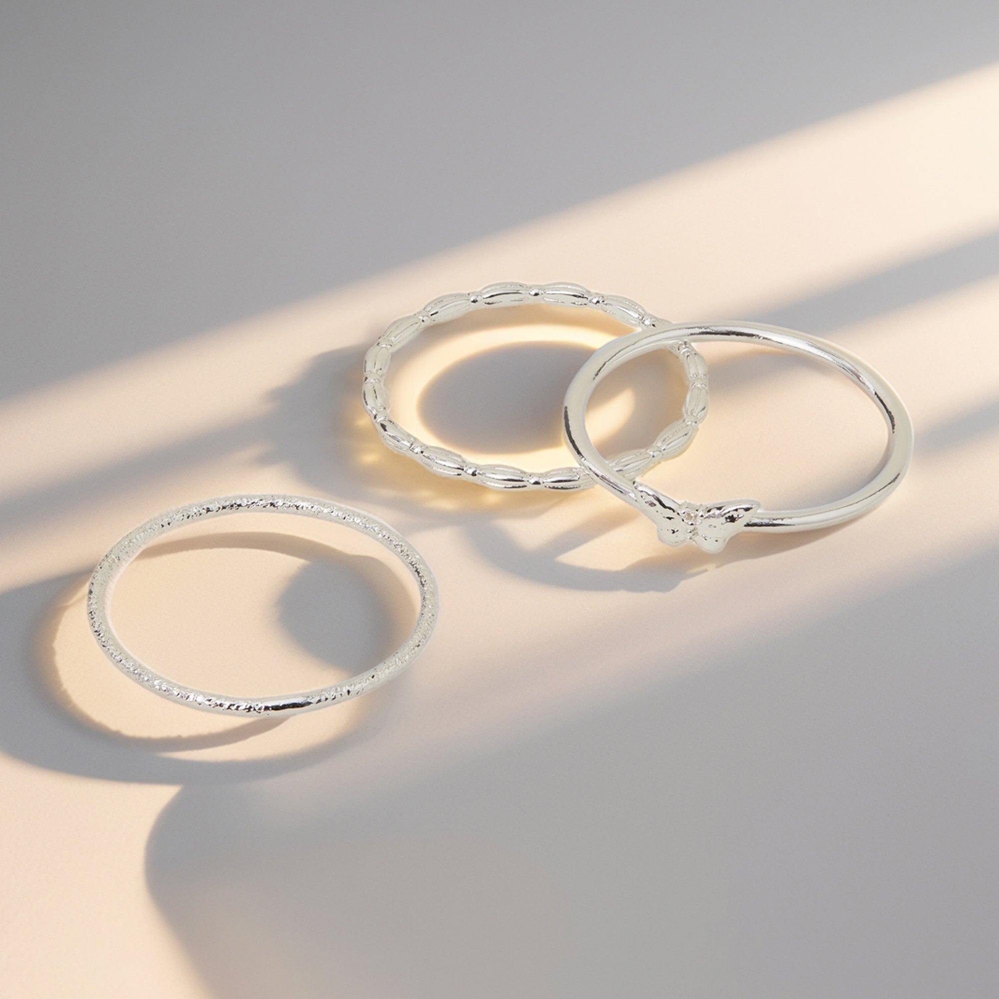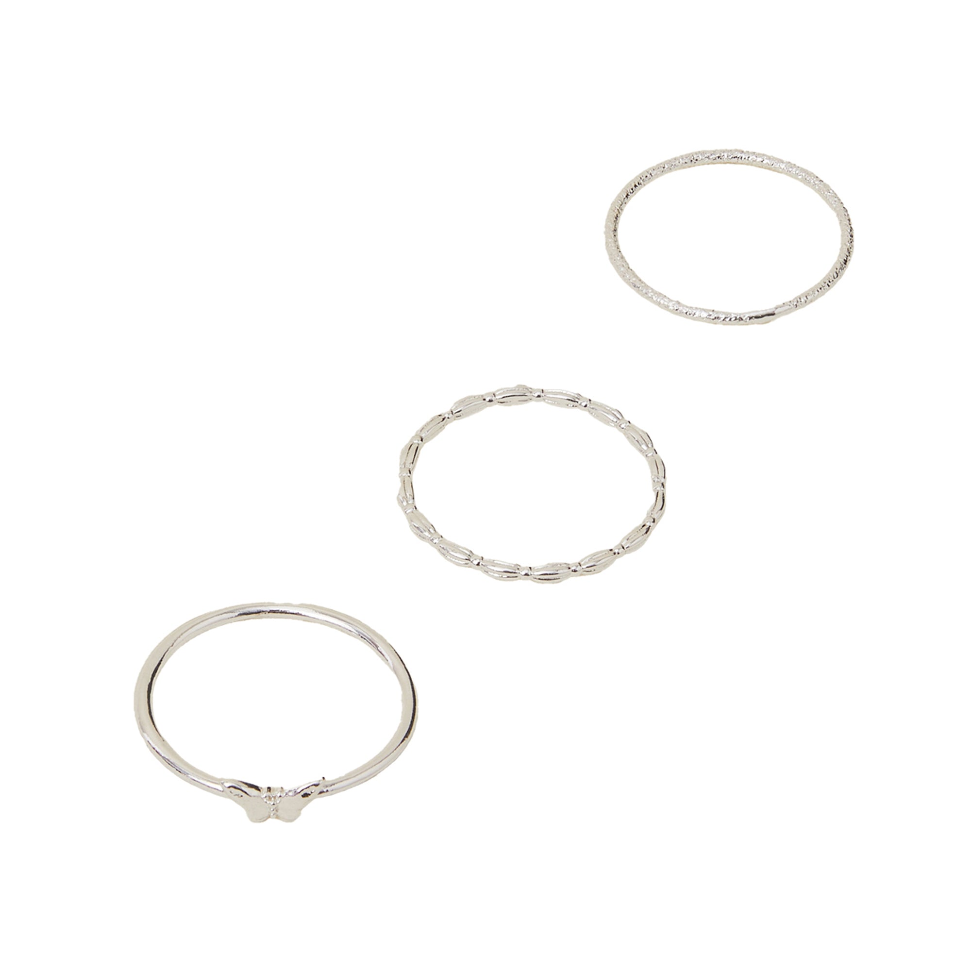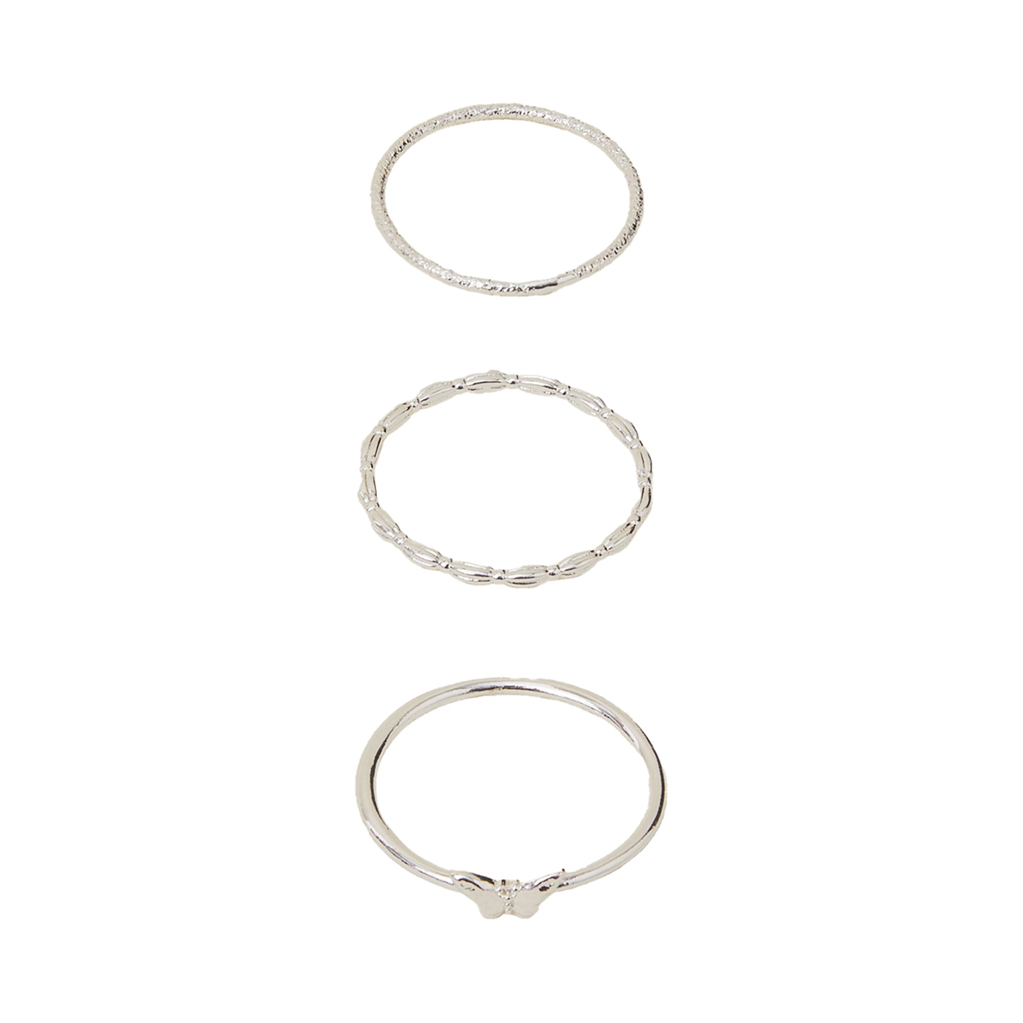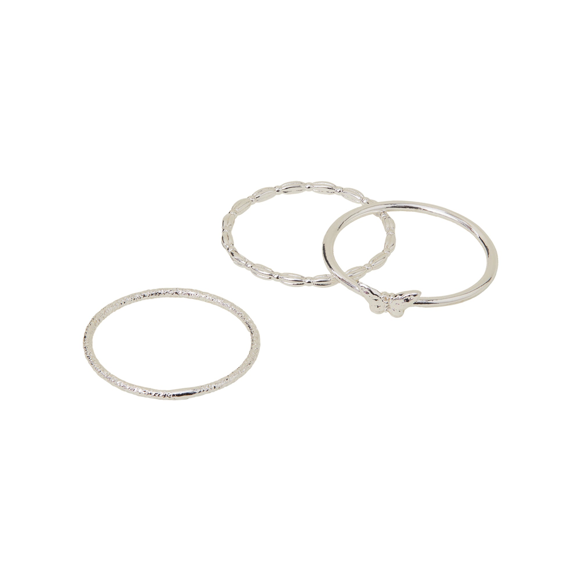 A trio of rings ready for finger stacking. Featuring two pieces with decorative forms and textured finishes, the third showcases a butterfly motif at the centre. All dipped in sterling silver to give them extra sparkle and shine. Three included. Silver