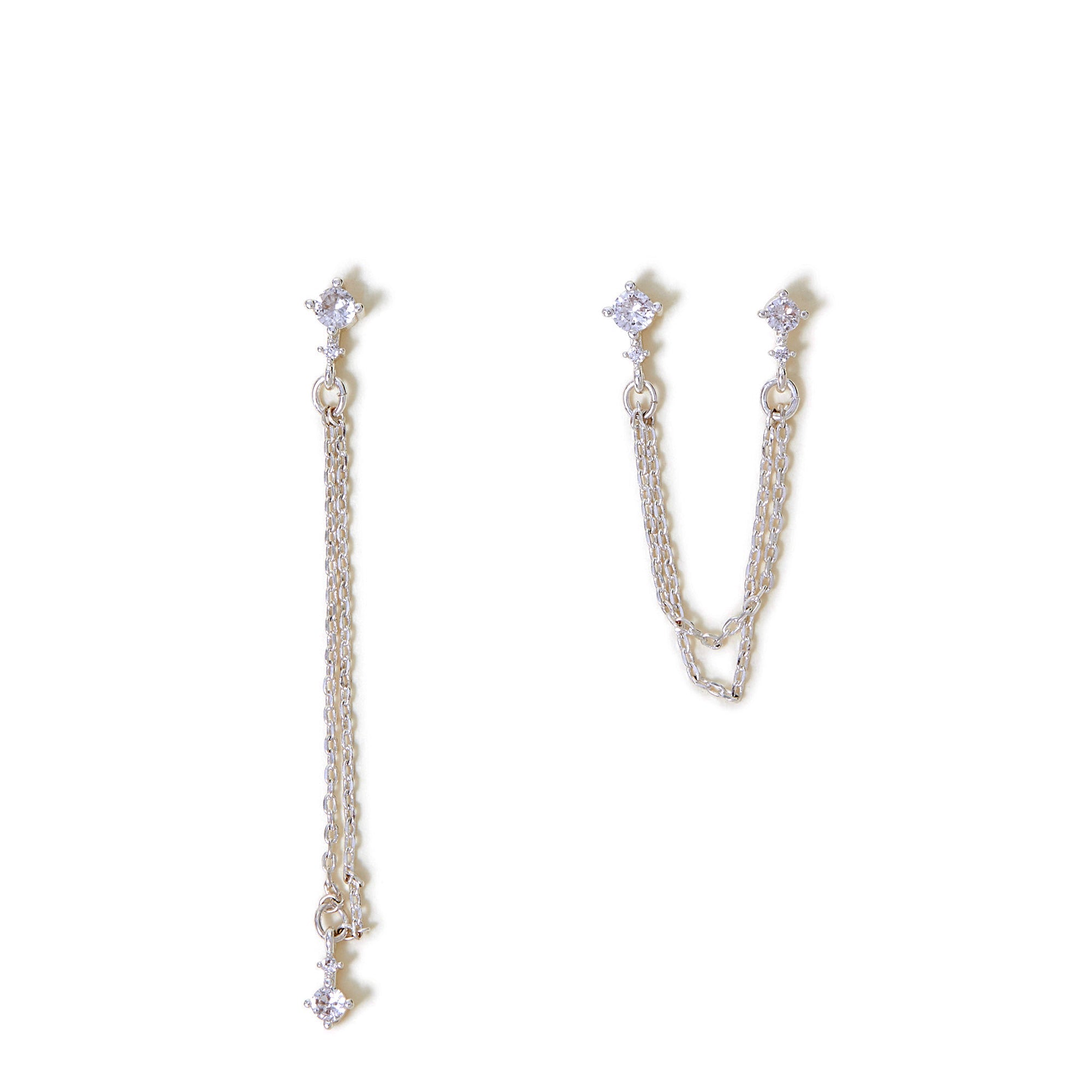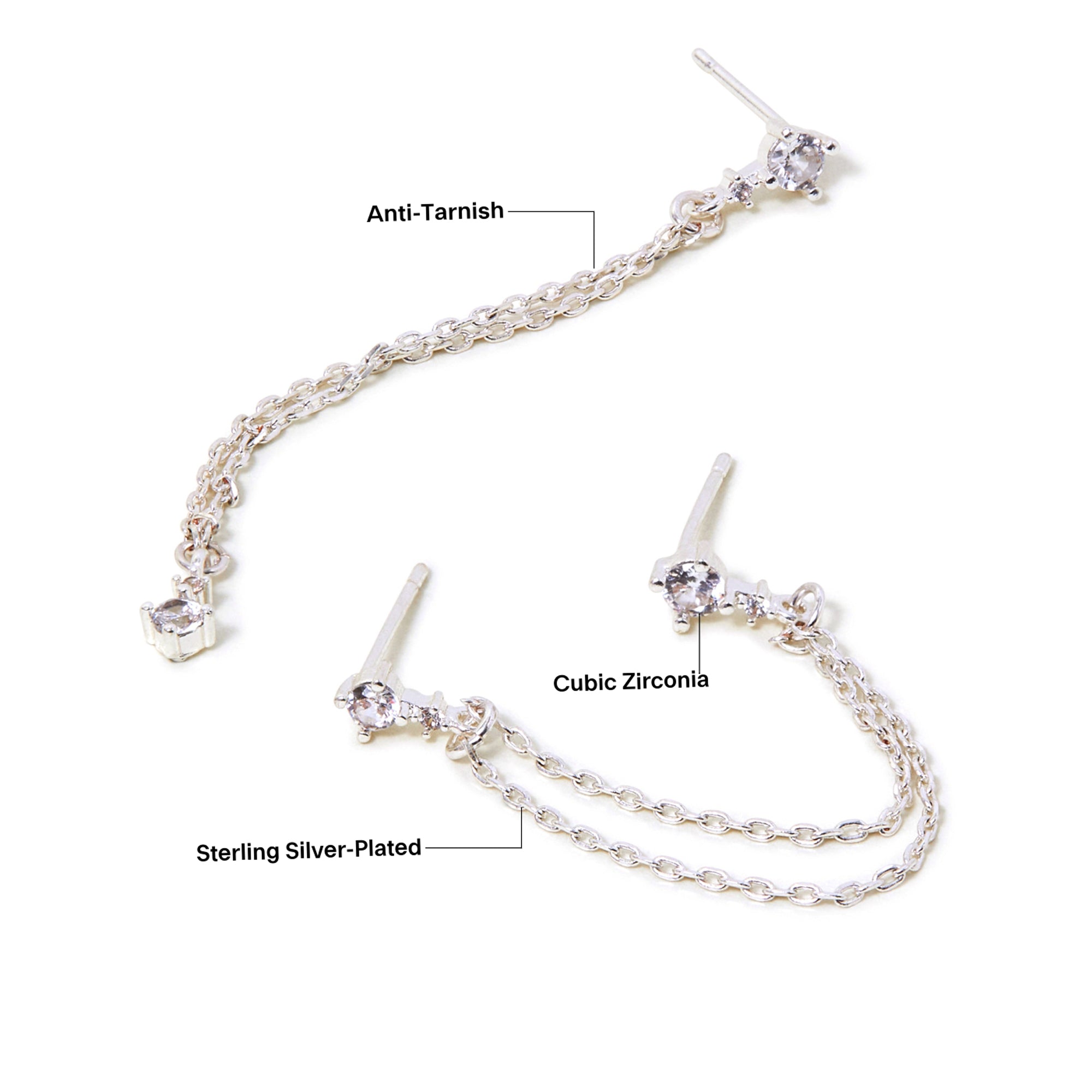These Silver-Plated earrings feature delicate chains linked with sparkling diamante studs. The asymmetrical drop design adds a modern twist, perfect for elevating both everyday and evening looks. The Post and Back lock offers both security and ease of wear, providing a comfortable fit while keeping the earrings securely in place