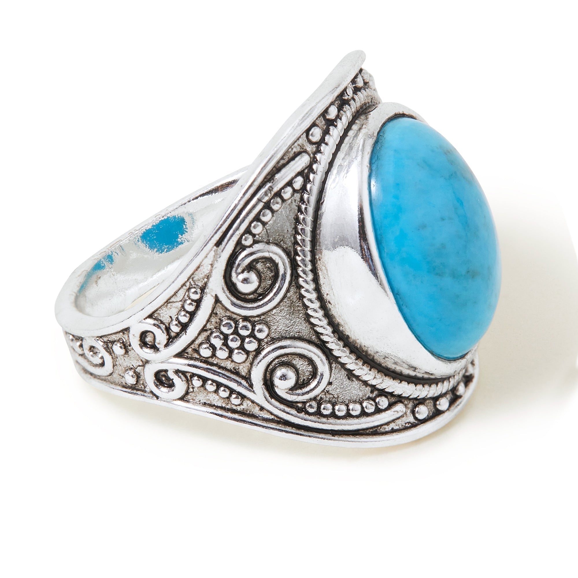 Sitting centre of the intricately etched band, this ring is designed in with a sterling silver coating and a turquoise stone to the centre. BlueSitting centre of the intricately etched band, this ring is designed in with a sterling silver coating and a turquoise stone to the centre. Blue