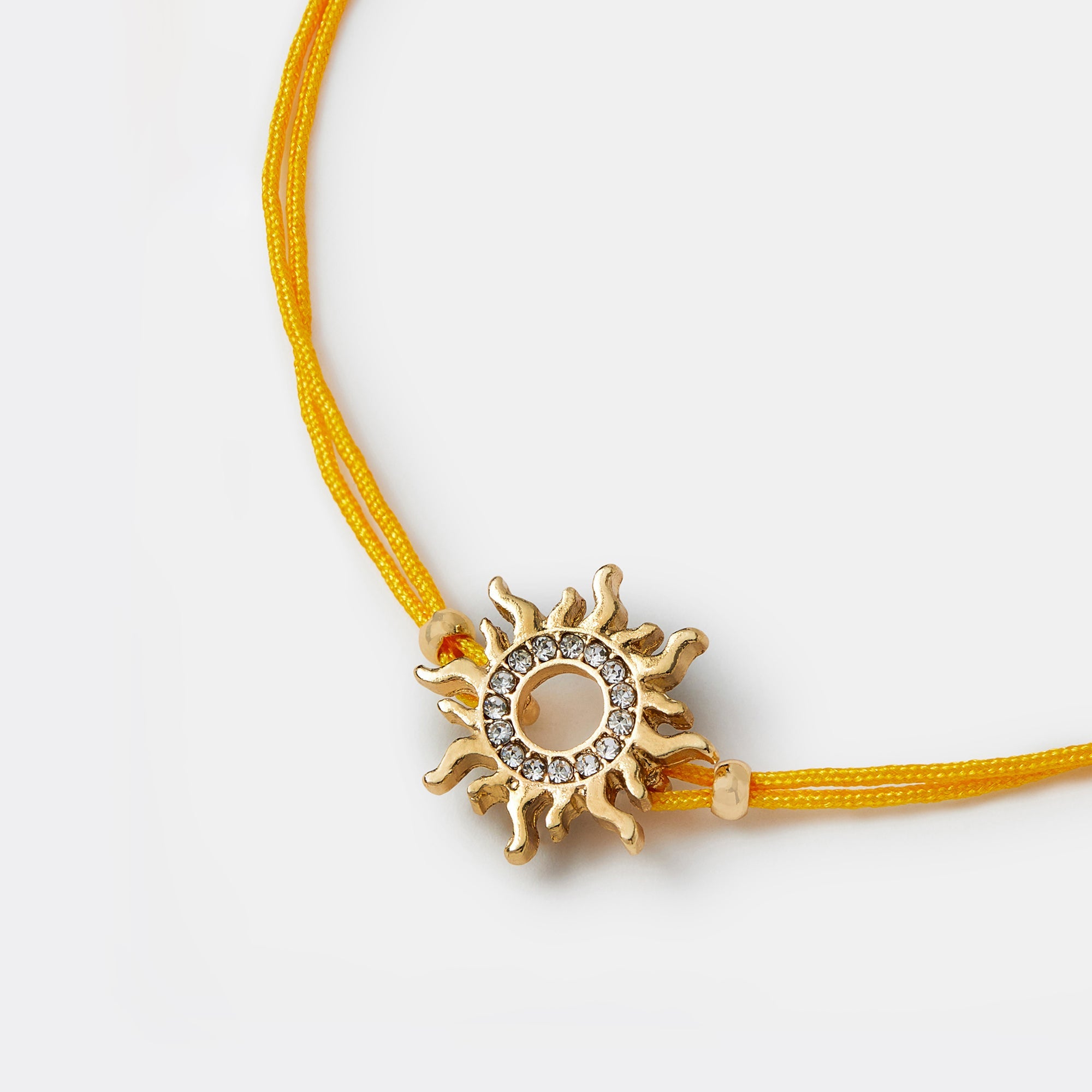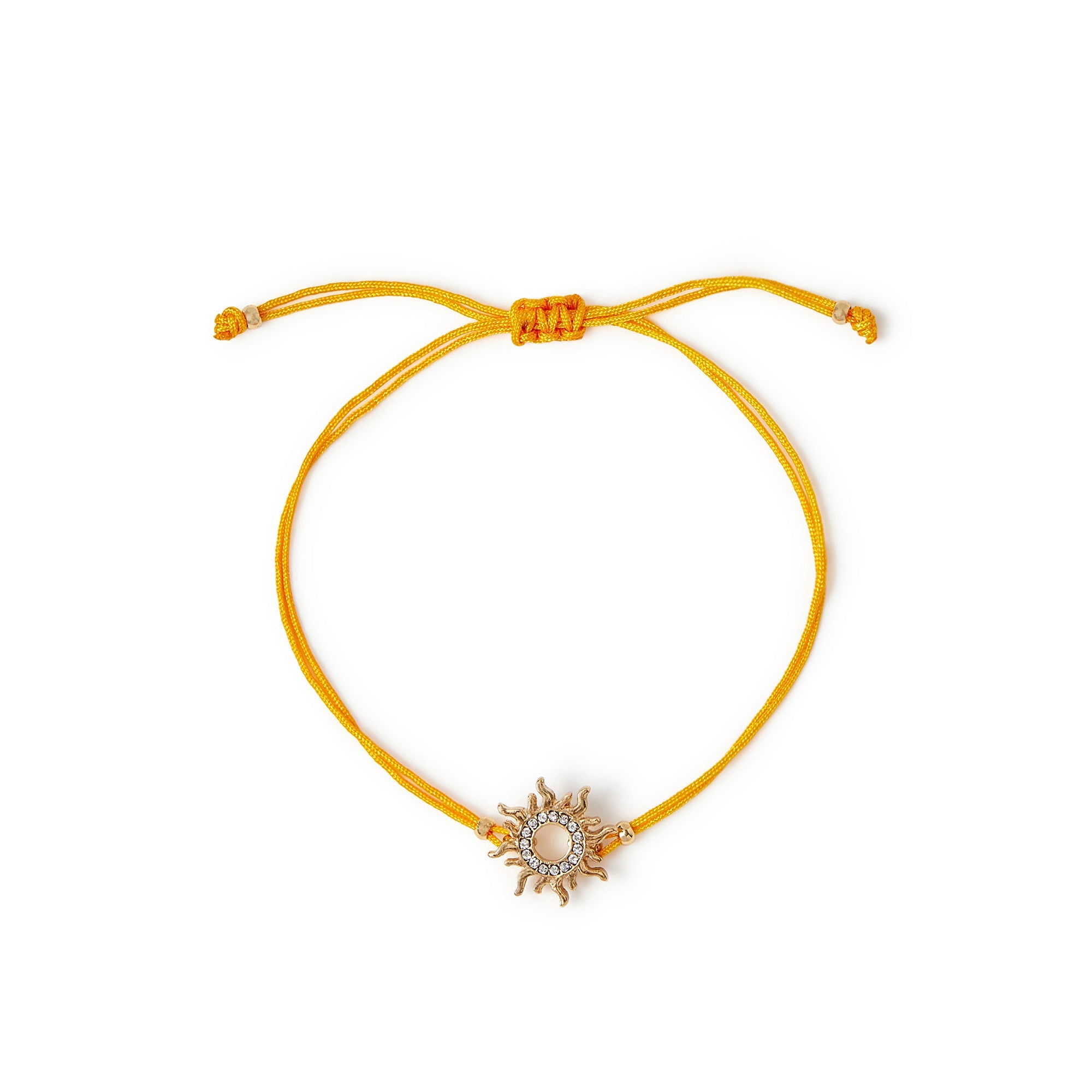 Designed in yellow cord and strung with a sun charm decorated with shimmery diamantes, this bracelet is a fun addition to your summer wardrobe. Fastens with adjustable cords.