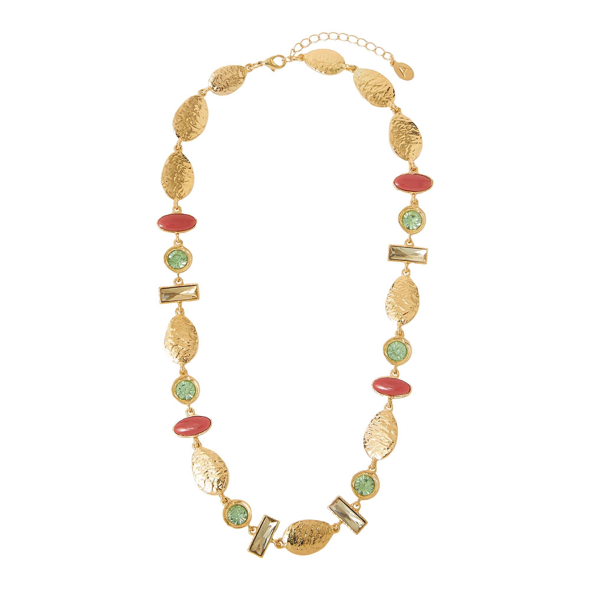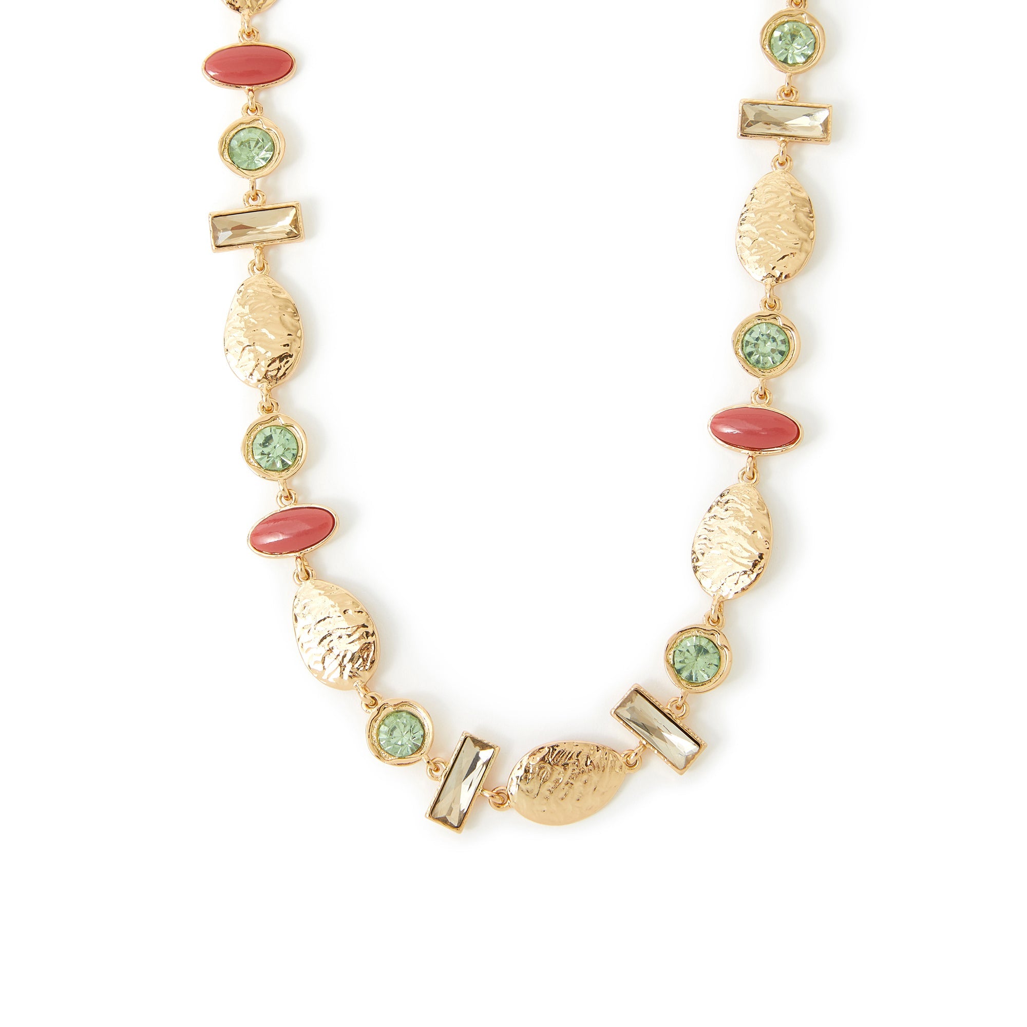 An easy way to jazz up plain T-shirts and dresses, this necklace is dipped in a golden tone and decorated with textured shapes and colourful gemstones