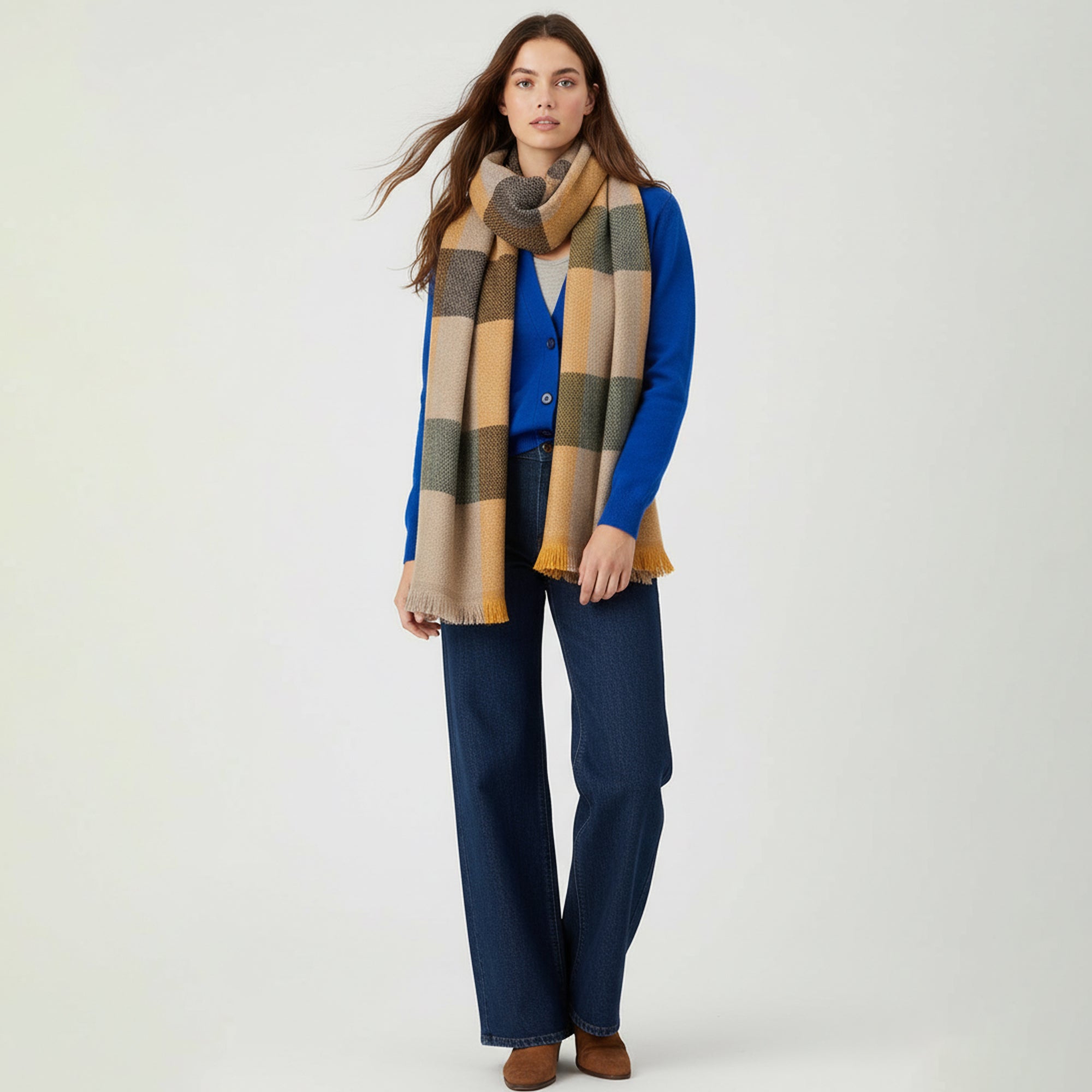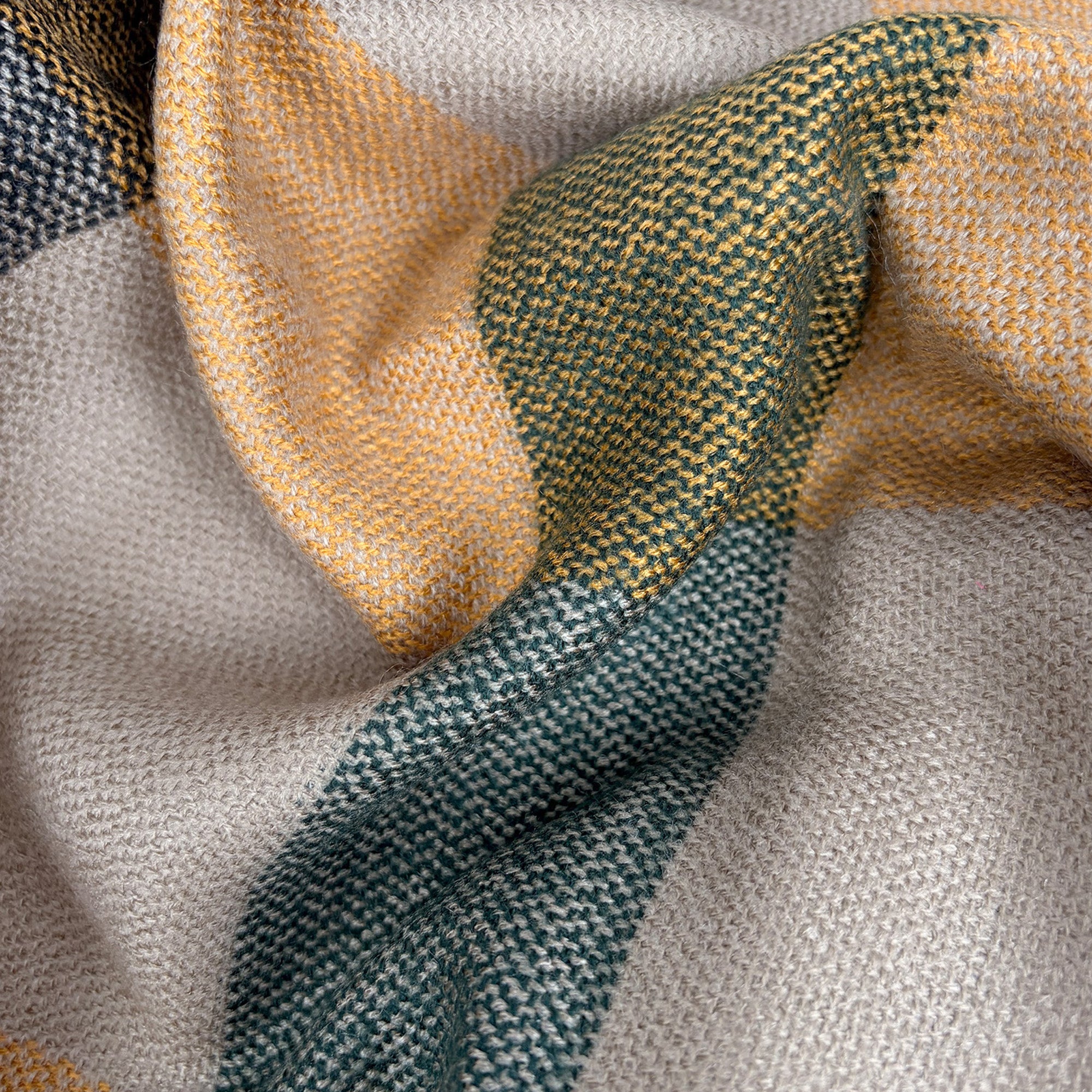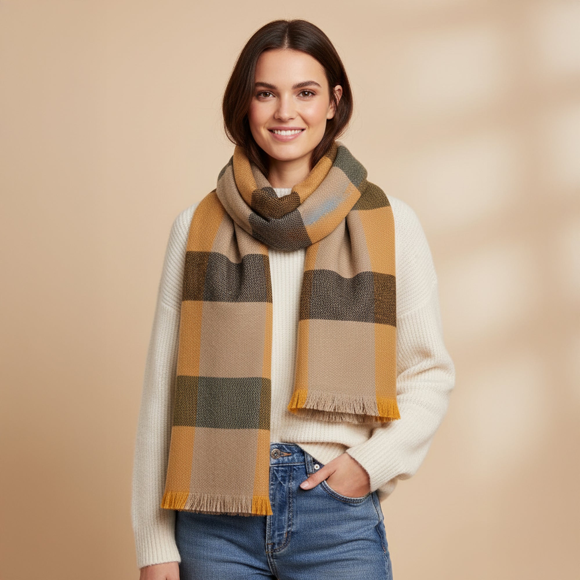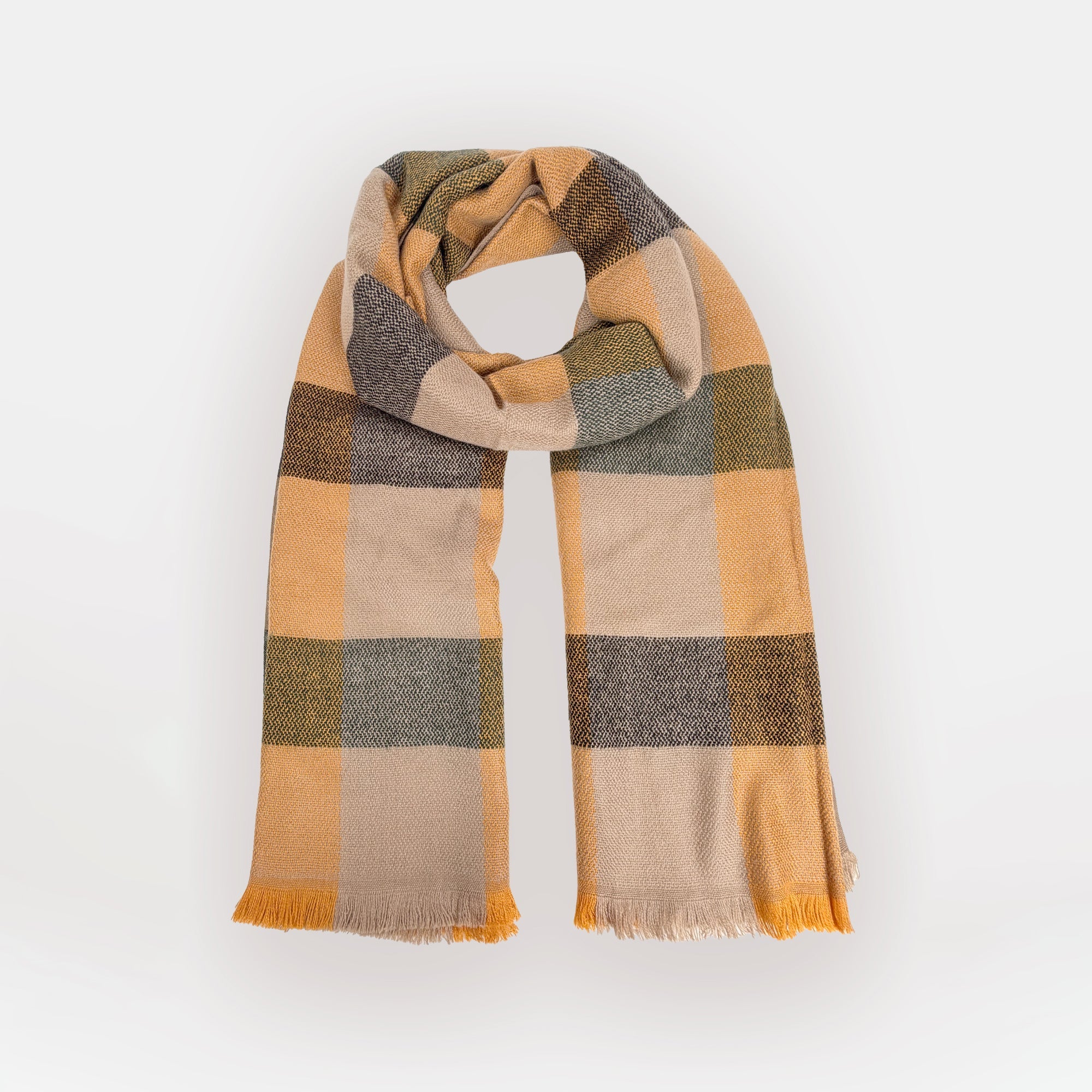This Timeless Checks Midweight Scarf offers classic style and cozy warmth with its sophisticated pattern in mustard, olive, and beige. It's the perfect essential accessory for effortlessly elevating your look during transitional weather.