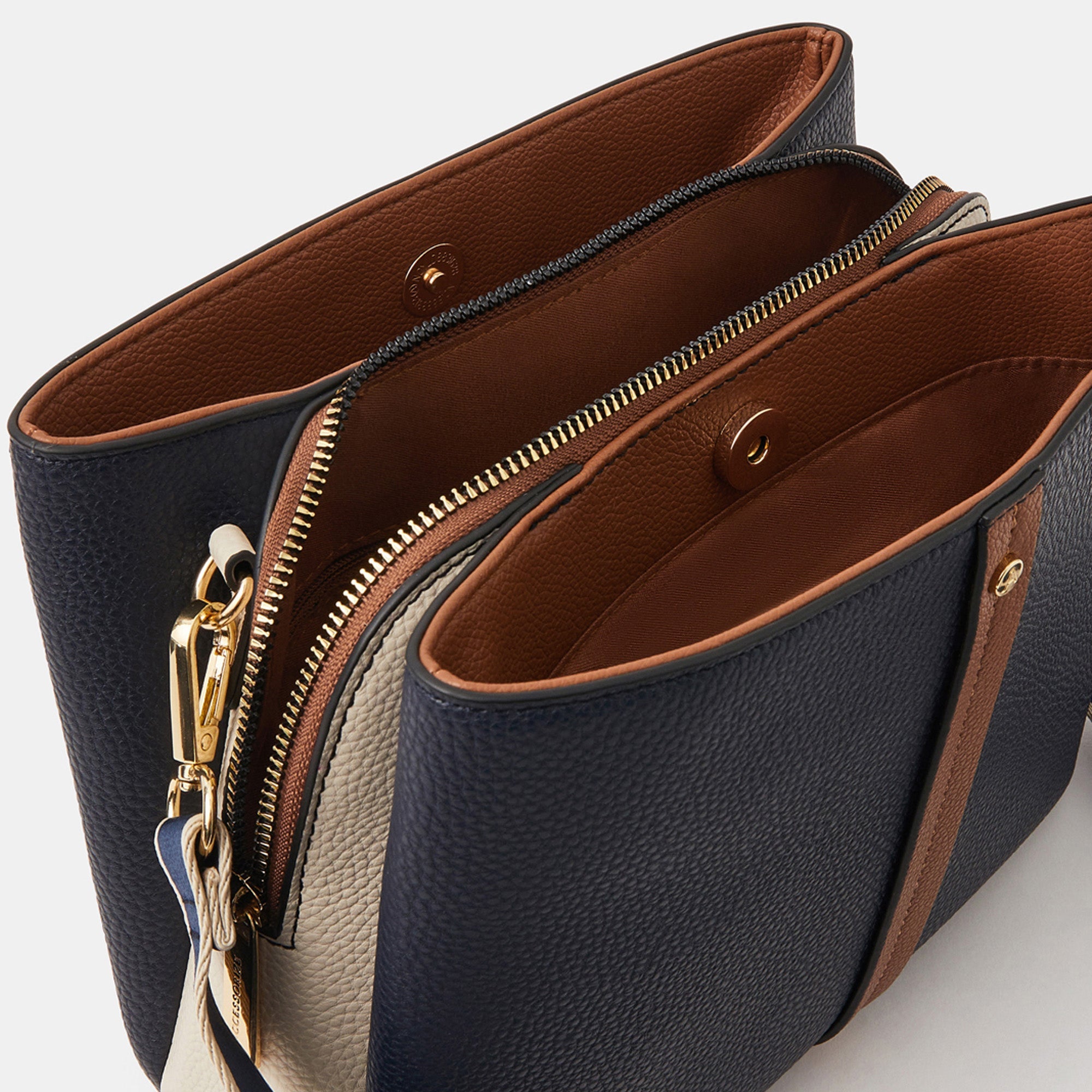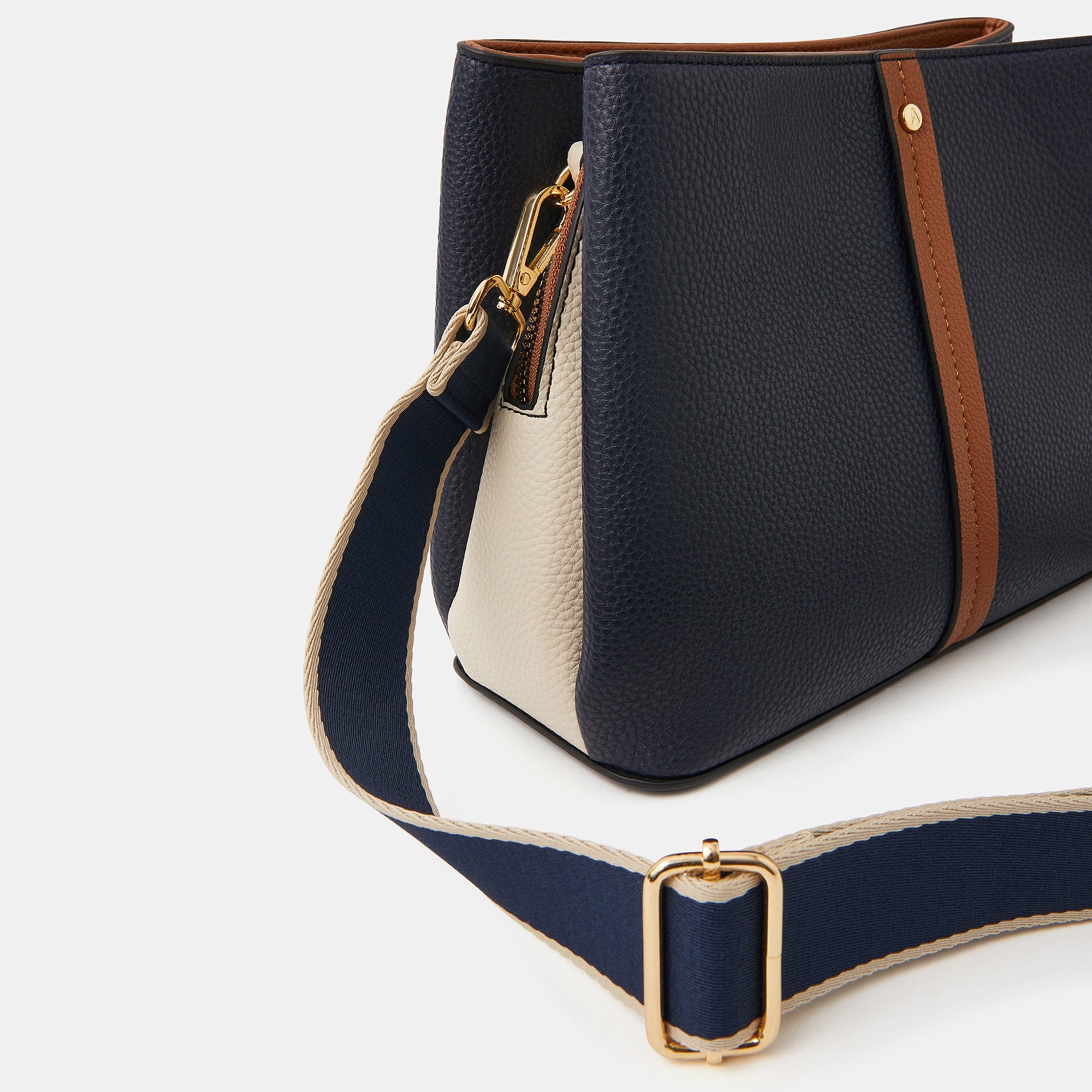 Goodbye messy bags, hello organisation! Featuring three compartments with zip and magnetic button fastenings, this crossbody is perfect for your everyday. Finished with an adjustable webbing strap.