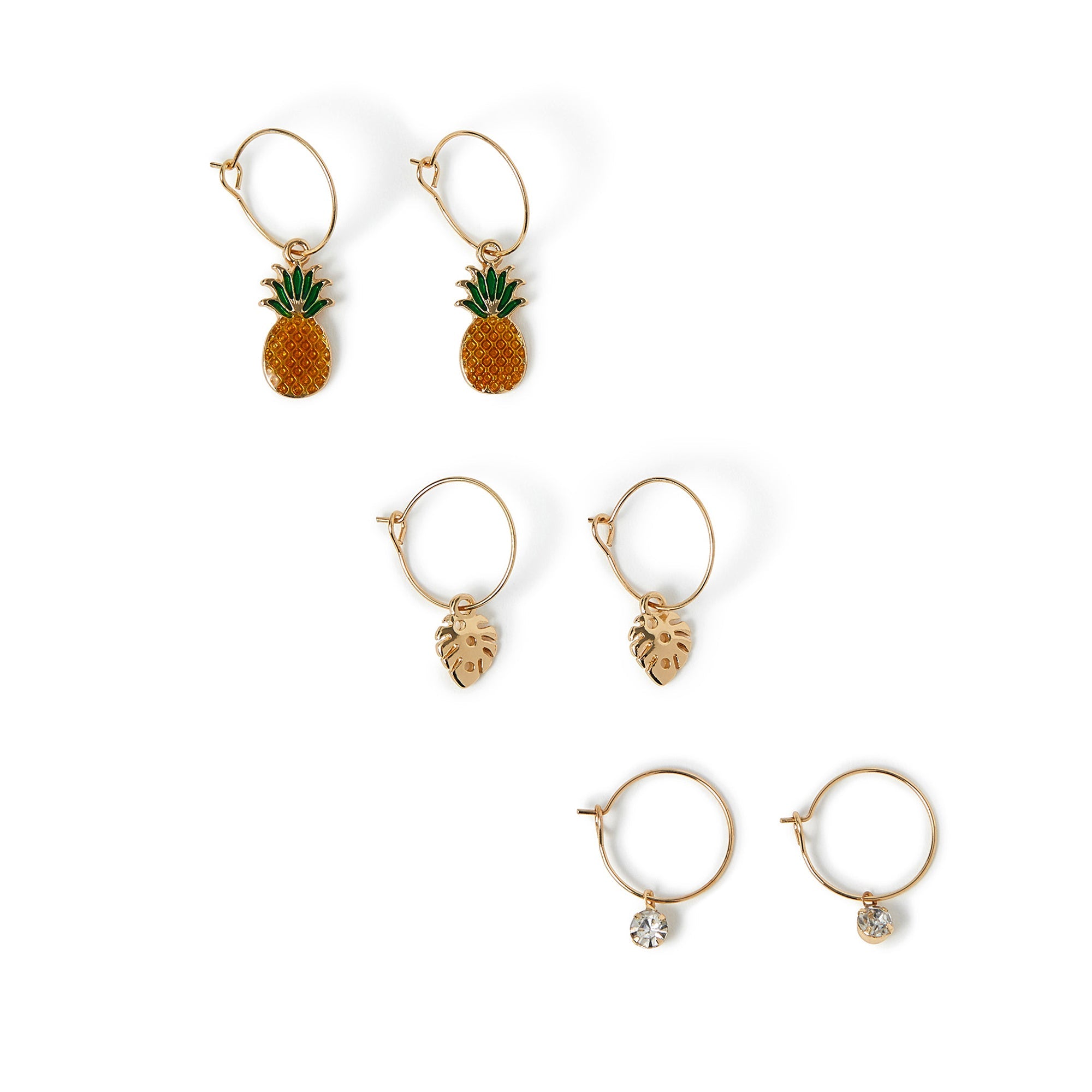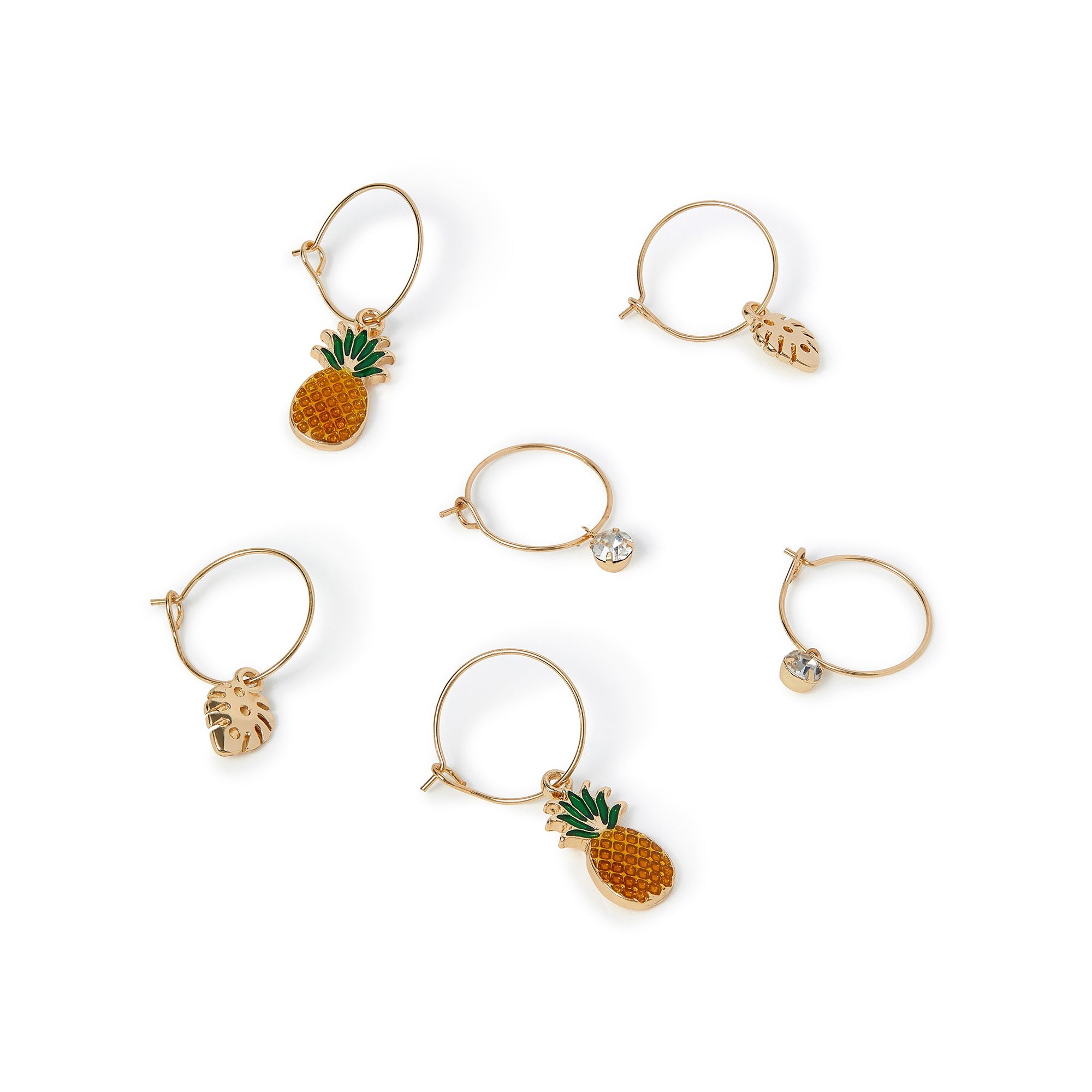 Made for showing off somewhere tropical (and beachside, preferably). Dipped in a golden tone, these wire hoops are decorated with pineapple, leaf and diamante charms. Three included.