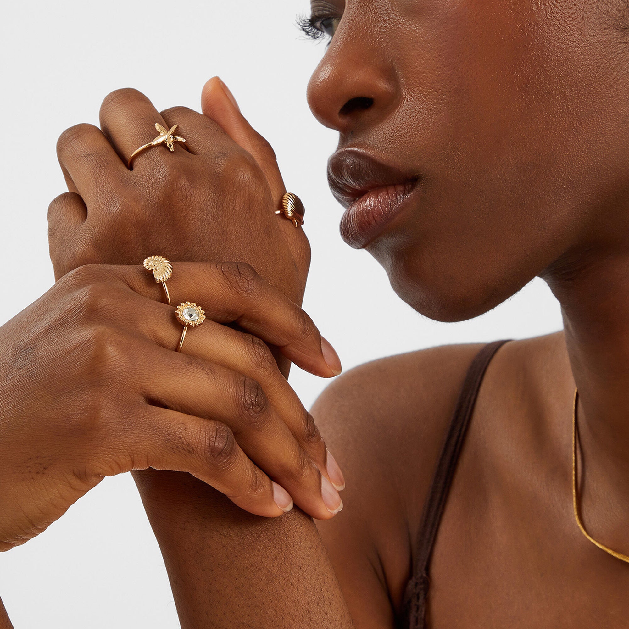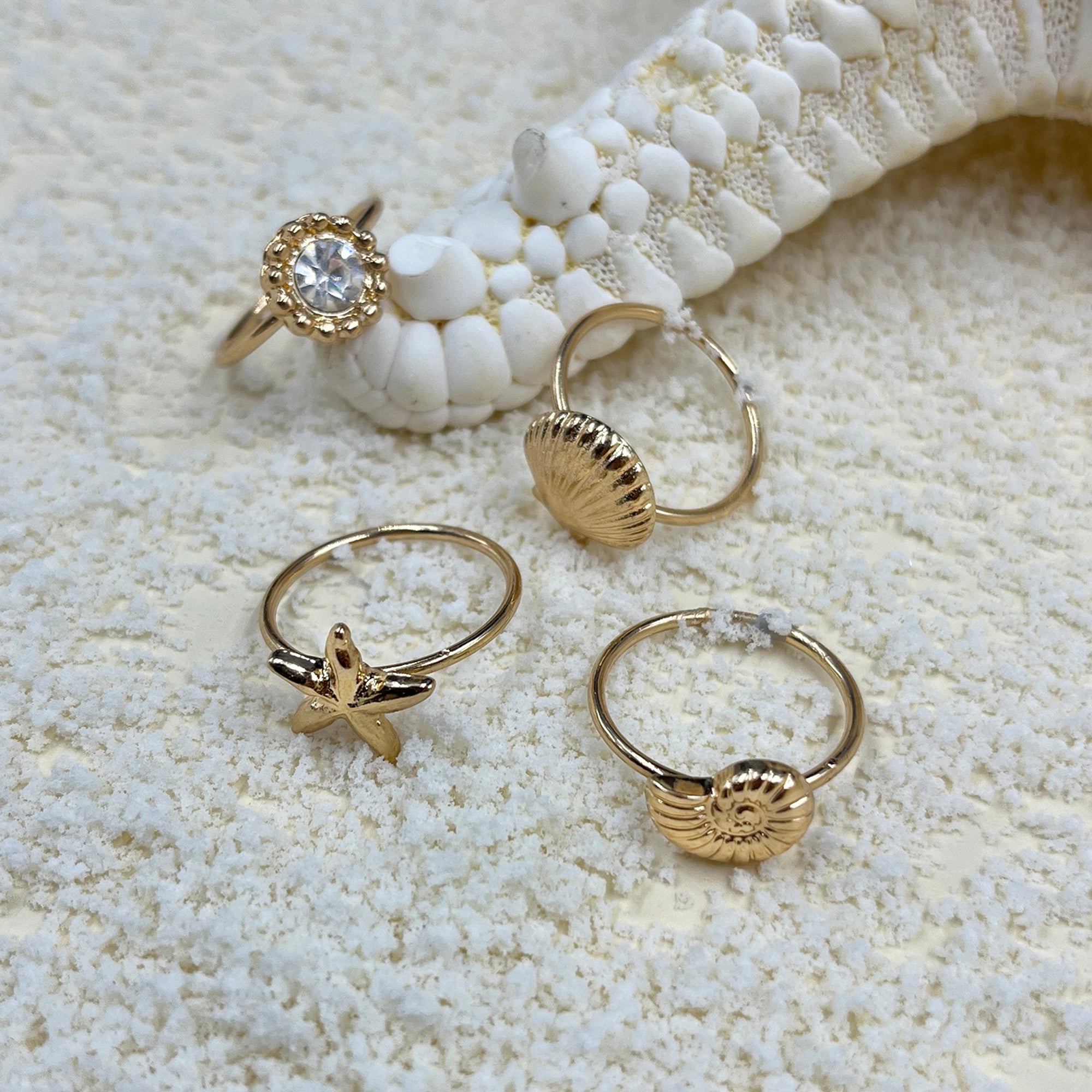 Dipped in gold, this four pack of rings is perfect for your next island getaway. Sitting on a fine band, this set is decorated with starfish, shells, and sparkling gems. Gold