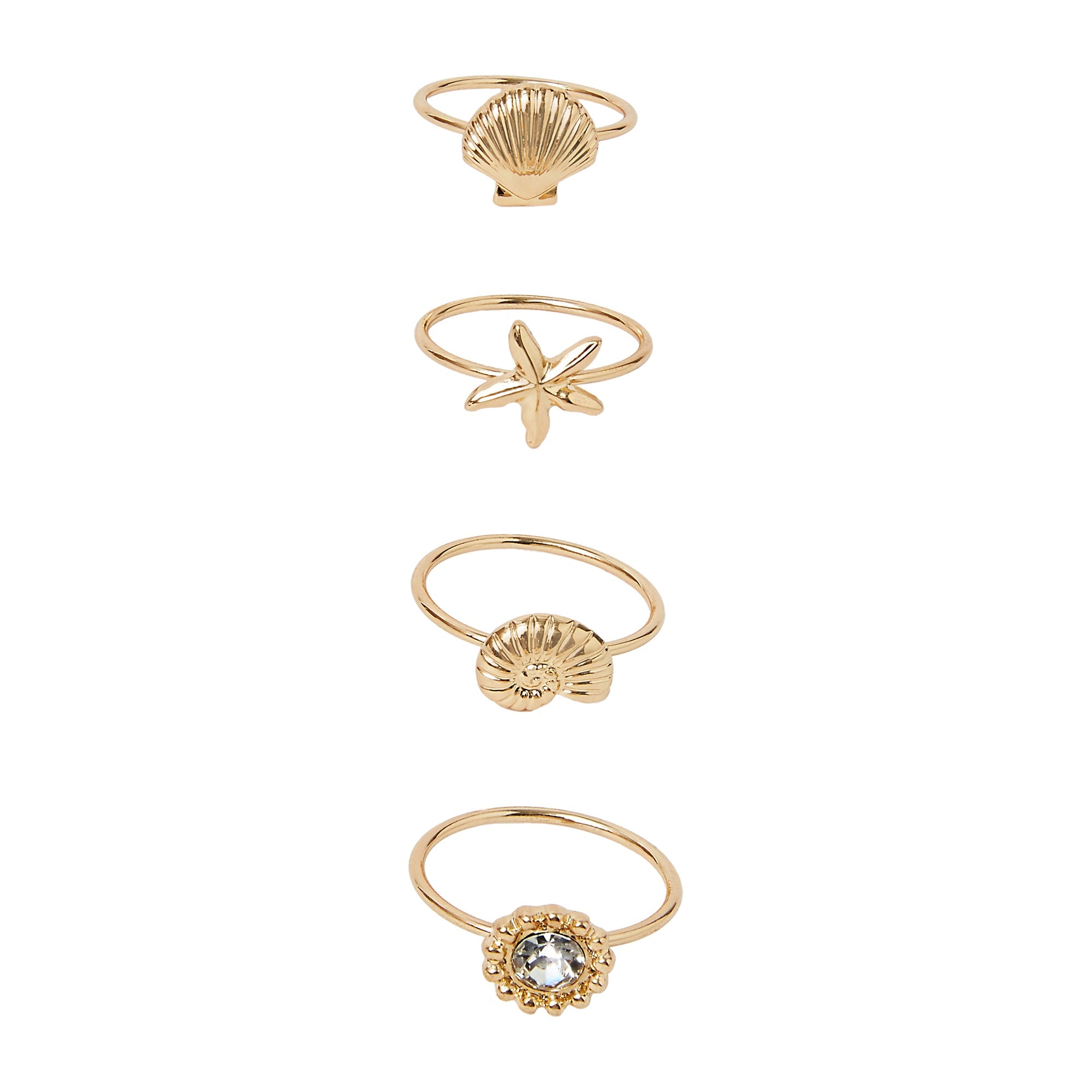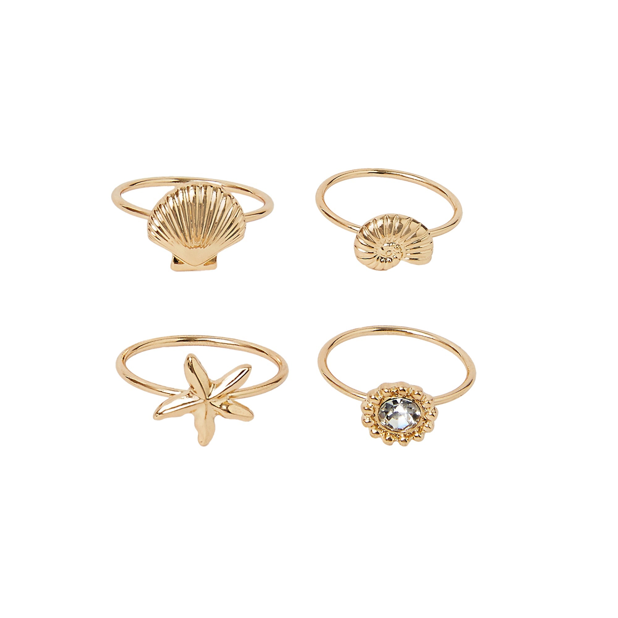 Dipped in gold, this four pack of rings is perfect for your next island getaway. Sitting on a fine band, this set is decorated with starfish, shells, and sparkling gems.