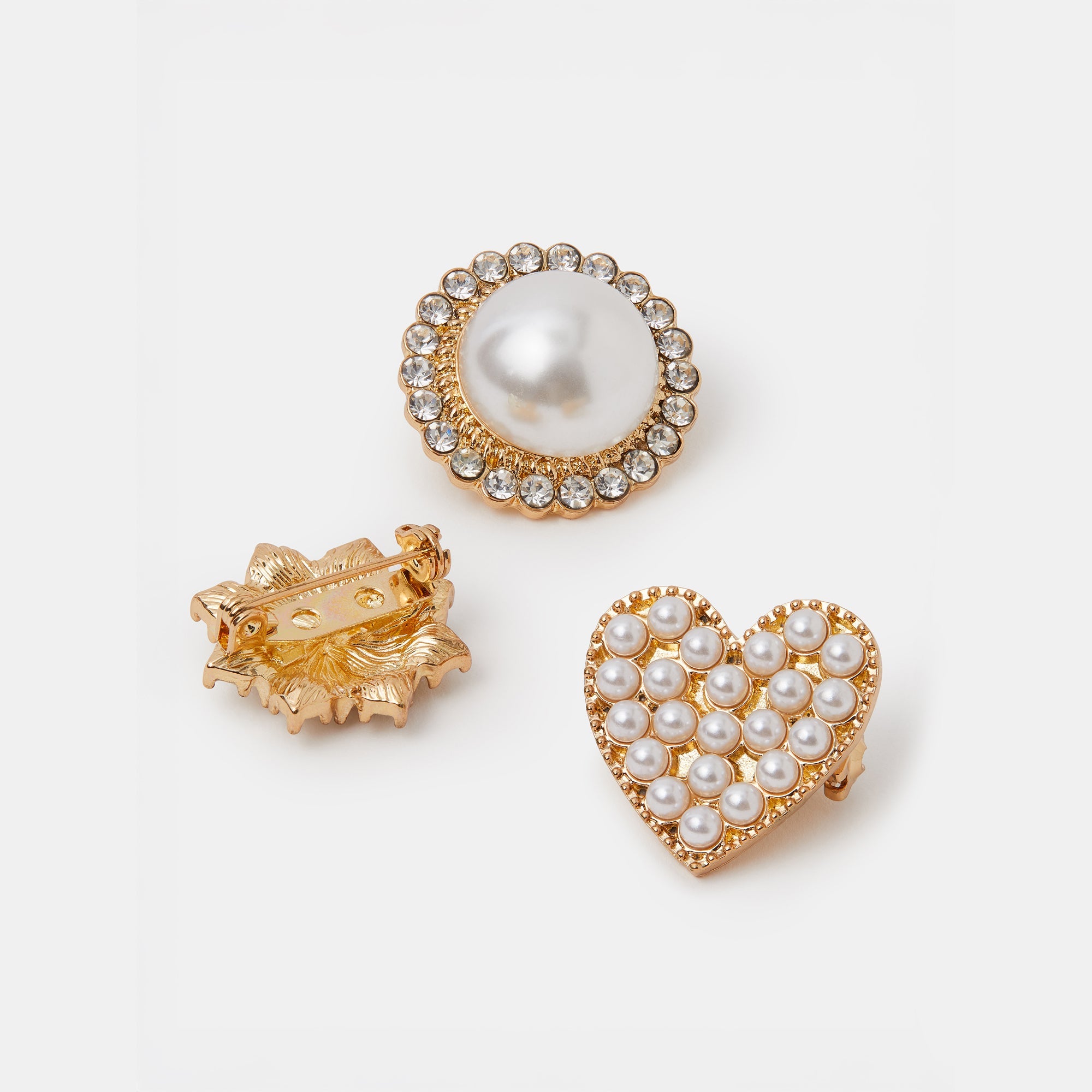 Decorated with diamantés and pearls, this set features round, heart and star brooches. Coat, dress or top, these classic pieces are sure to add a touch of sparkle to your 'fit. They do say the best things come in threes…